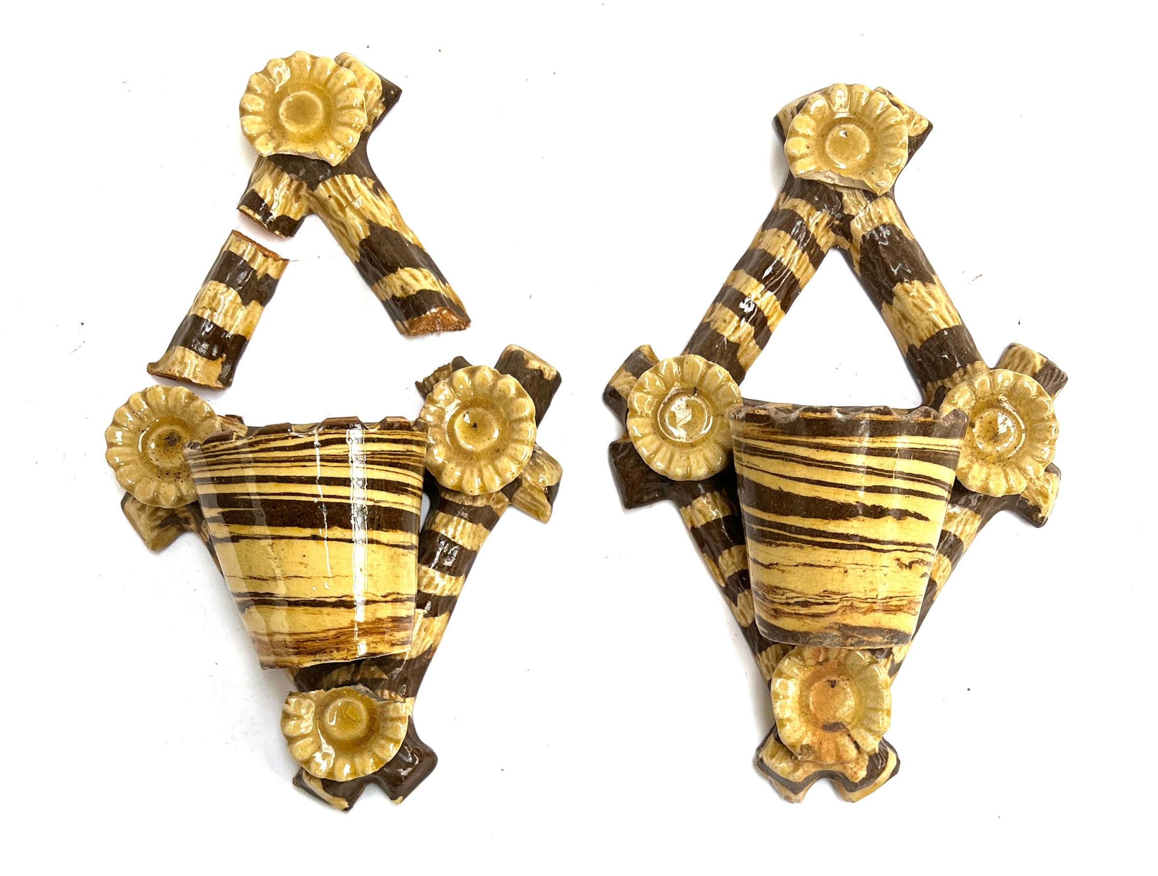A pair of unusual striped glaze wall planters (af, in need of repair), 30cmH