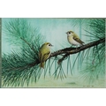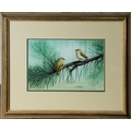 Two small birds on a fir tree branch