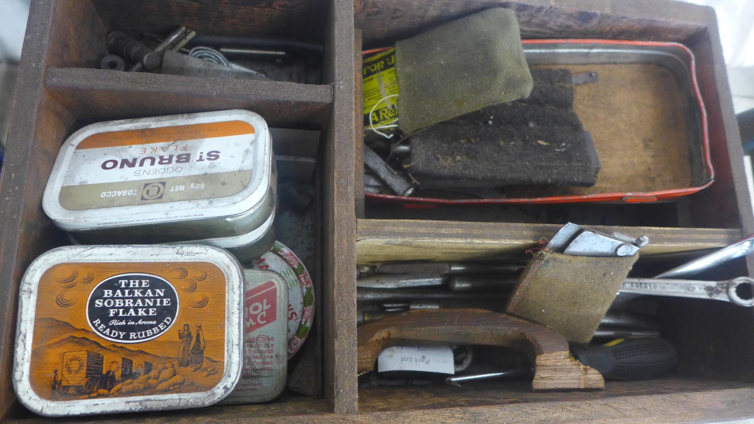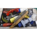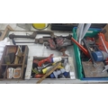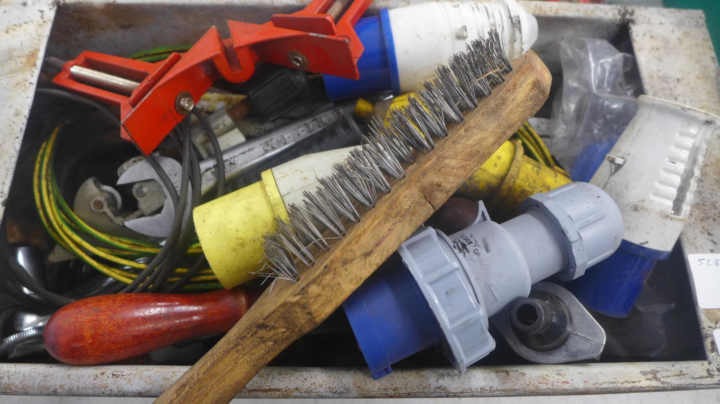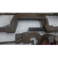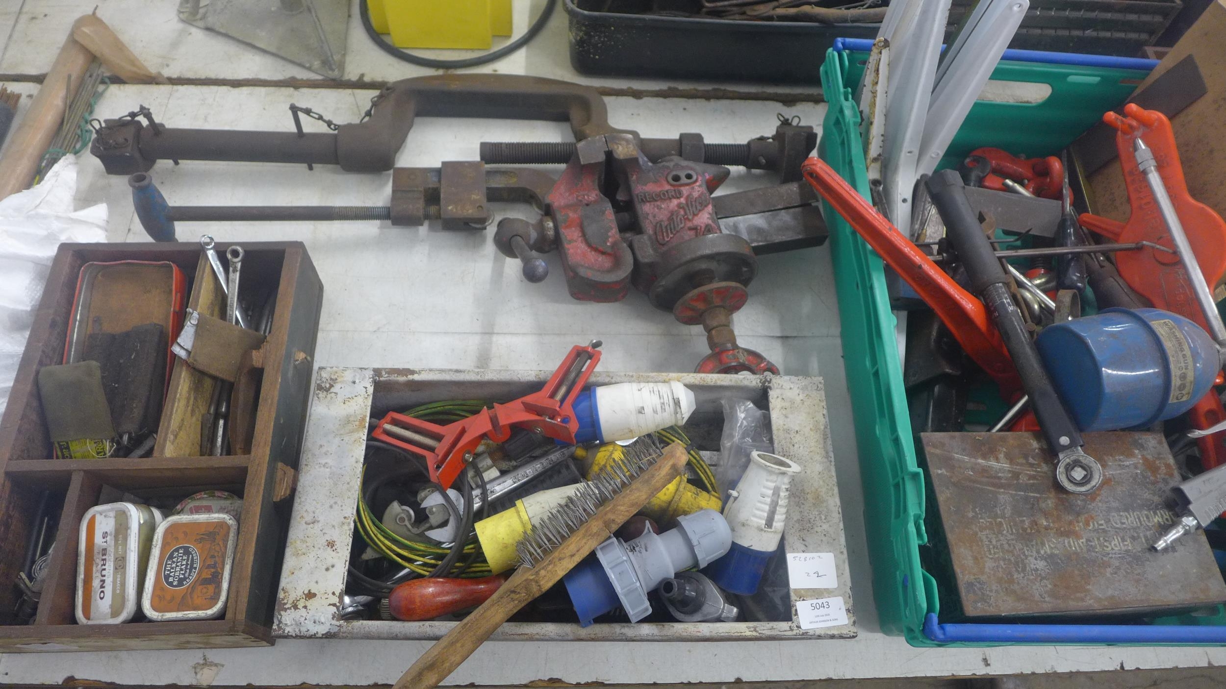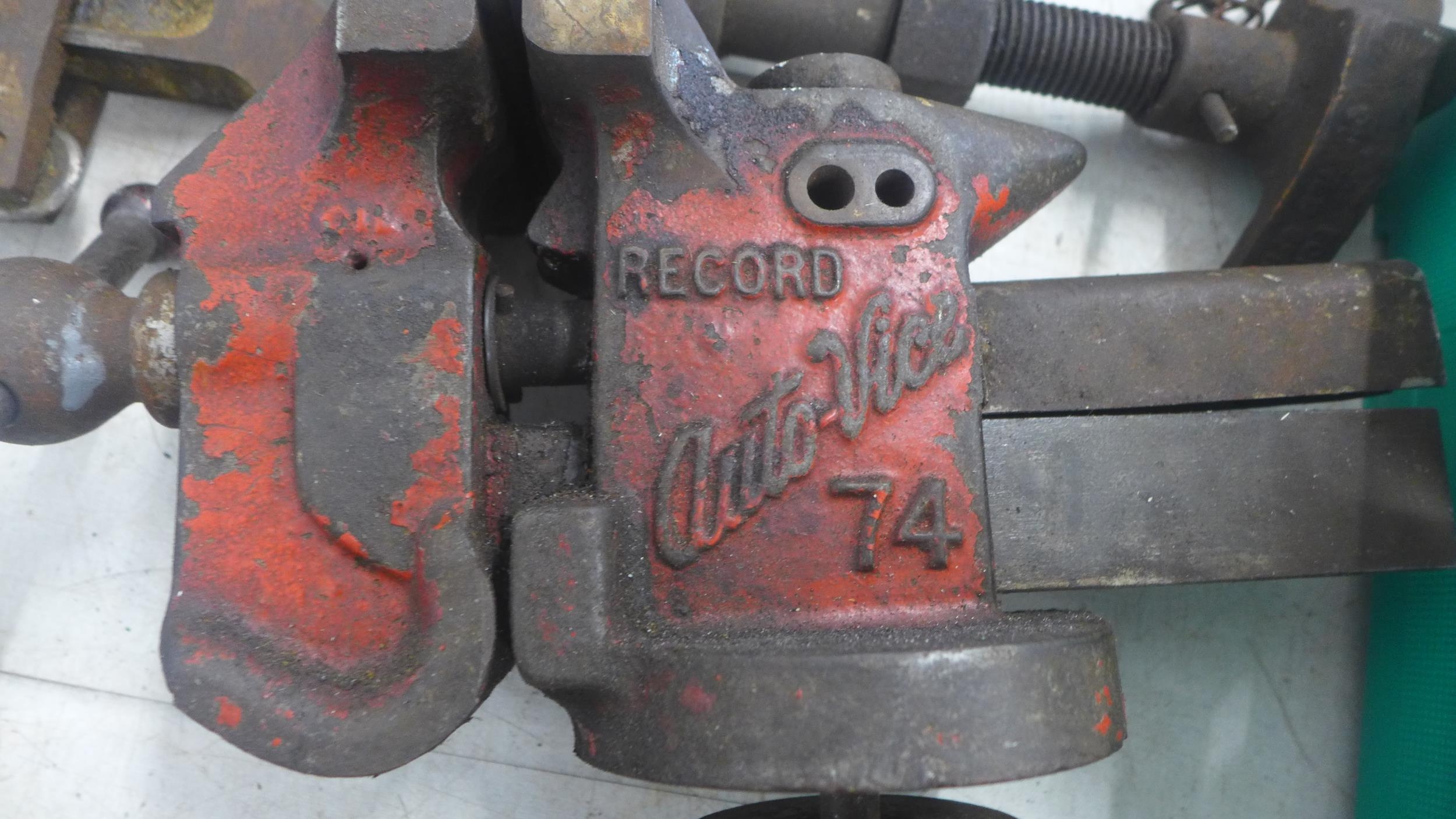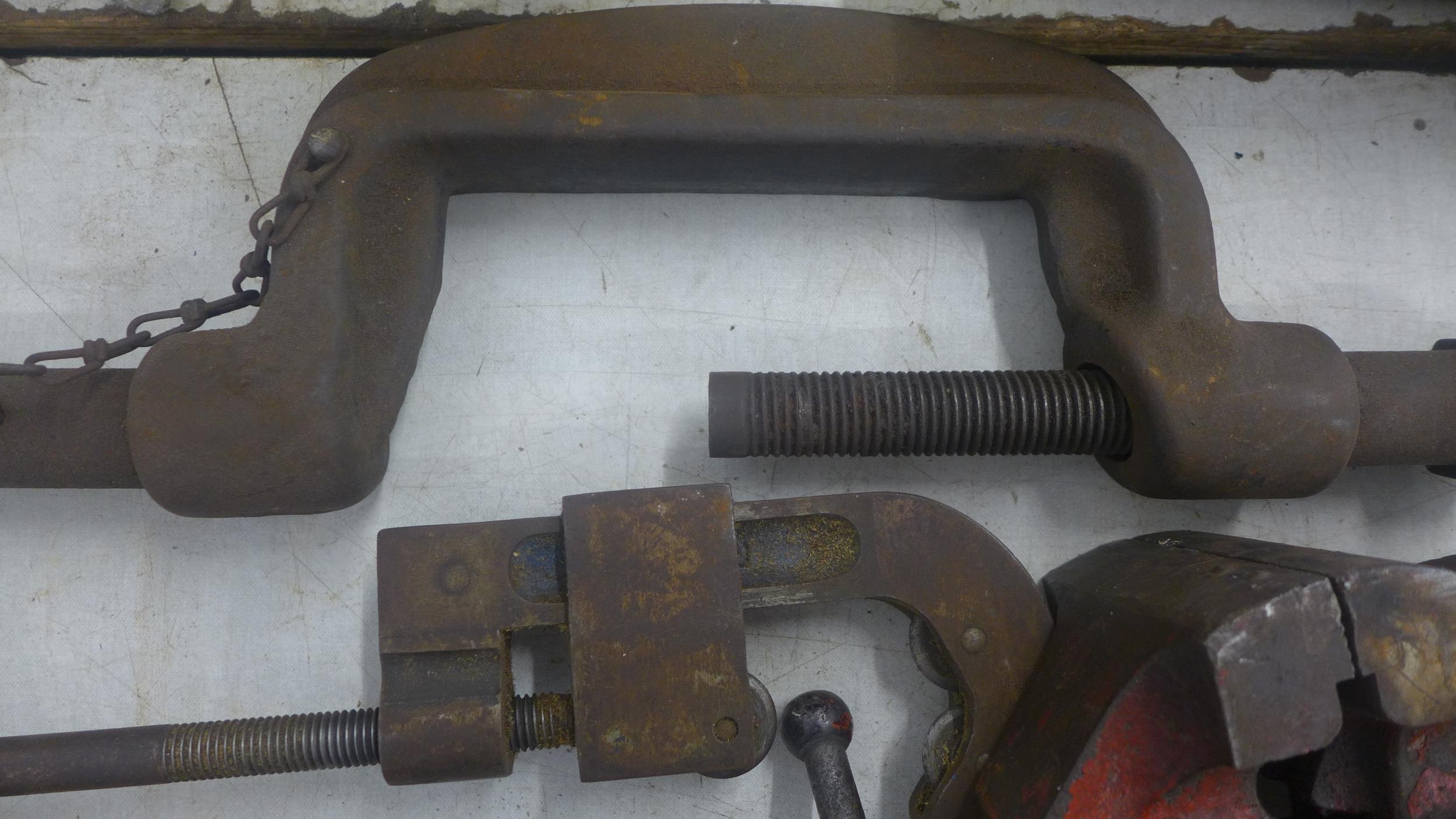 A quantity of assorted tools including a pipe cutter, a Record auto 74 bench vice, a large clamp, blue 240V plugs, etc.