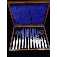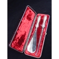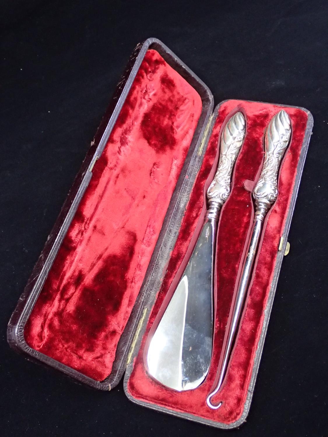 A silver mounted button hook and silver mounted shoe horn in a fitted box.