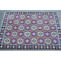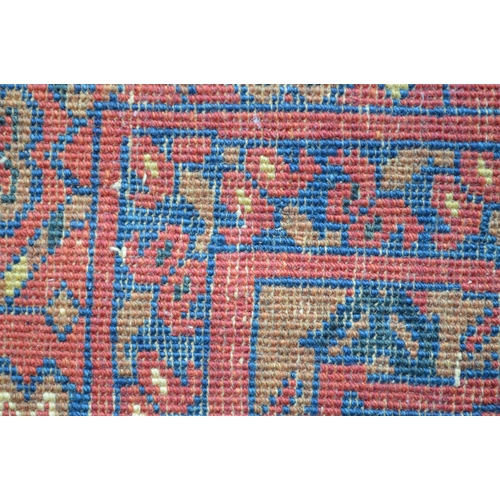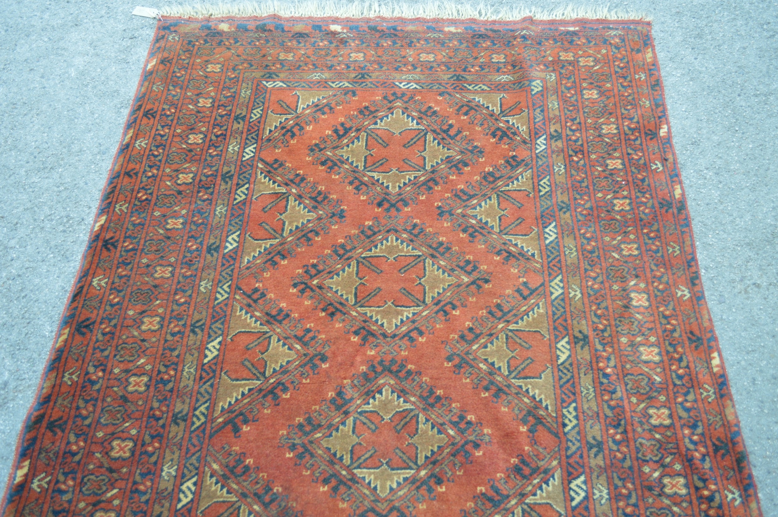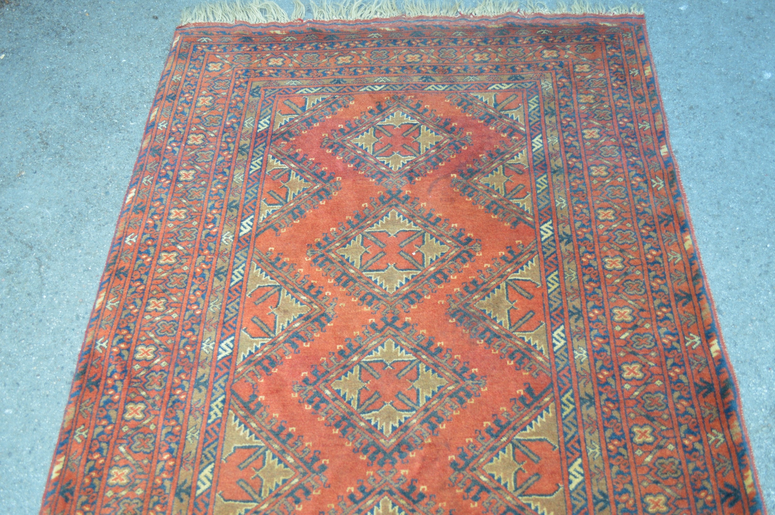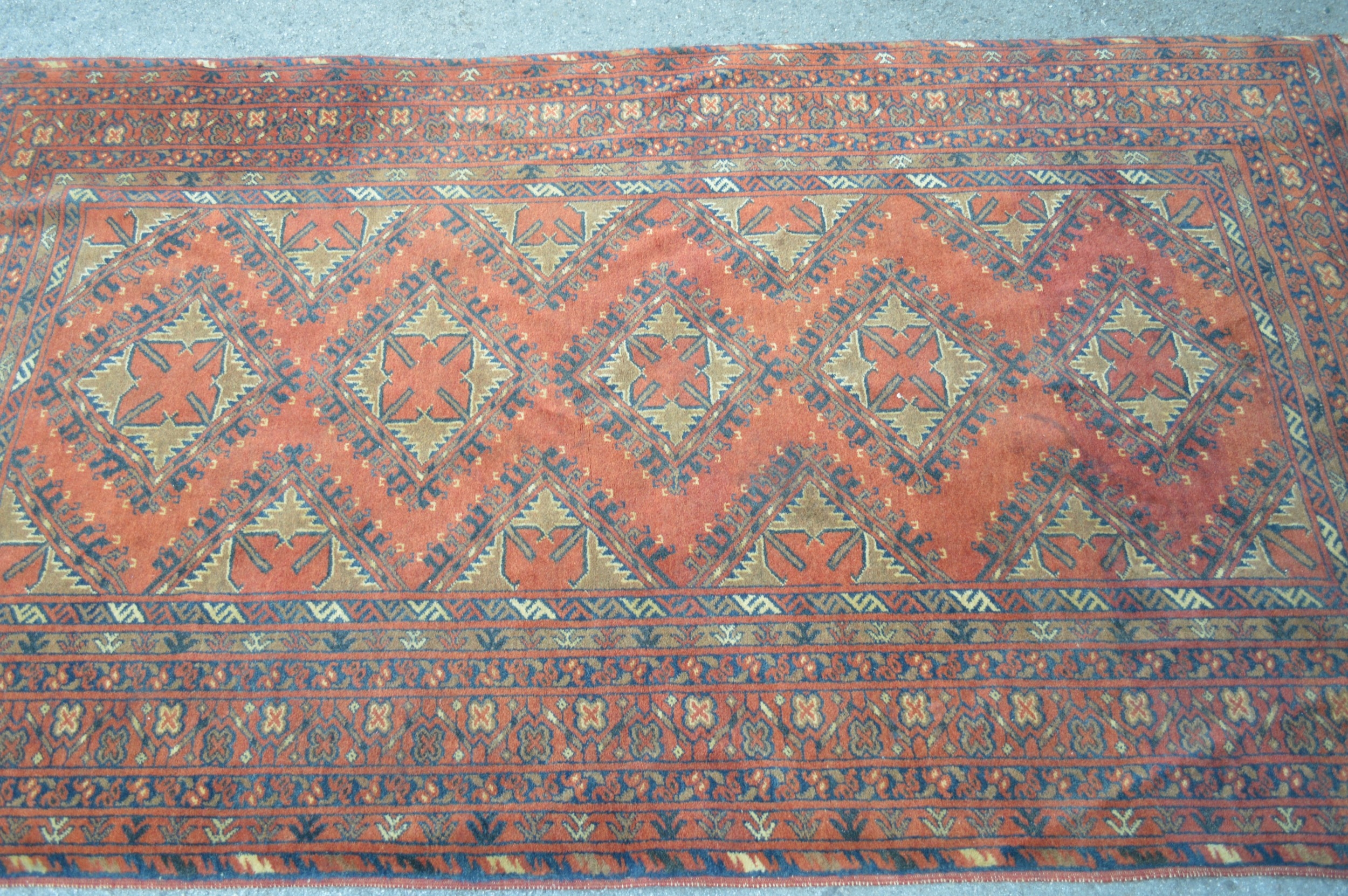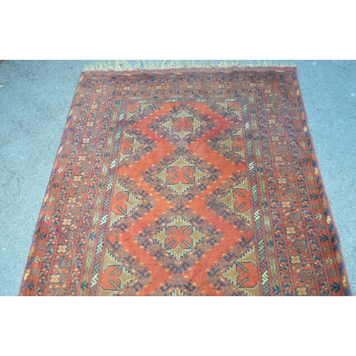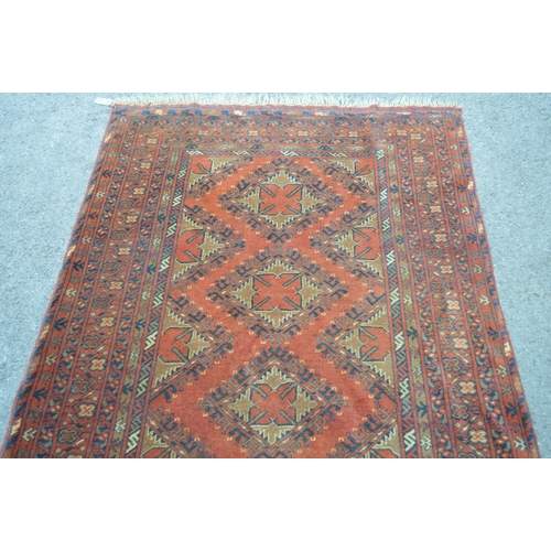 Belouch rug of five centre medallions with multiple borders on a wine ground, 220 x 130cm
