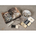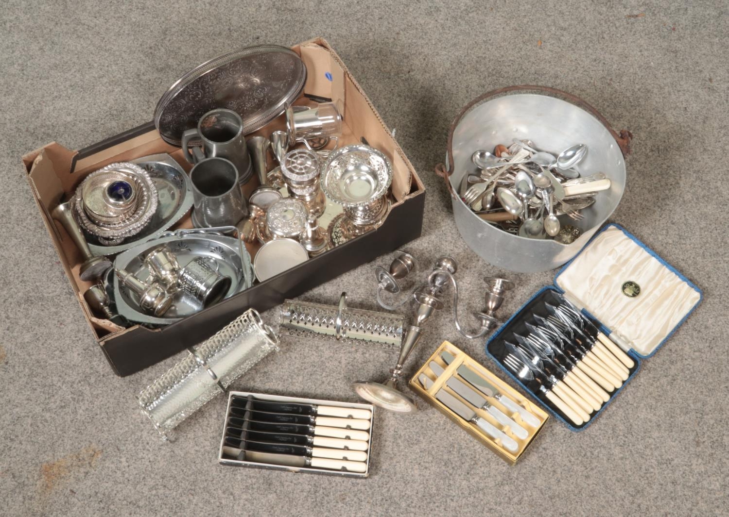 A box of metalwares, mainly silver plate. Includes jam pan, pewter tankards, loose and boxed cutlery, trays, candelabra etc.