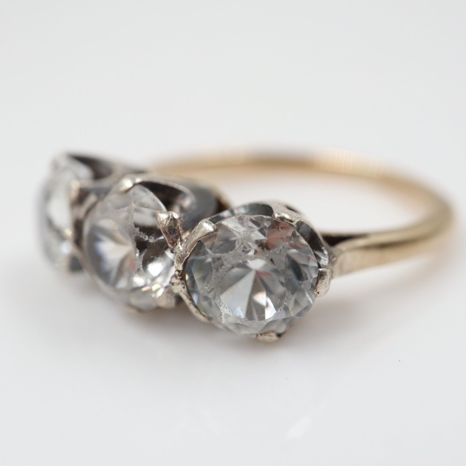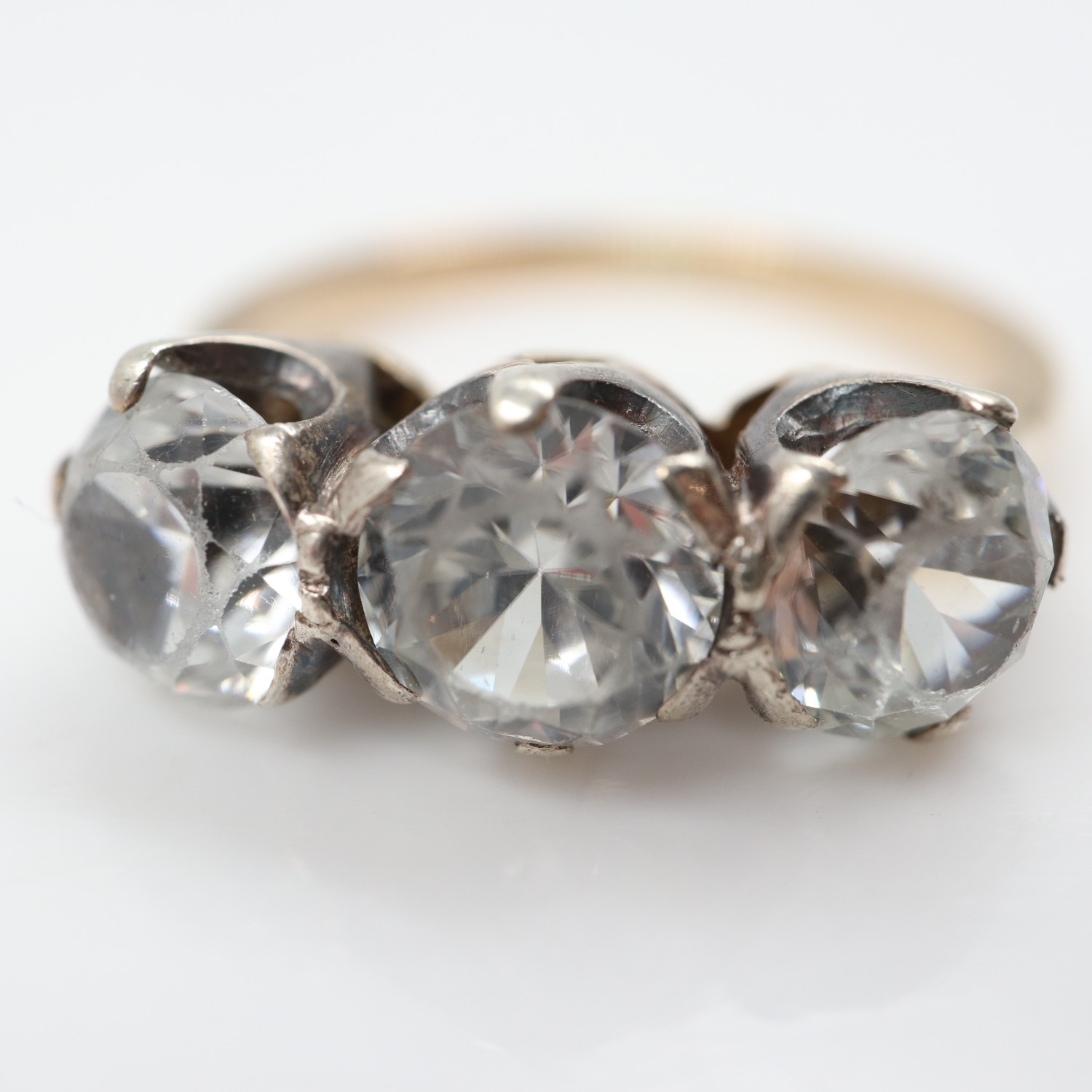 9ct gold trilogy ring set with large clear topaz, 4.0g, size M/N. UK P&P Group 0 (£7+VAT for the first lot and £1+VAT for subsequent lots)