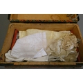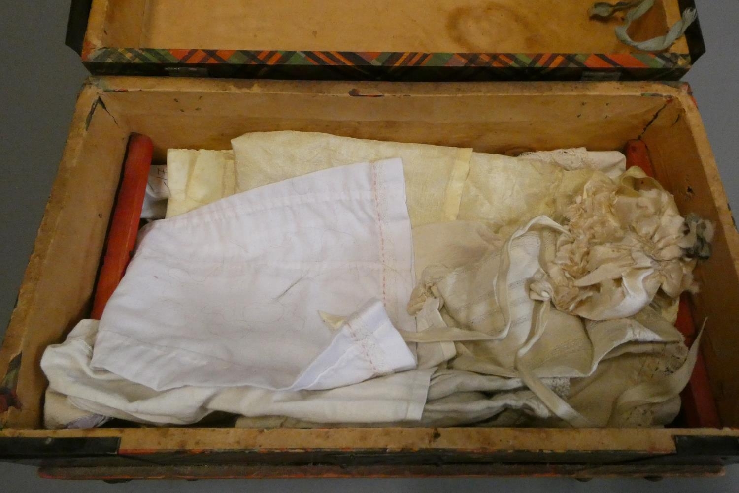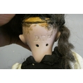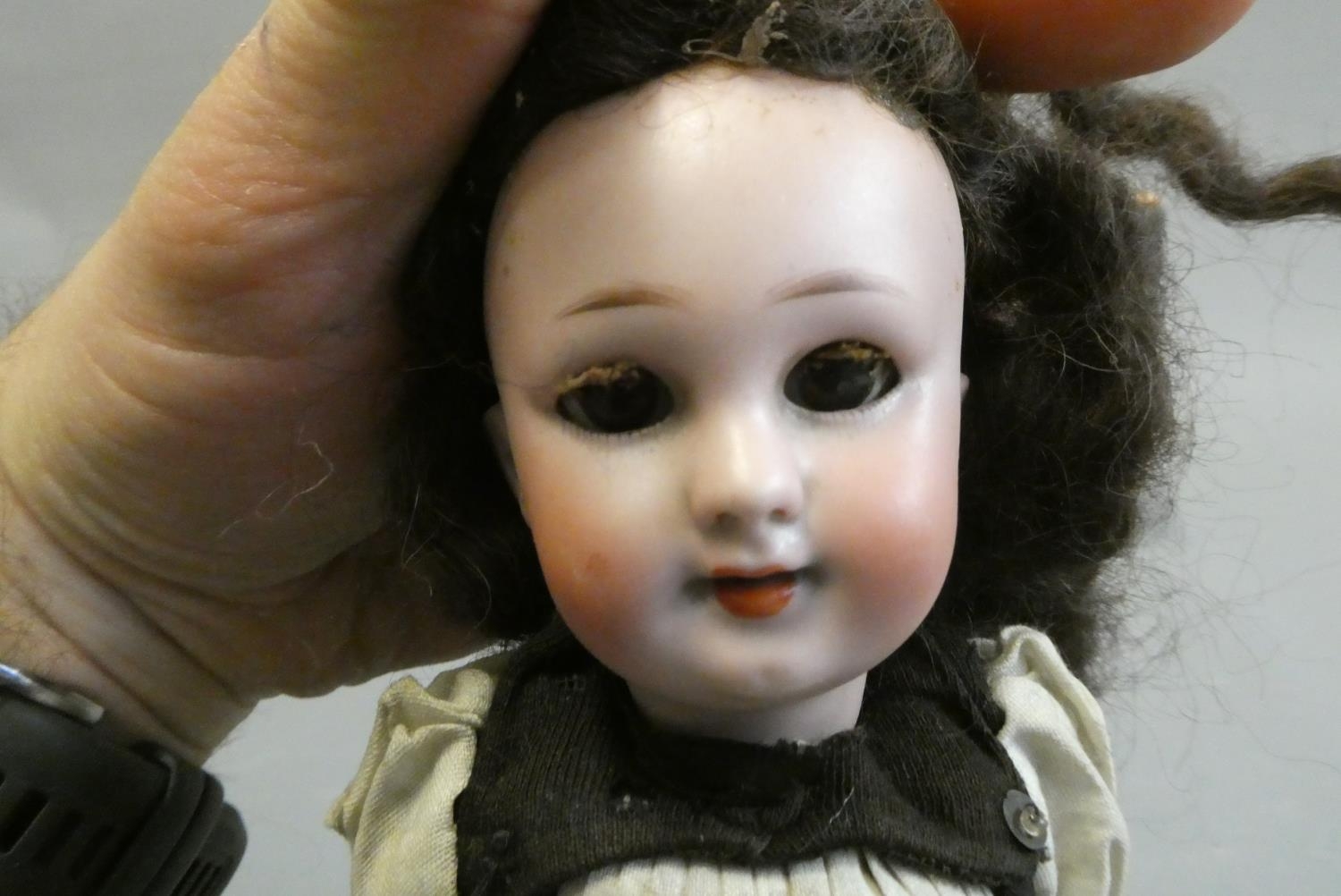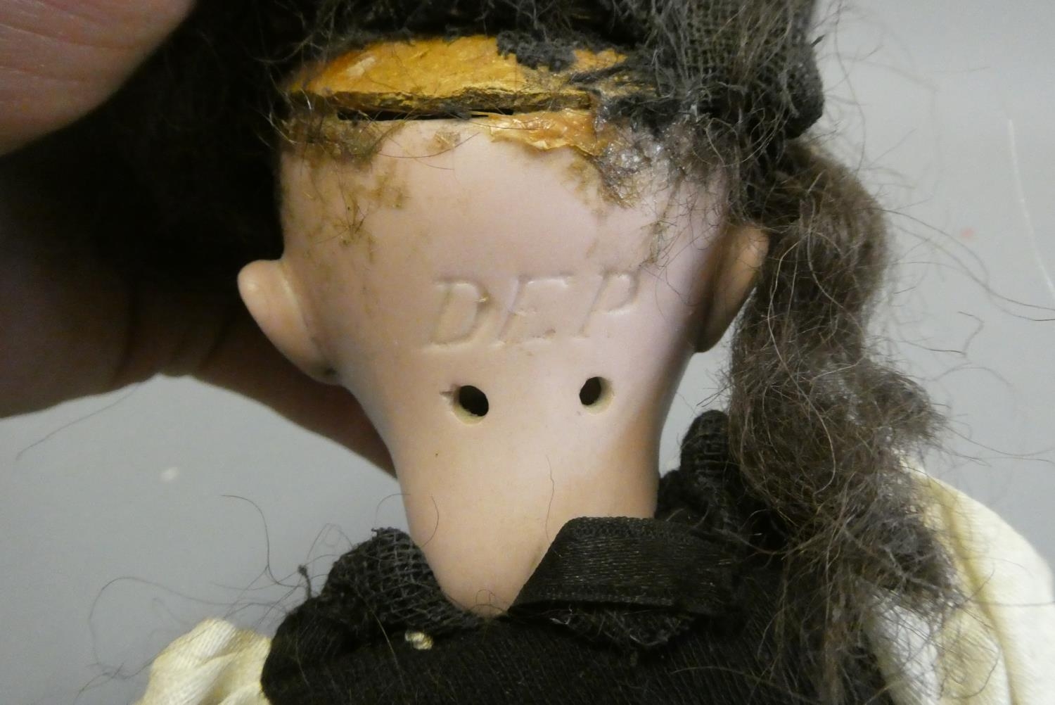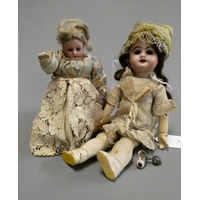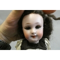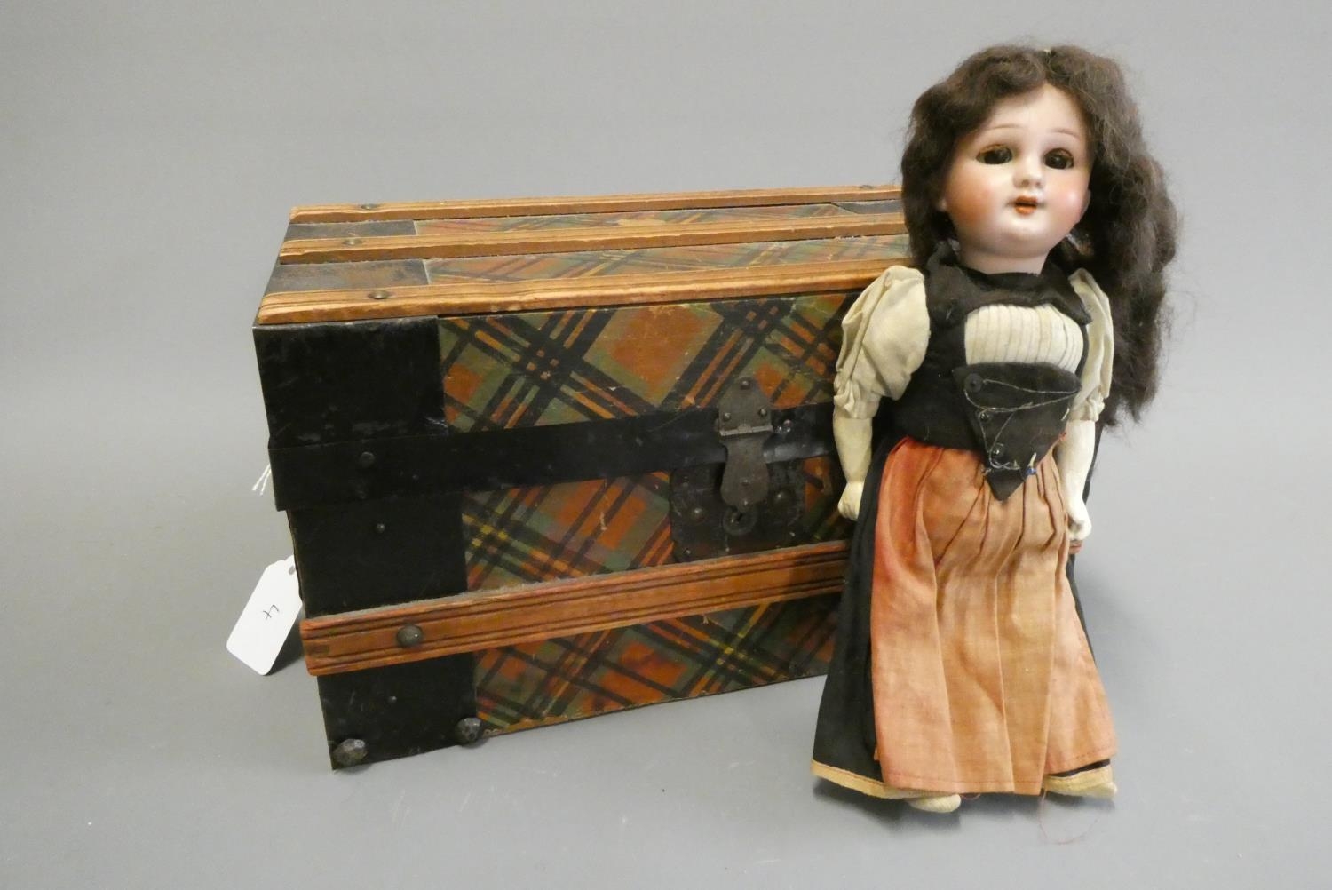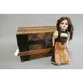 A bisque socket head doll, with brown glass sleeping eyes, open mouth, teeth, pierced ears, composition body with bent arms and straight legs, spare doll clothes and trunk, doll marked DEP 1, 9 1/4" long, trunk 12" wide
