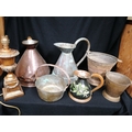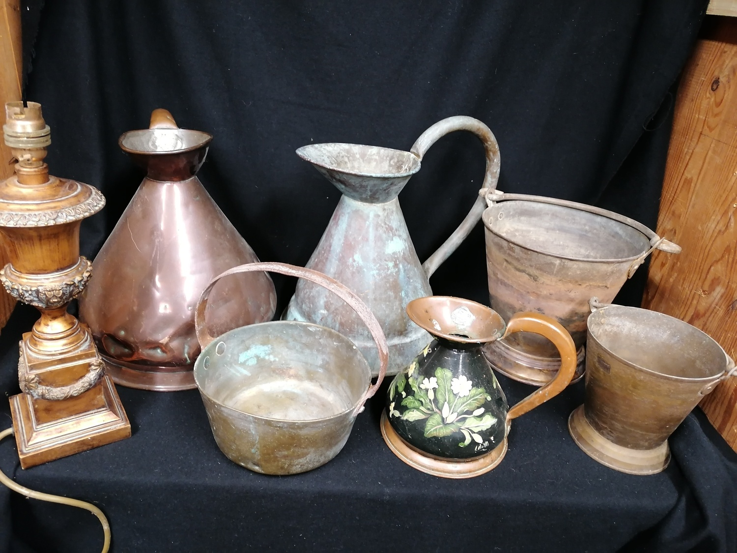 Qty of metalware inc 3 harvest copper jugs (1 gallon & 1 handpainted) & 2 small brass buckets