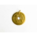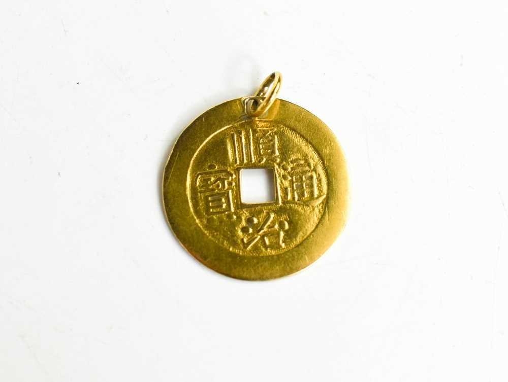 A Japanese gold coin pendant, testing as at least 18ct gold, bearing four calligraphy marks to one side, 3.61g.