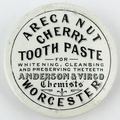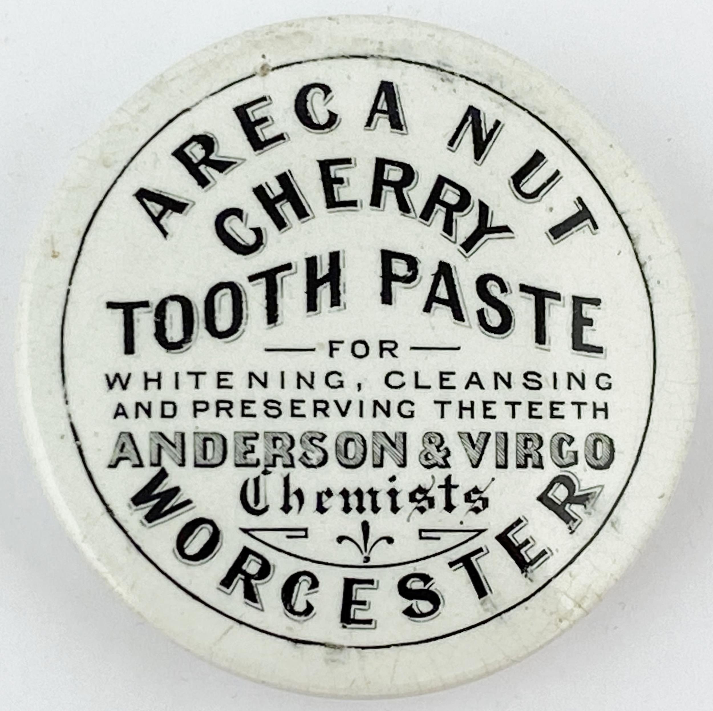 WORCESTER CHERRY TOOTH PASTE POT LID. 3ins diam. Black transfer. ARECA NUT/ ANDERSON & VIRGO. Pin hole above letter E on Areca