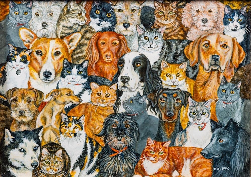 Ditz (Contemporary) 'Rain' - Cats and Dogs Oil on board 12.5 x 17cm Signed lower right and dated 1990 Provenance: Royal Academy Summer Exhibition, 1990