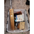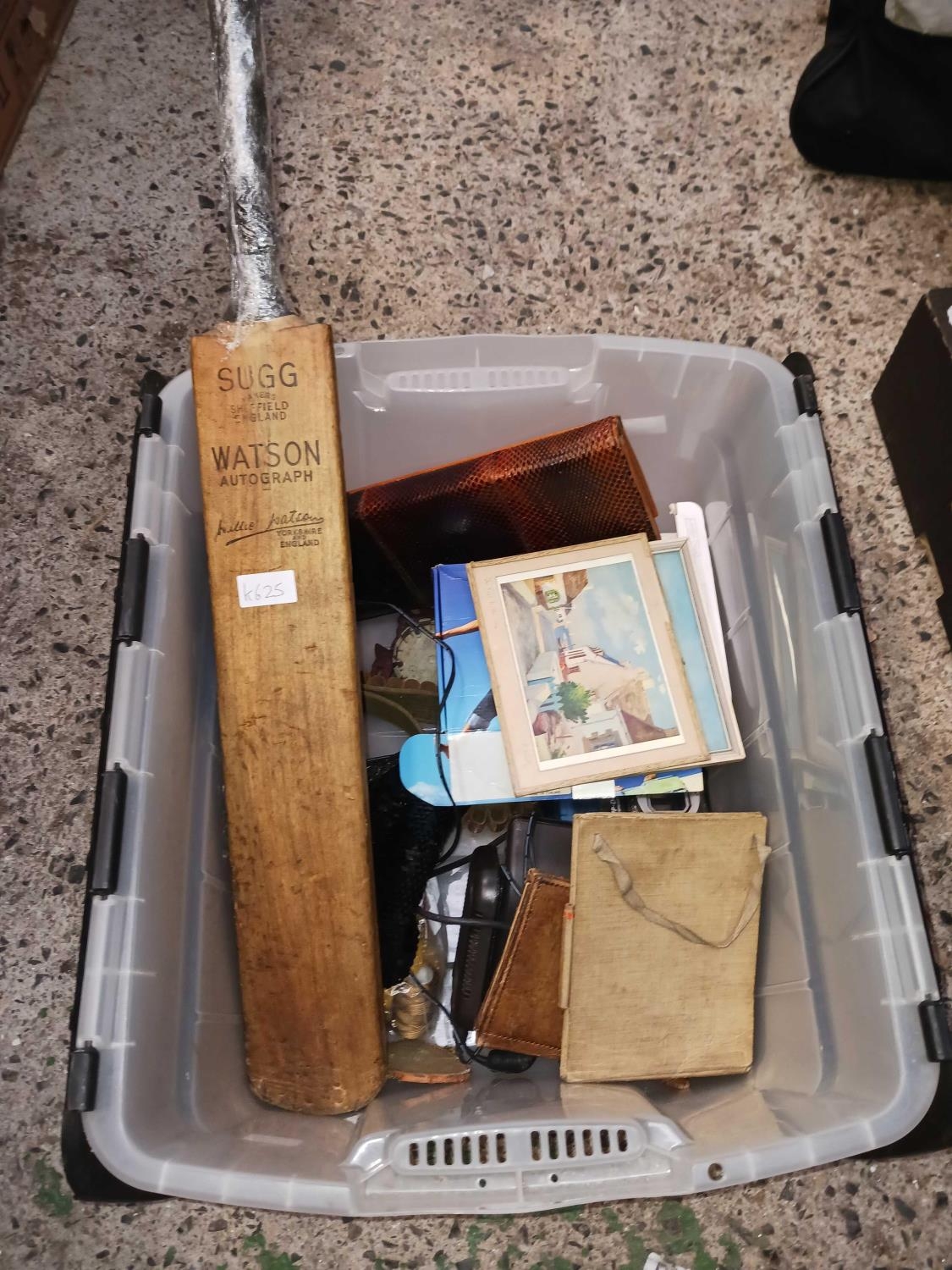 CARTON WITH A WATSON AUTOGRAPH CRICKET BAT, AN UNDERWATER CAMERA CASE, & OTHER BRIC-A-BRAC