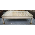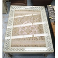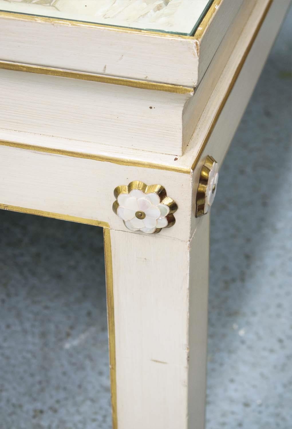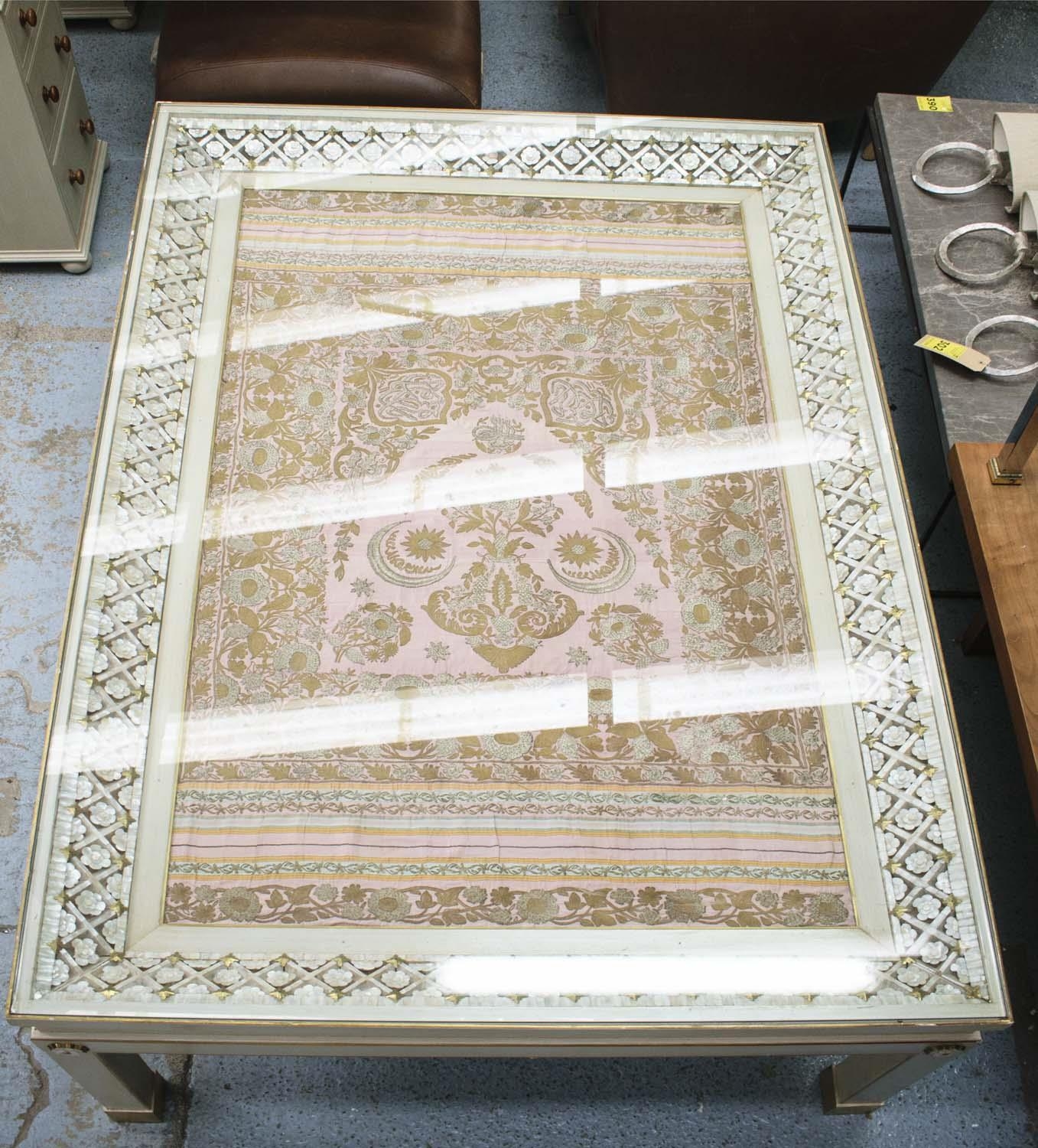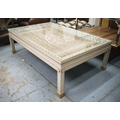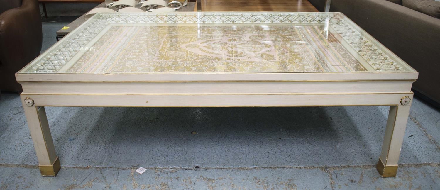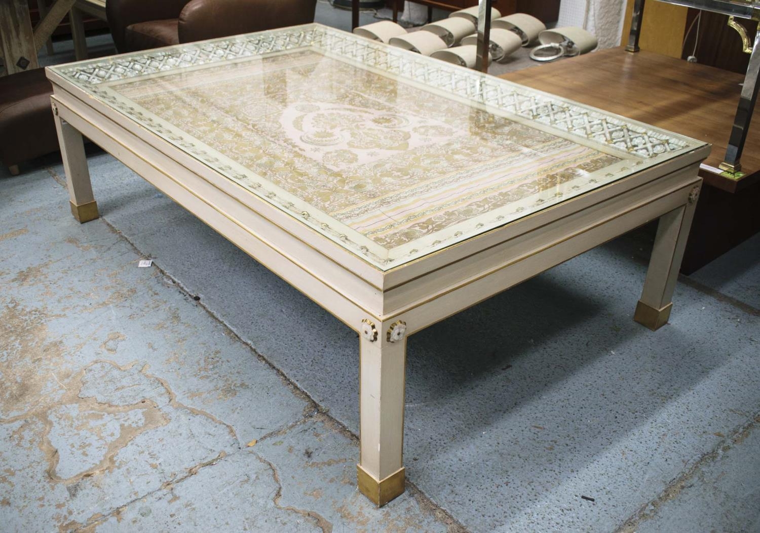 LOW CENTRE TABLE, 61cm H x 188cm W x 121cm D, painted, gilt heightened, brass and mother of pearl with Persian embroidered textile lined top under glass.