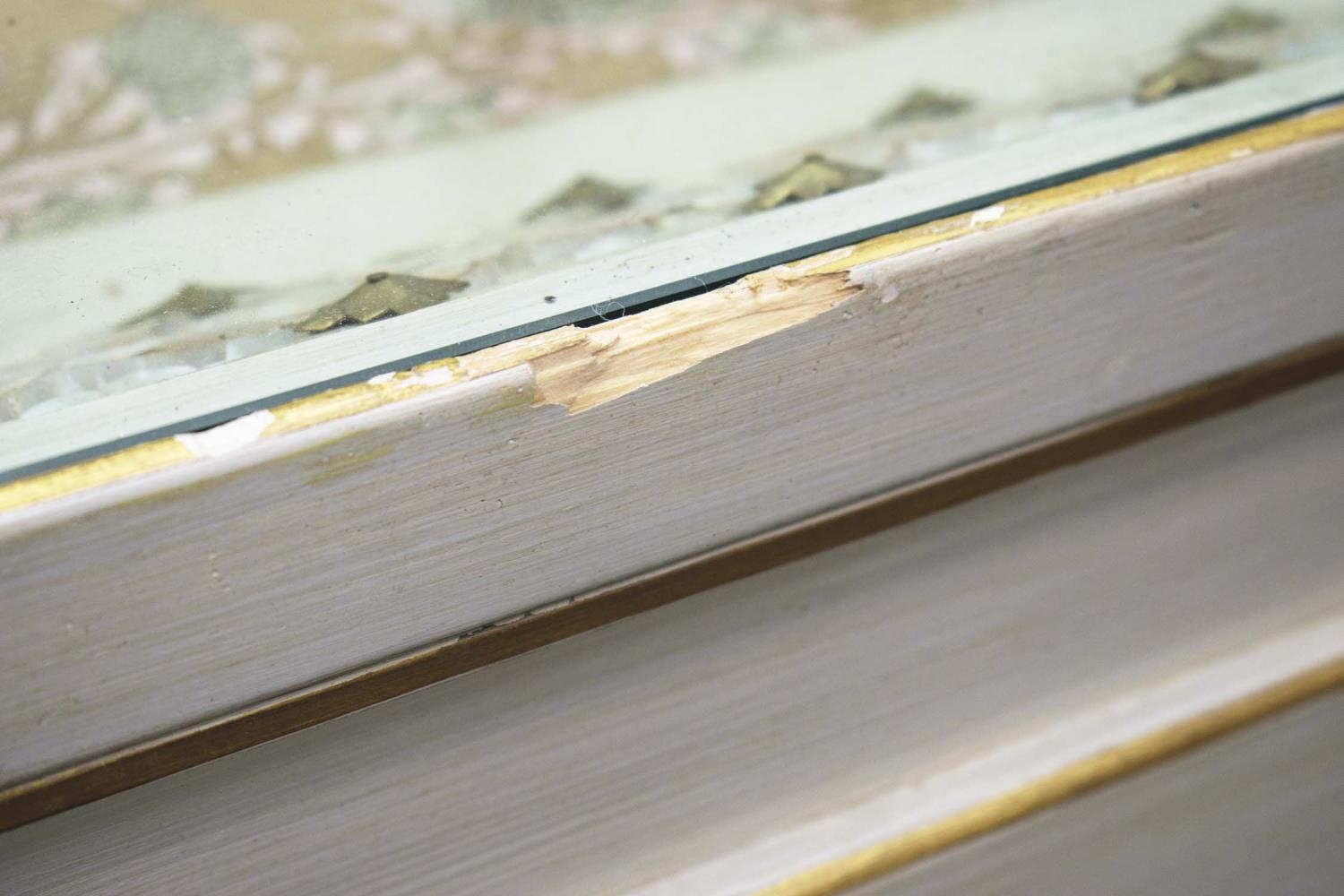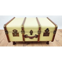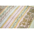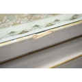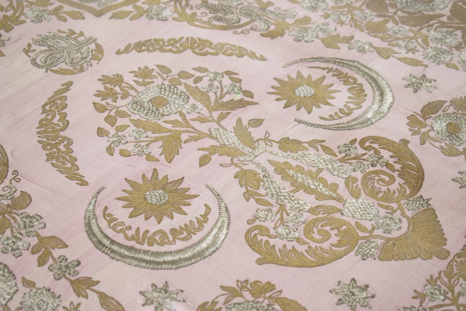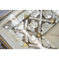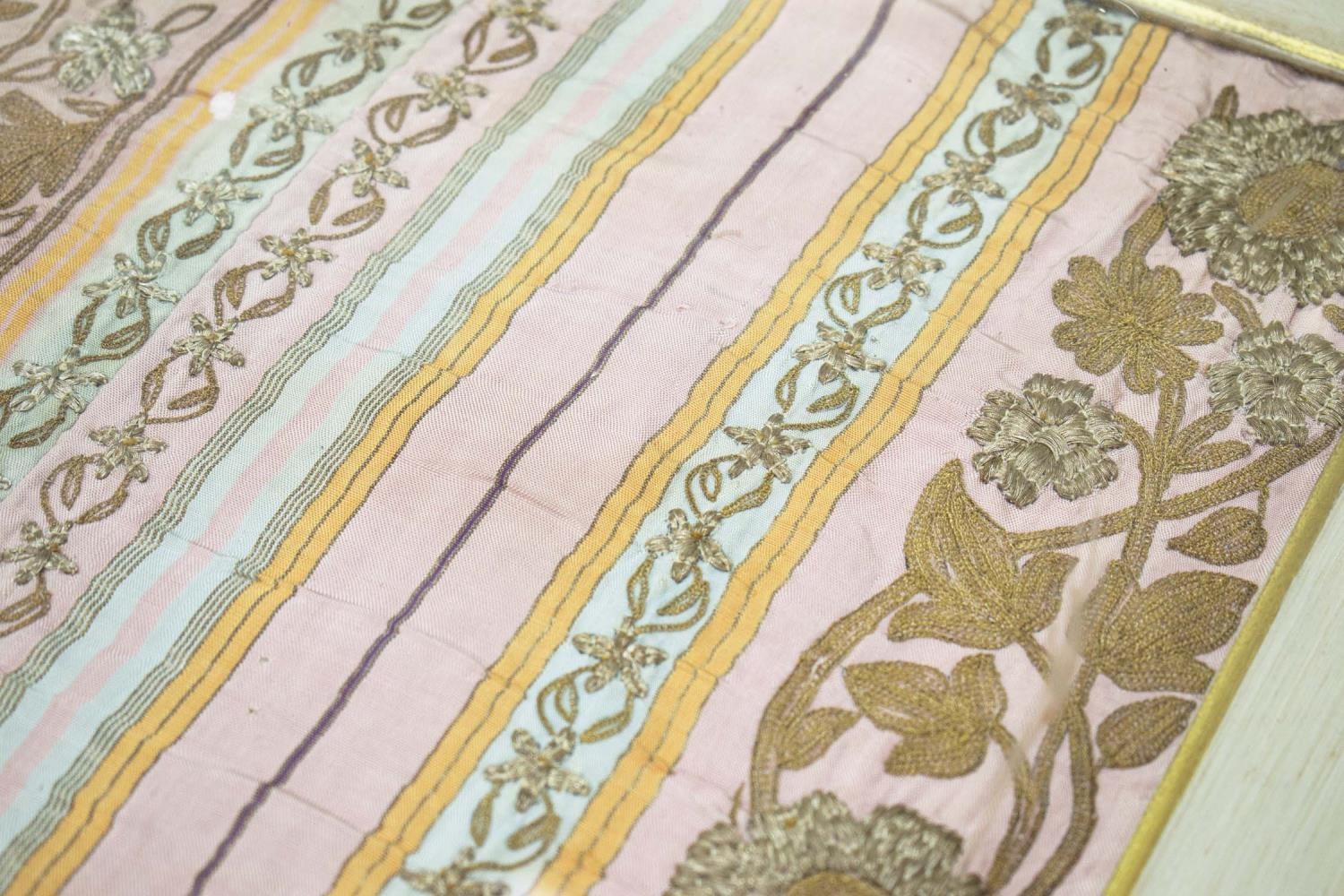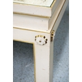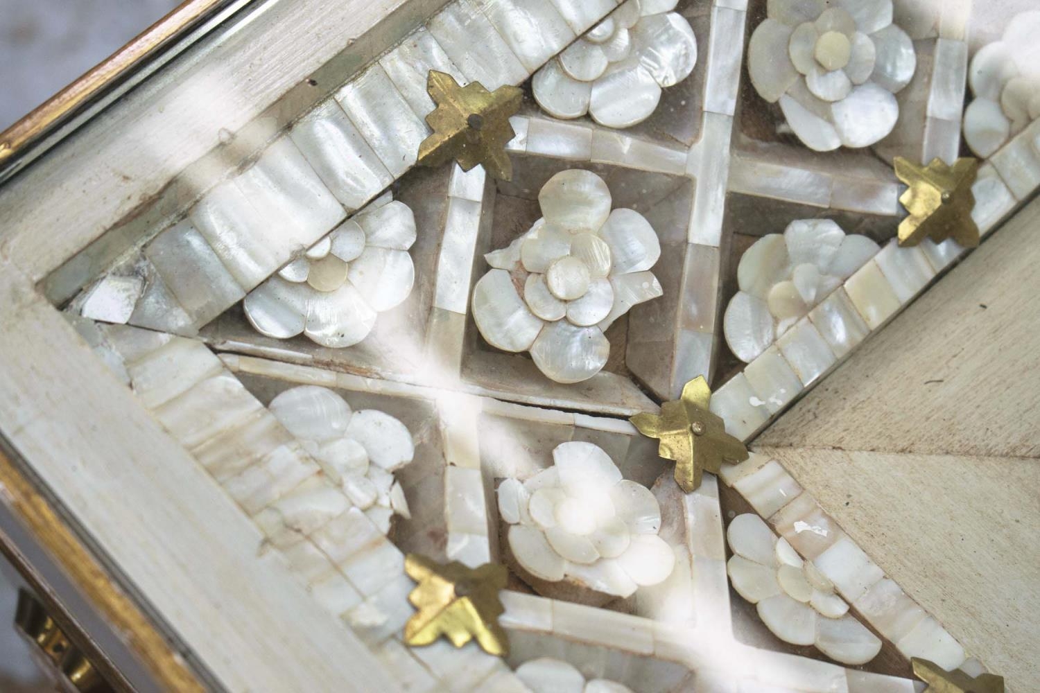 LOW CENTRE TABLE, 61cm H x 188cm W x 121cm D, painted, gilt heightened, brass and mother of pearl with Persian embroidered textile lined top under glass.