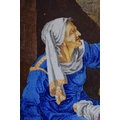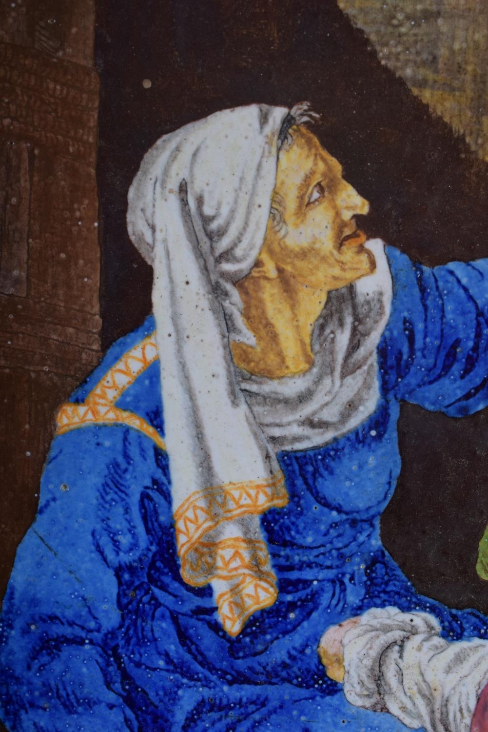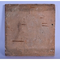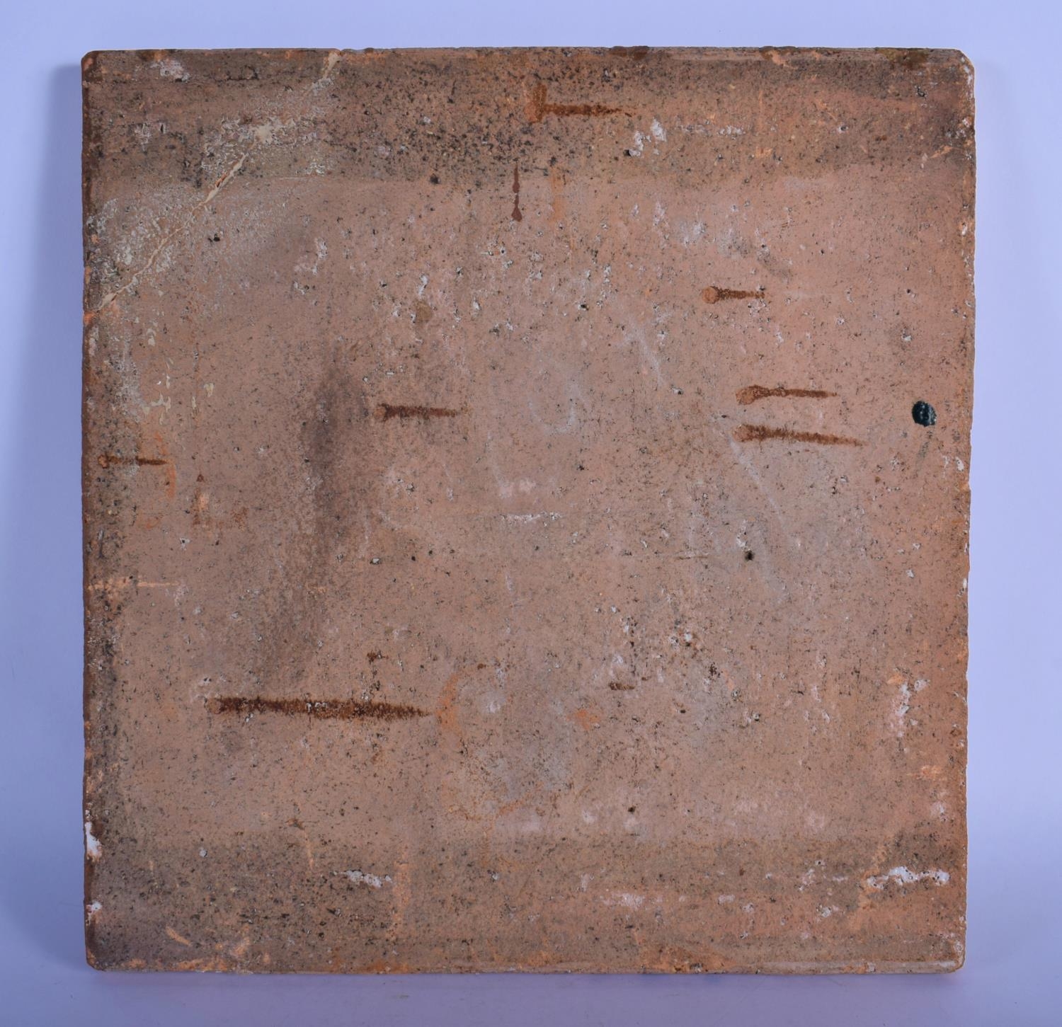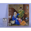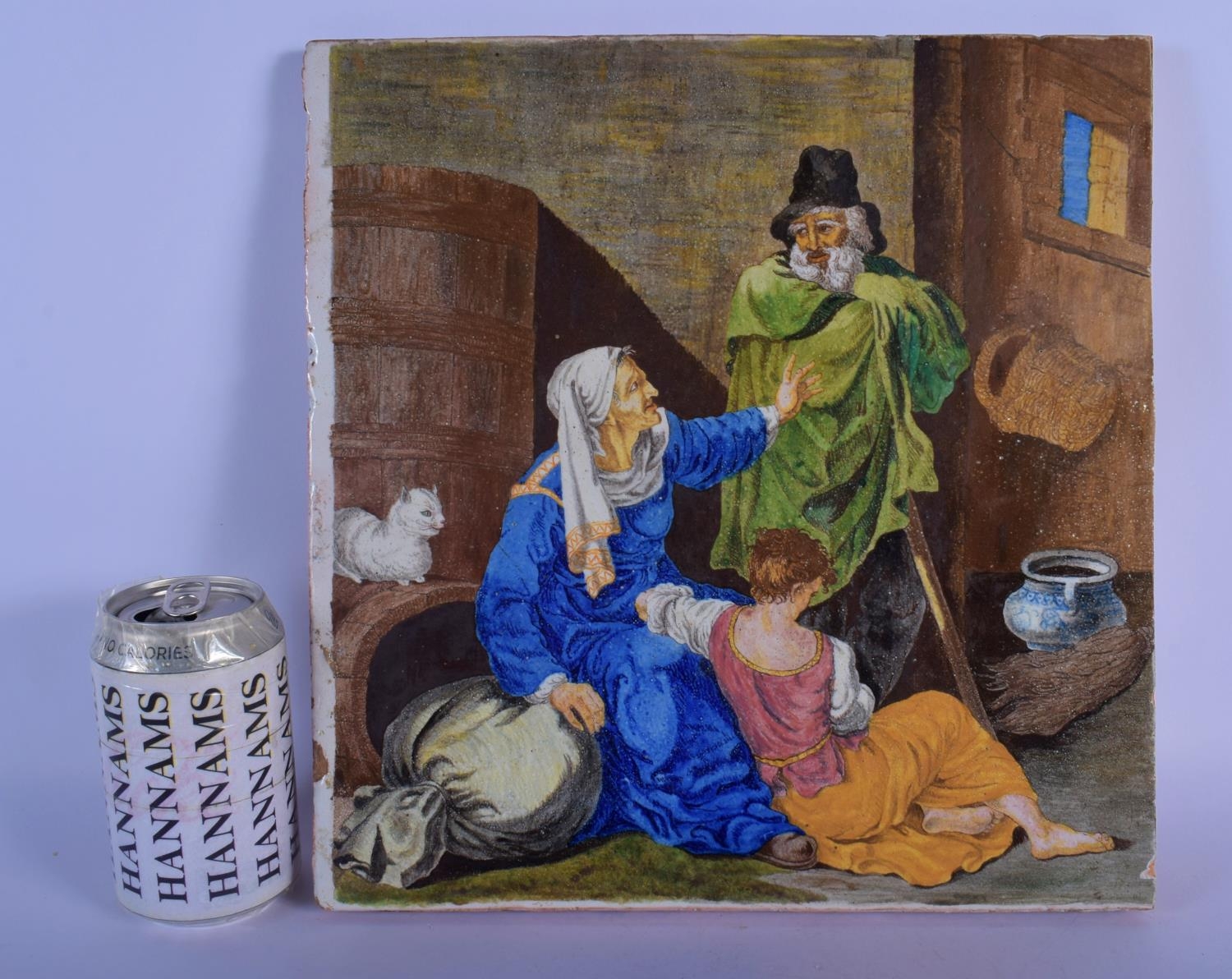 A LARGE 19TH CENTURY FRENCH FAIENCE ENAMELLED POTTERY TILE depicting figures within an interior. 30 cm square.