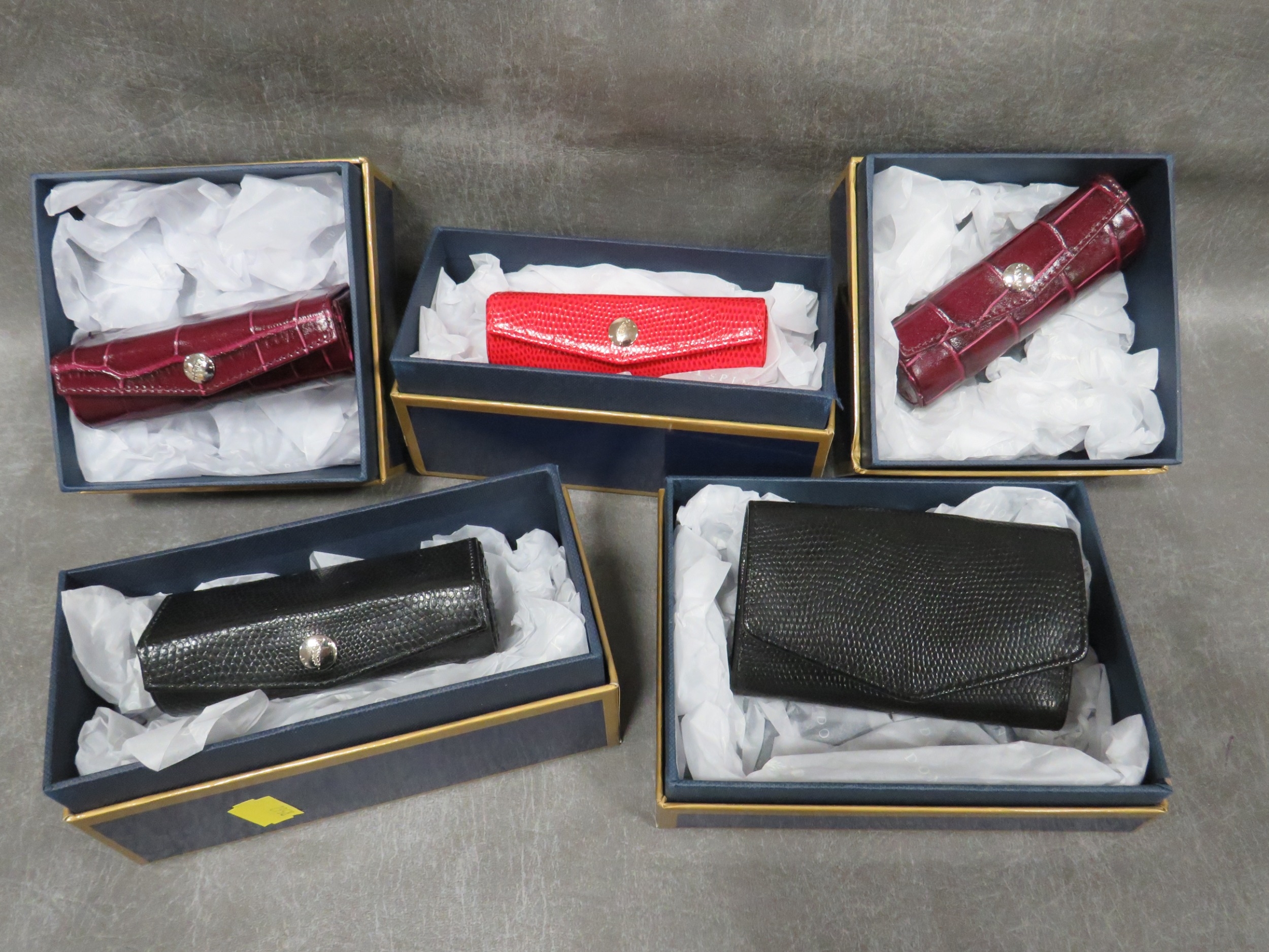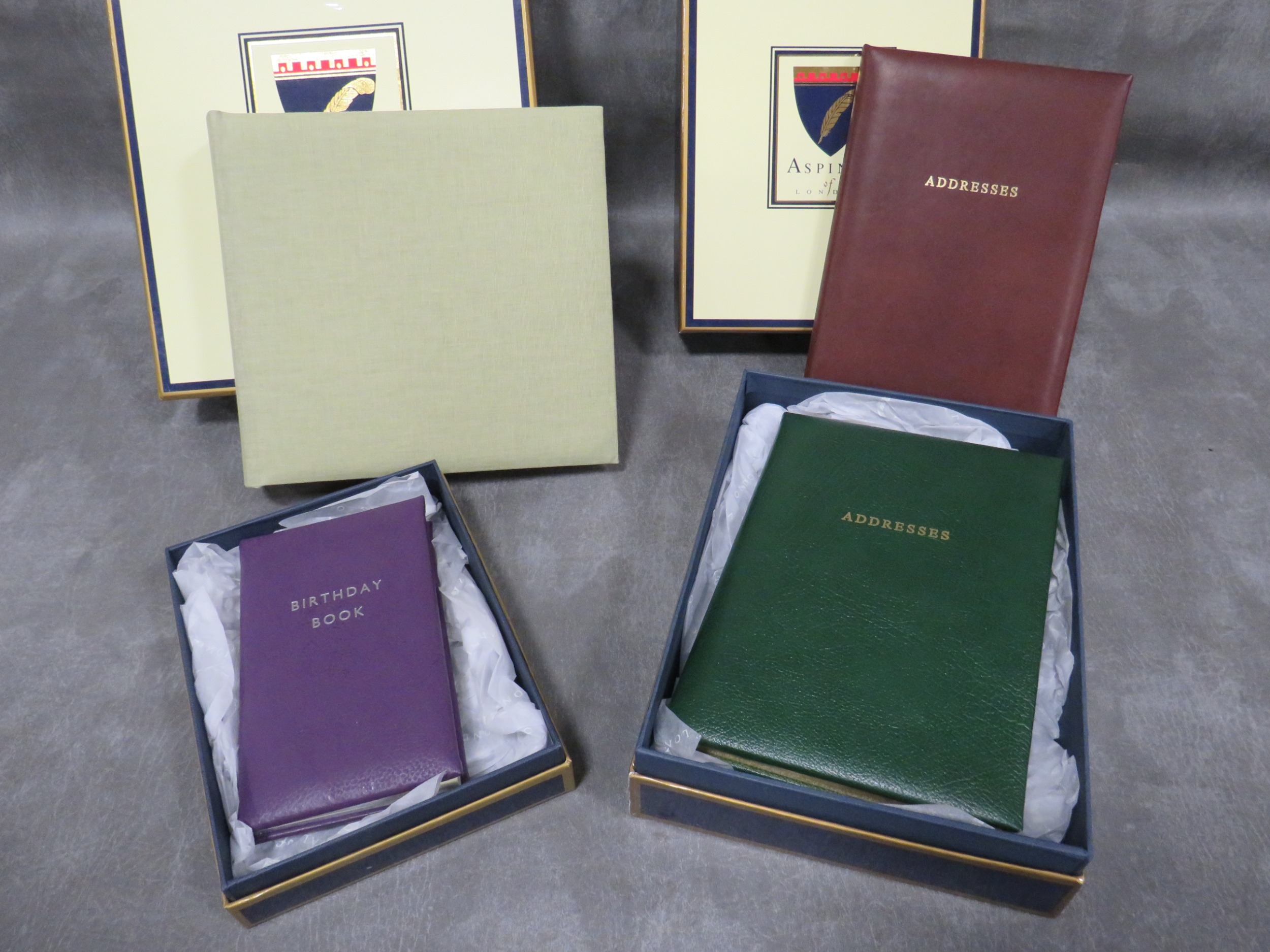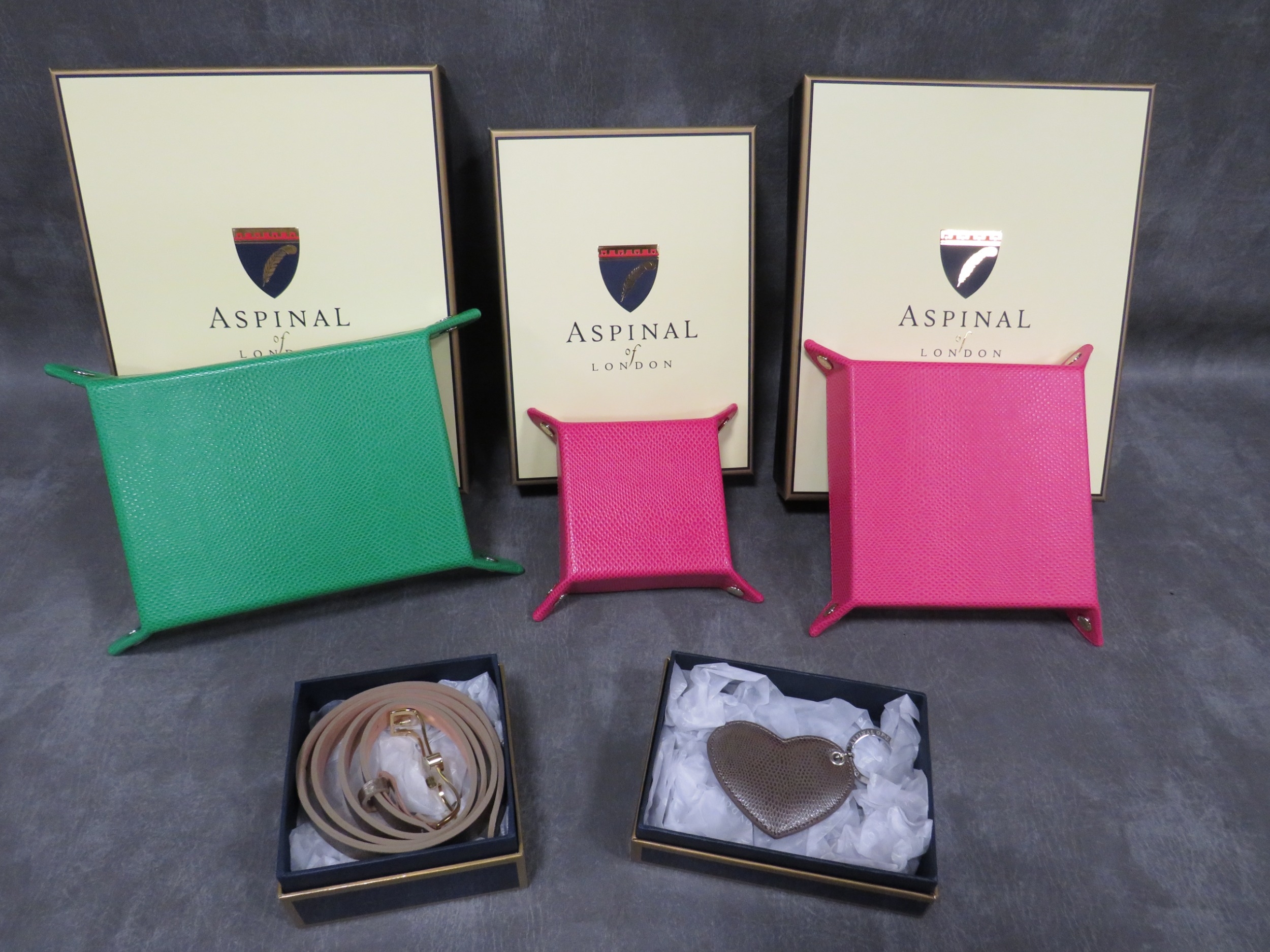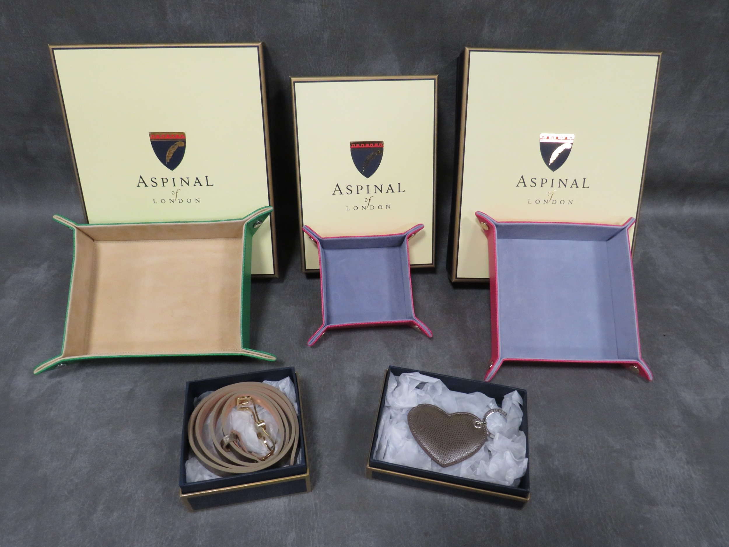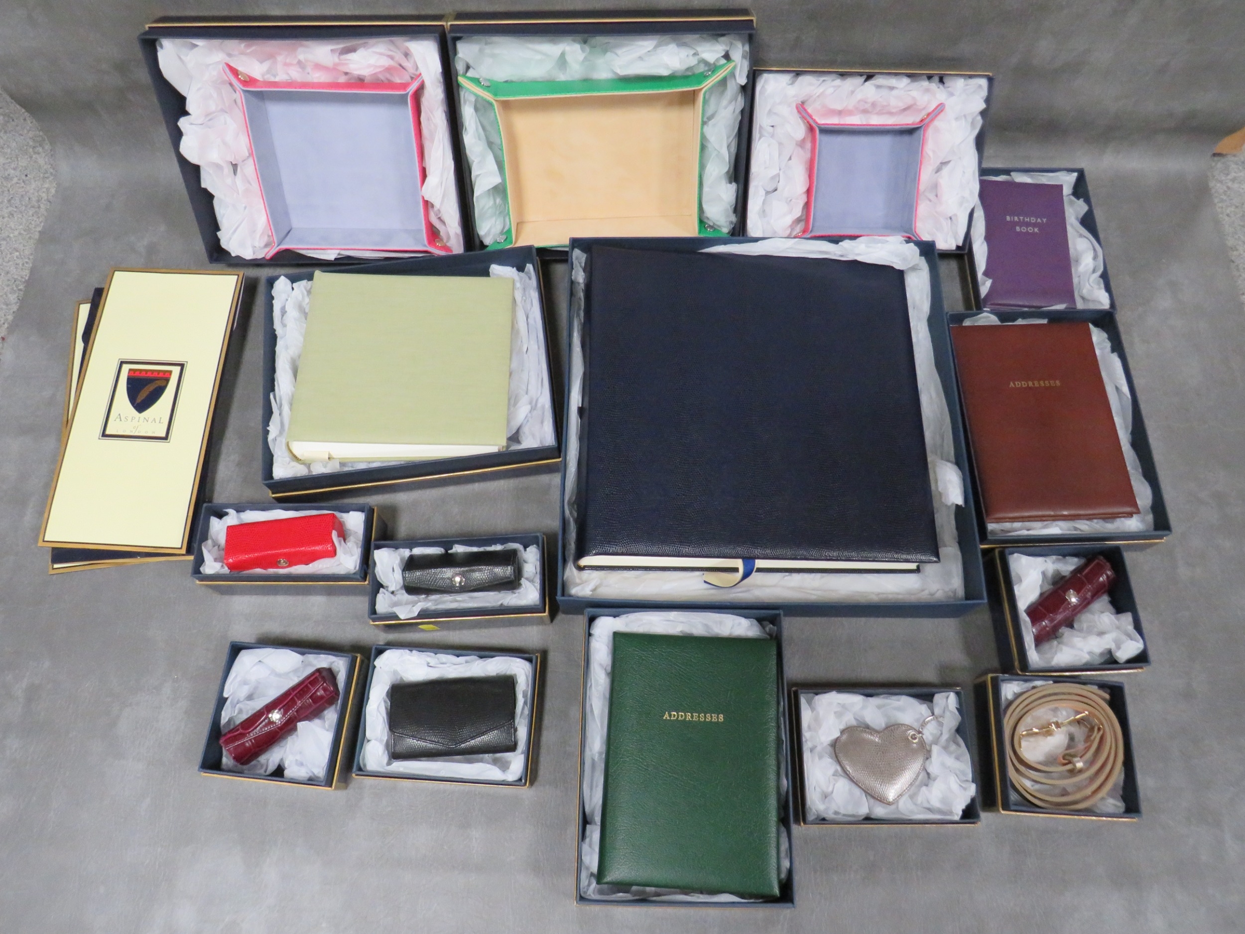 A COLLECTION OF ASPINAL OF LONDON ACCESSORIES / GIFTWARE, mostly boxed, to include coin trays, a keyring, birthday book, scrapbook / album, lipstick holders etc. (15)