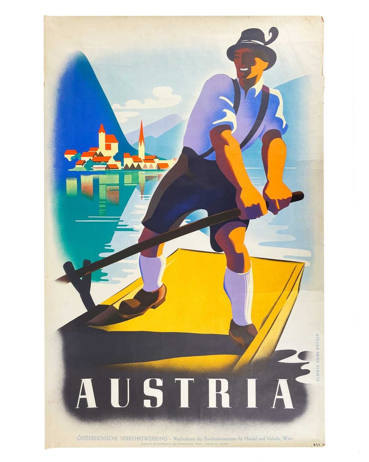 Paul KIRNIG (1891-1955) Austria [c.1935] Lithographic travel poster, pinholes to all corners, fraying particularly to fore-edge, crease to top left corner, marginal 1cm tear to top edge, 95.5cm x 63cm. Provenance James William Davies (26 April 1919 – 5 January 1994) Born in Bethnal Green, London, he was a self-taught graphic designer with a passion for collecting World War II–era posters. Several of his own poster designs are held in the collections of the National War Museum and the Post Office Museum in London.