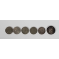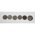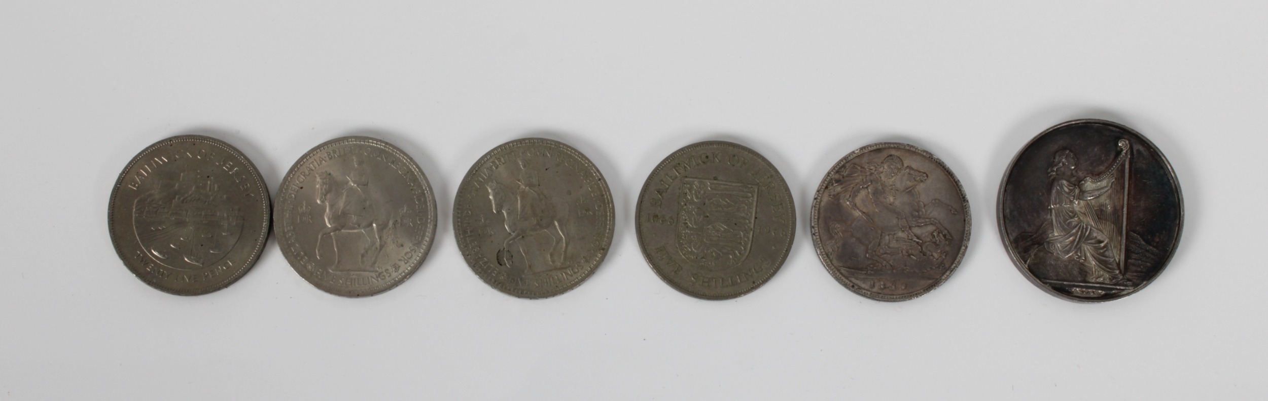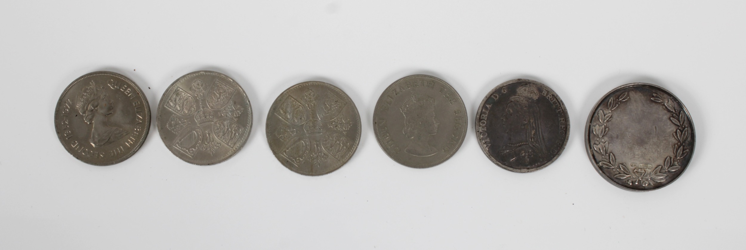 A silver medal and a collection of coinage silver medal, Joseph Moore, Birmingham,1914, vacant (not inscribed), together with a collection of coinage, to include 1889 Queen Victoria Jubilee Head silver Crown, various Five Shilling coins, etc. (6)