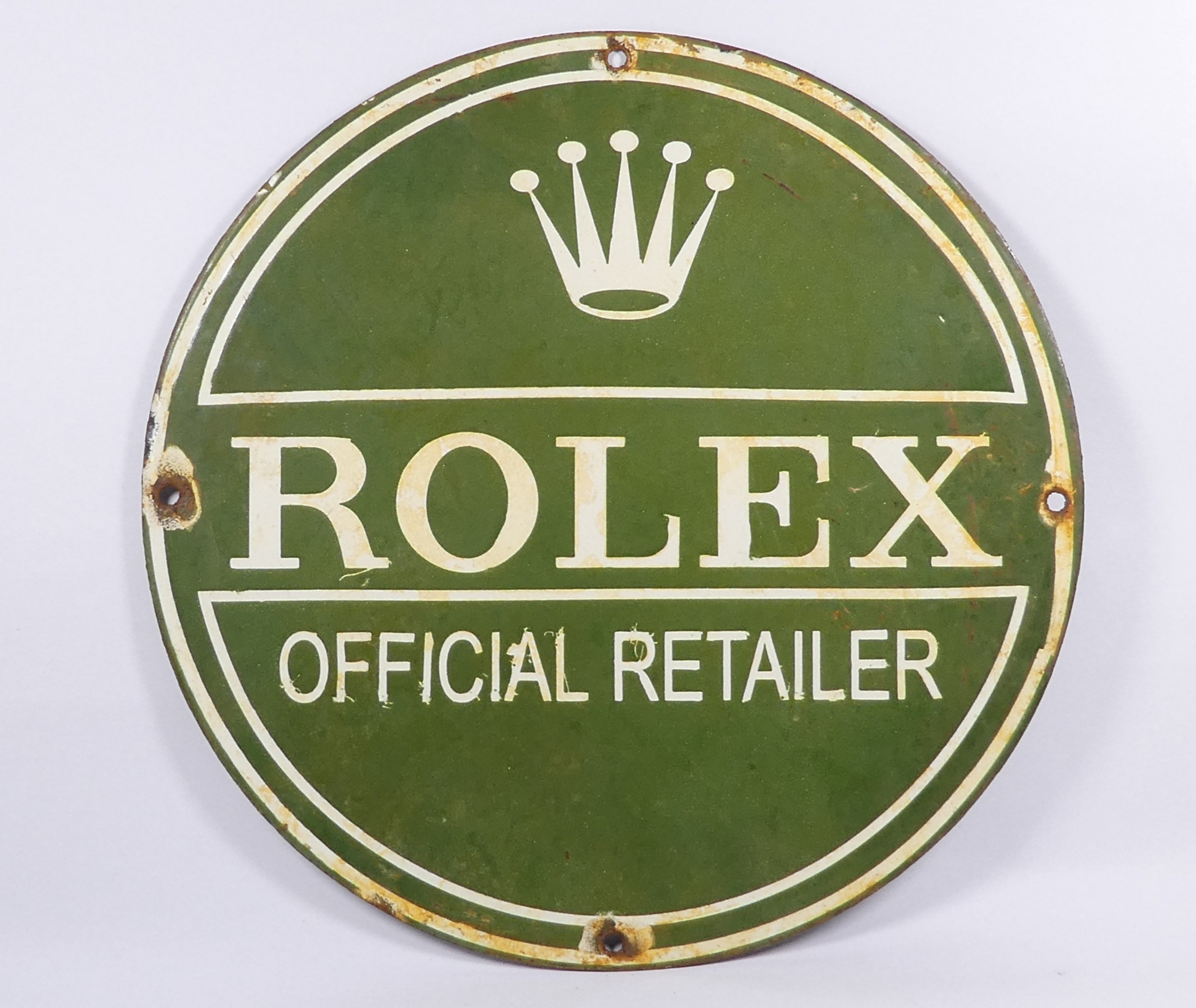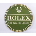 A mid 20th century enamel Rolex retailer sign - circular with white corporate text on a green ground, 30cm diameter.