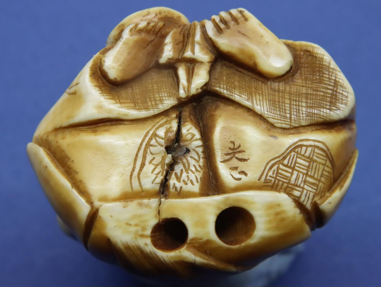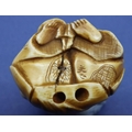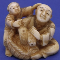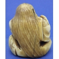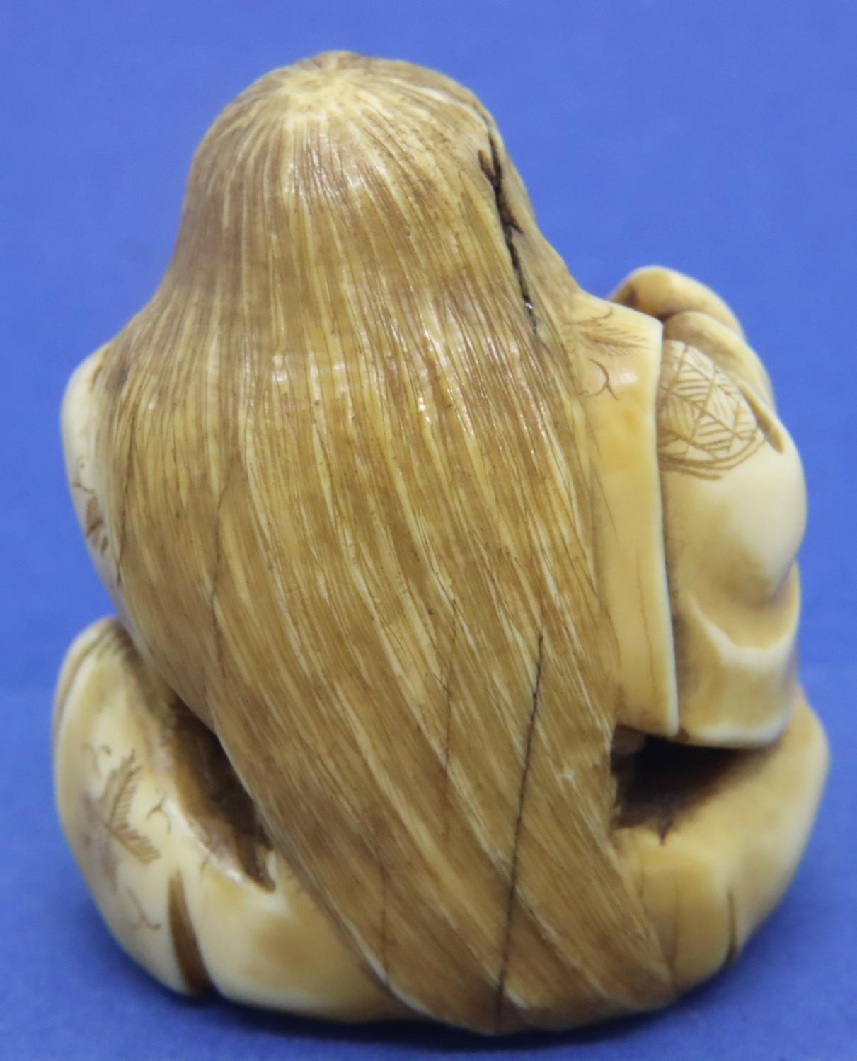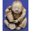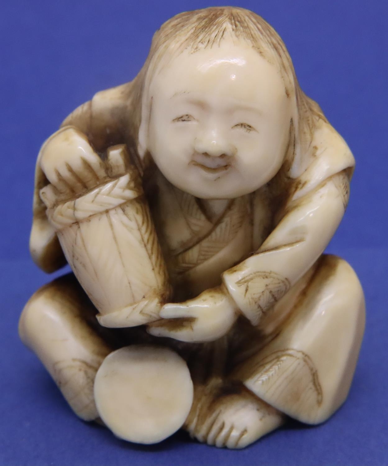 Ivory carved netsuke in the form of a seated man with a bucket, H: 45 mm, signed to base. P&P Group 1 (£14+VAT for the first lot and £1+VAT for subsequent lots)