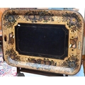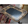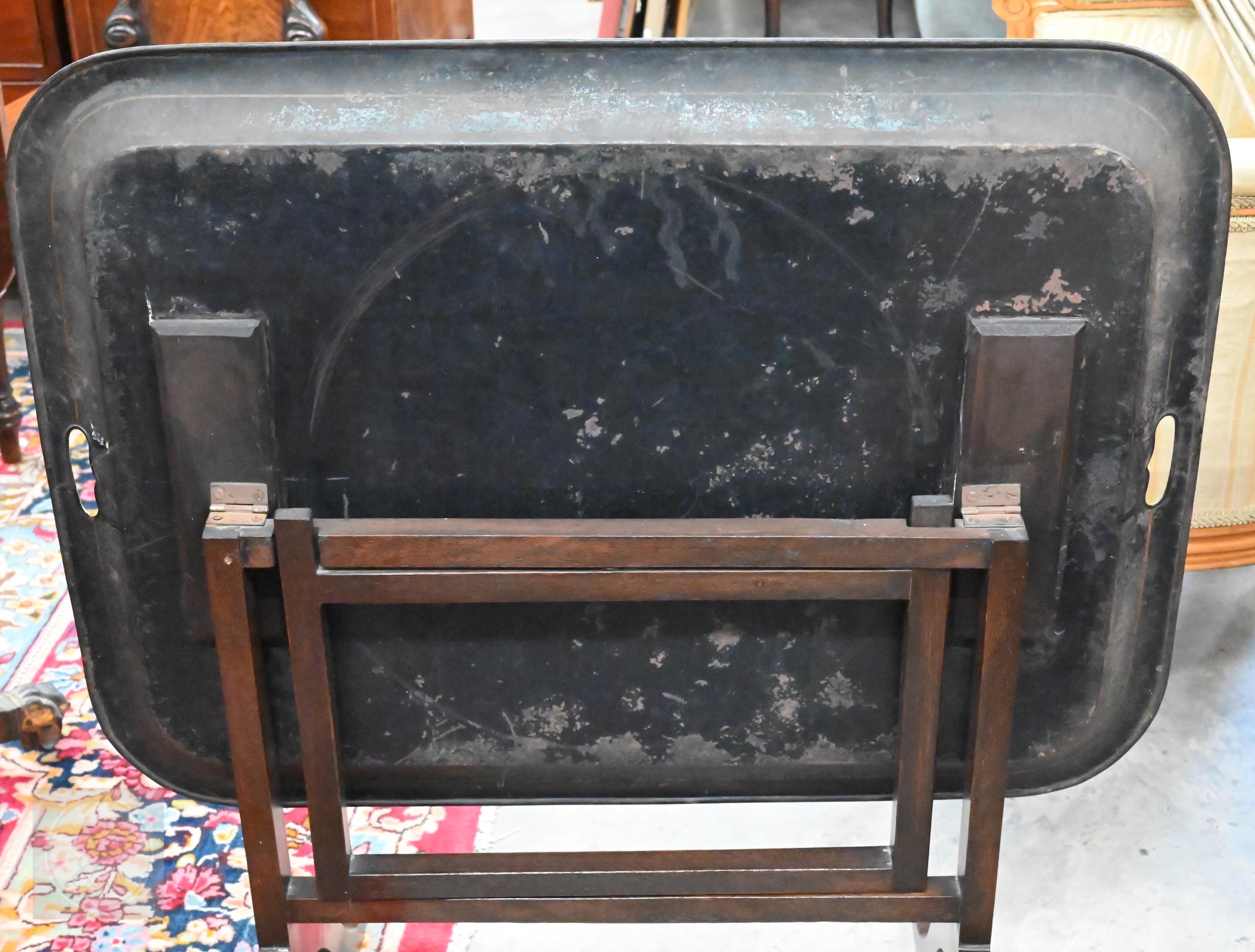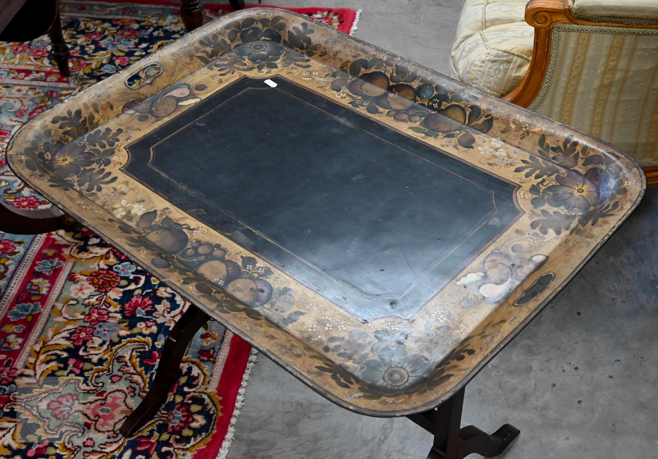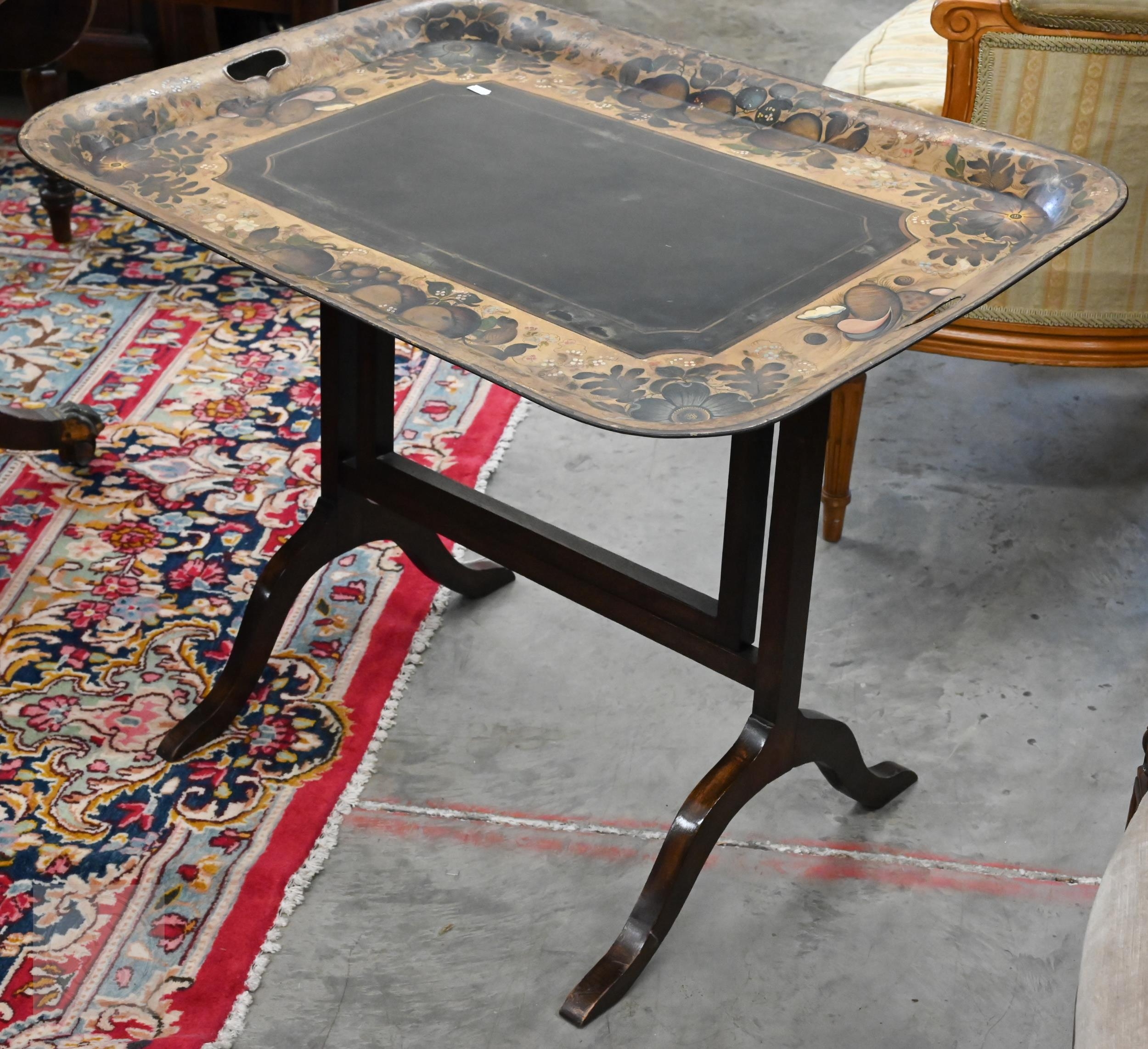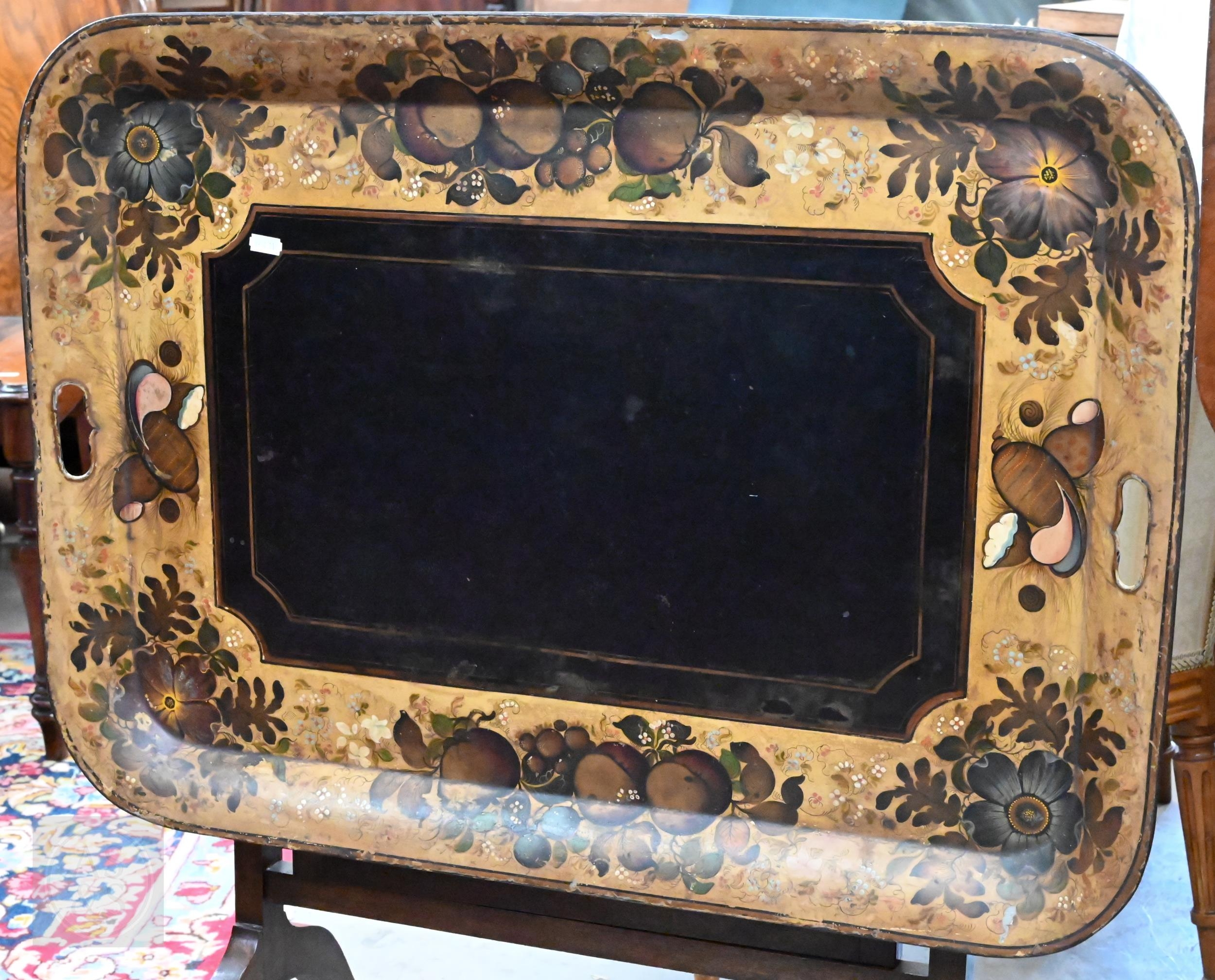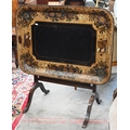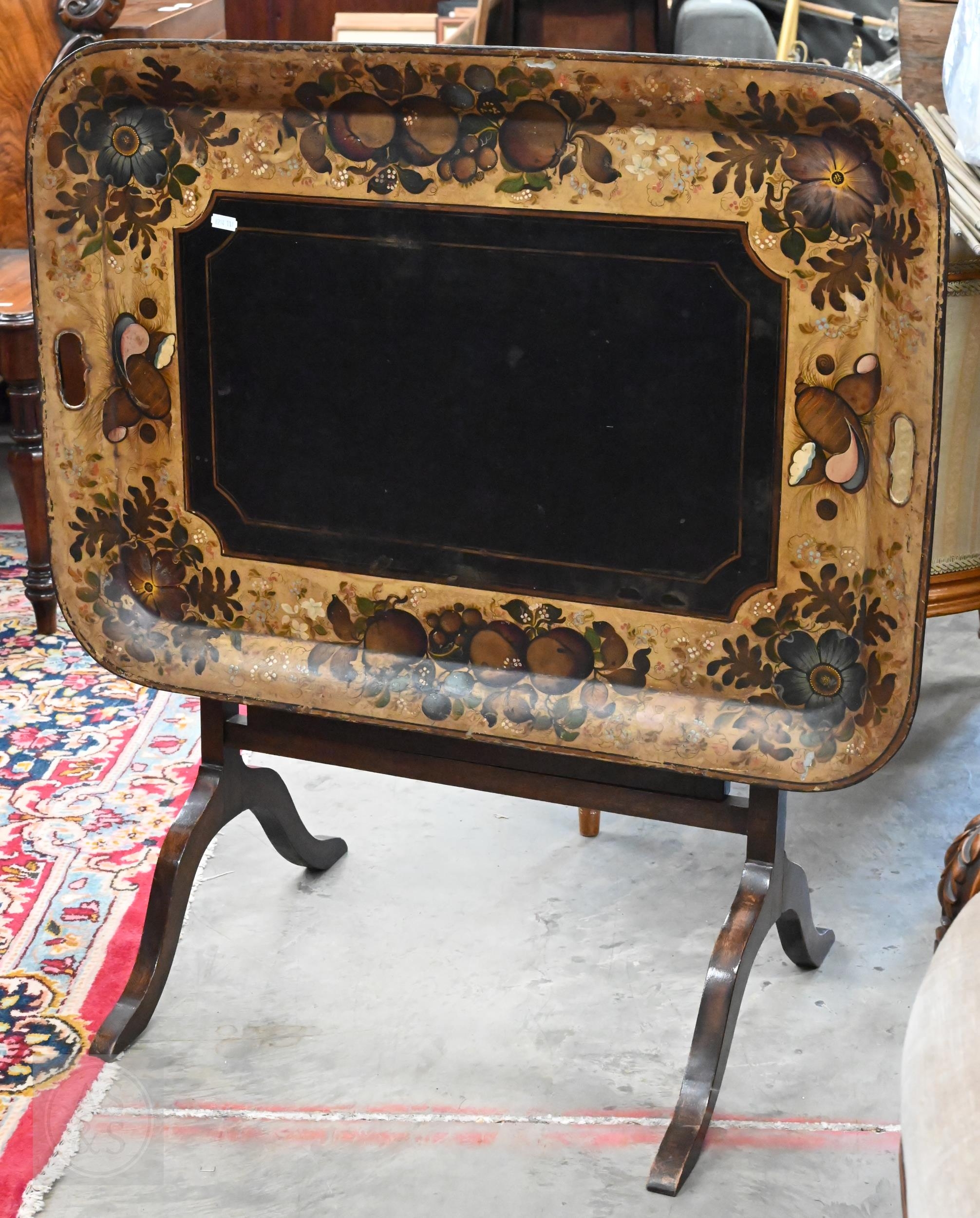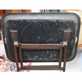 A black metal folding tray-top table with gilt and polychrome flowers and fruit decoration