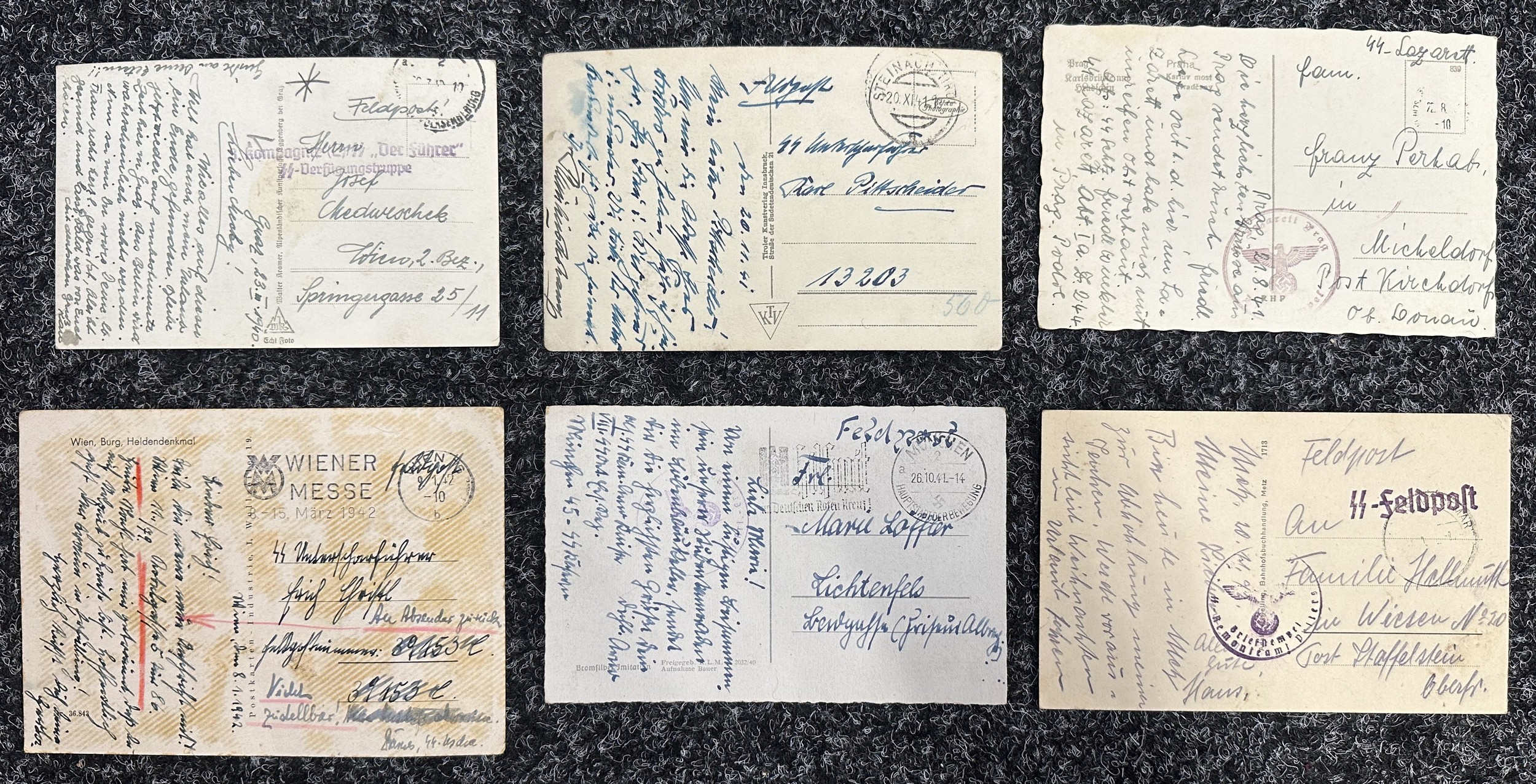 WW2 Third Reich Photographic Postcards all sent by different members of the Waffen SS including "Der Fuhrer" and "Totenkopf" x 2, SS Hospital Prag, S.S. Remonteamt (Horse Farm) (6)