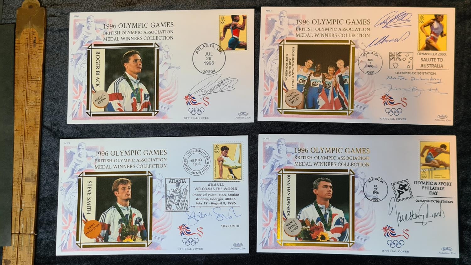 1996 Olympic covers autographed by Roger Black, Steve Smith, Jonathan Edwards, Mens 4 x 400 meter relay team.