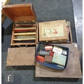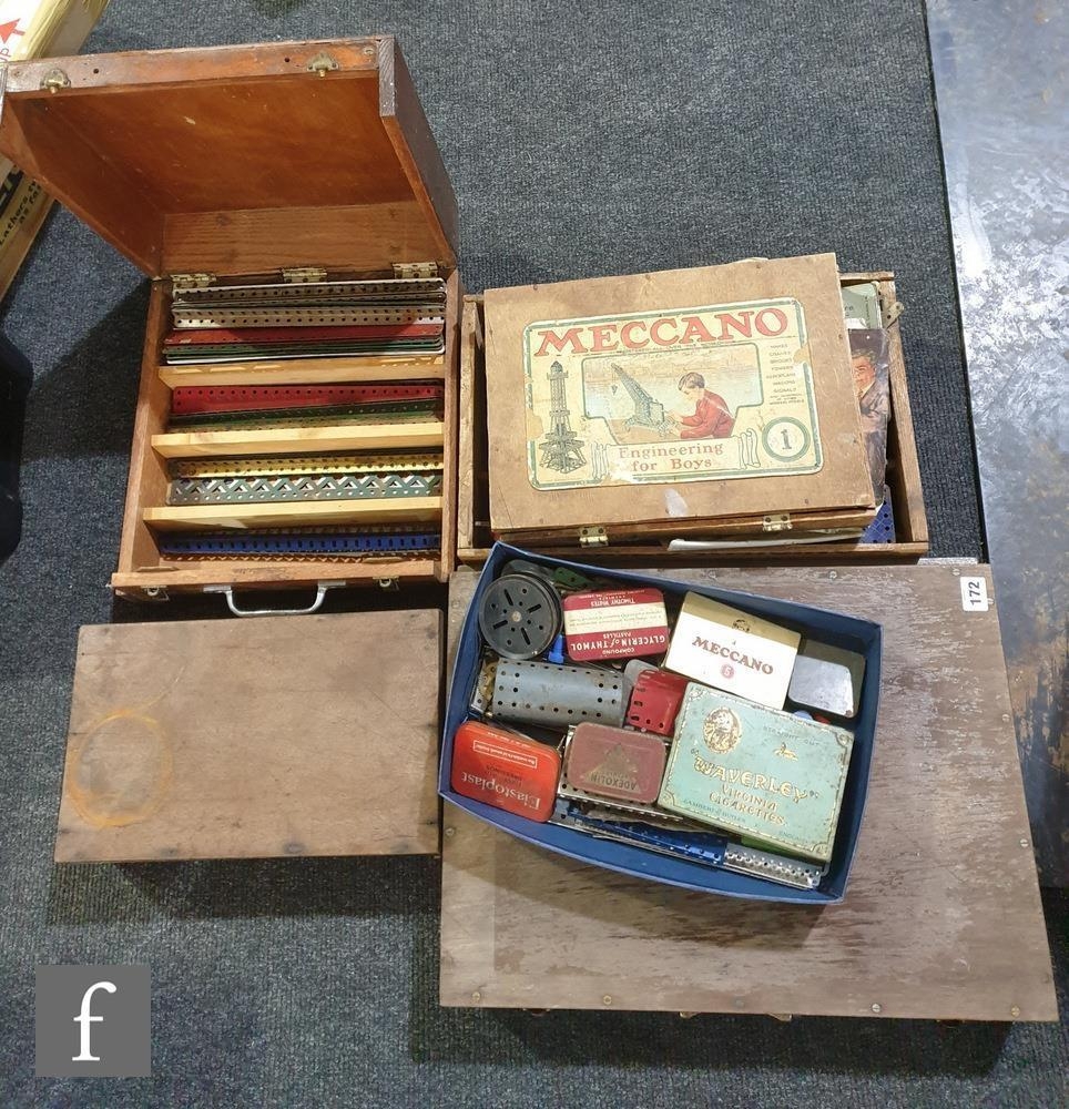 A collection of assorted Meccano pieces, mostly housed in wooden boxes, to include plates, small parts, girders, etc., with a selection of instruction leaflets.