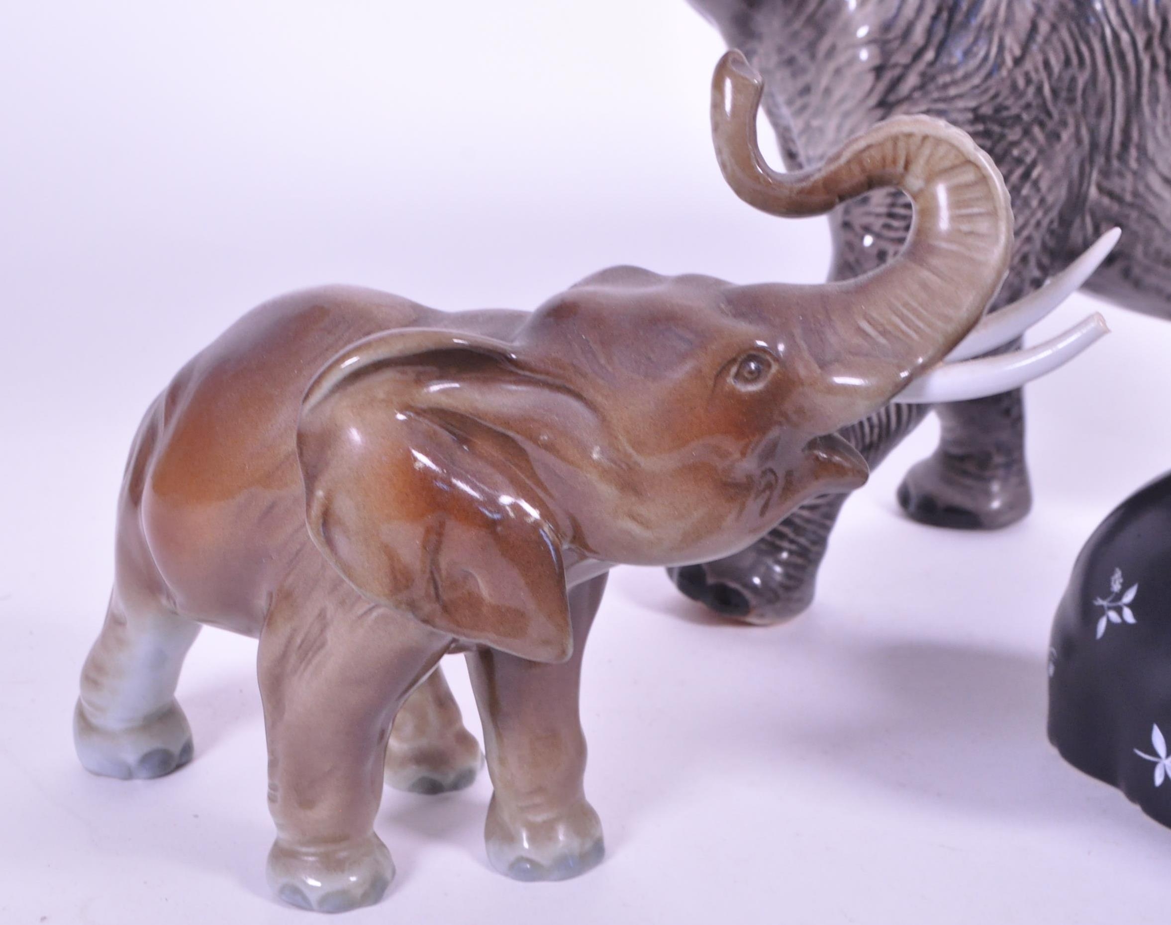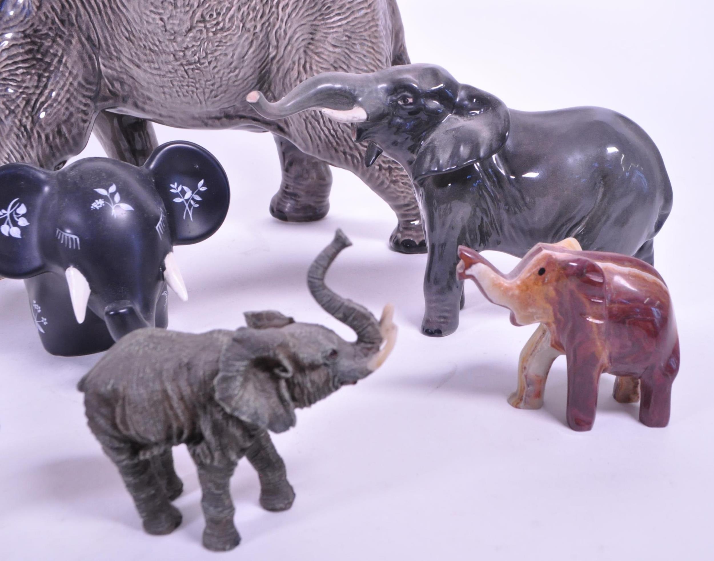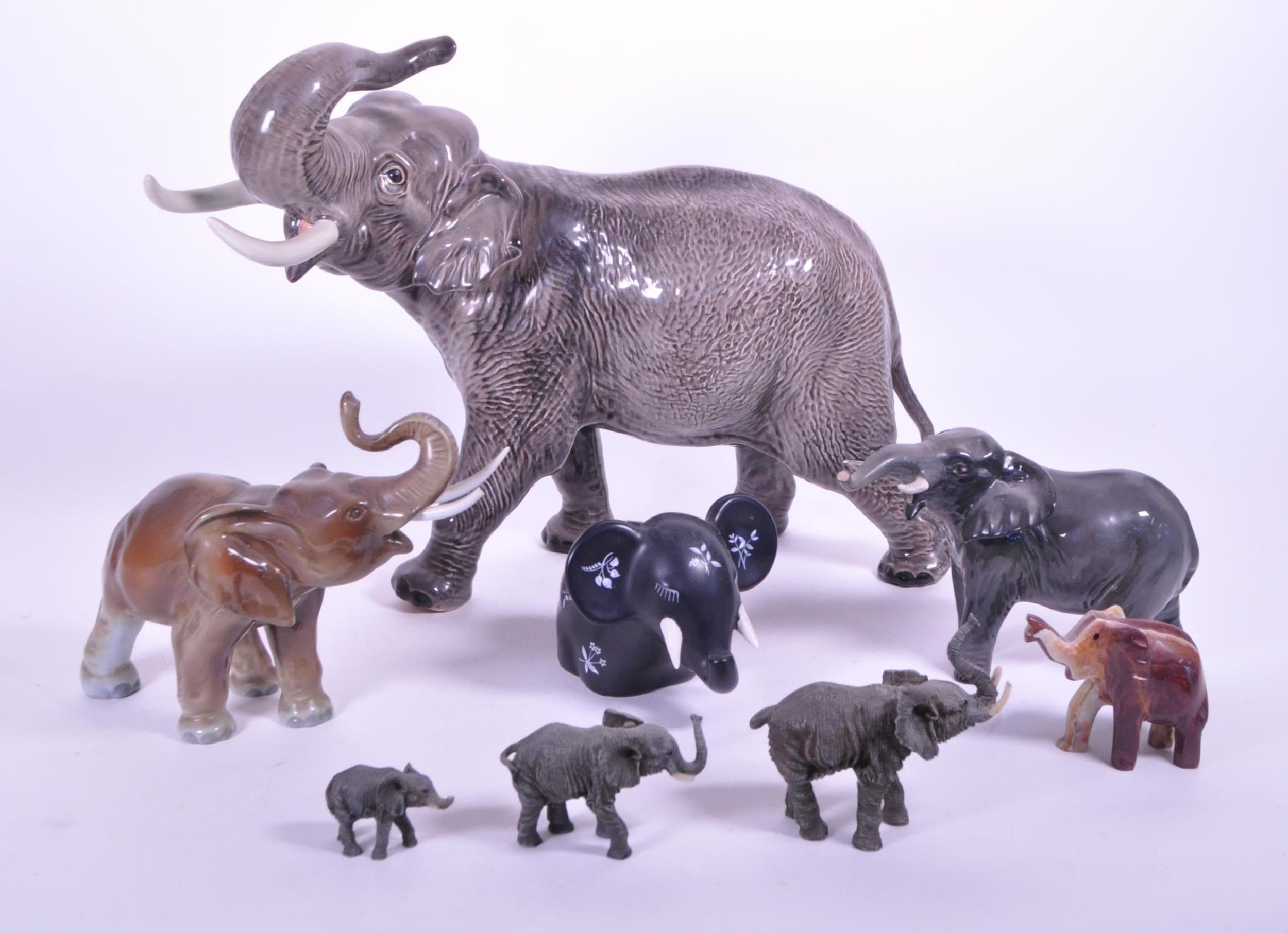 Large Beswick elephant with trunk curled upwards, stamp to base of one foot, along with a similar smaller example and a small collection of other elephant figures.