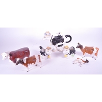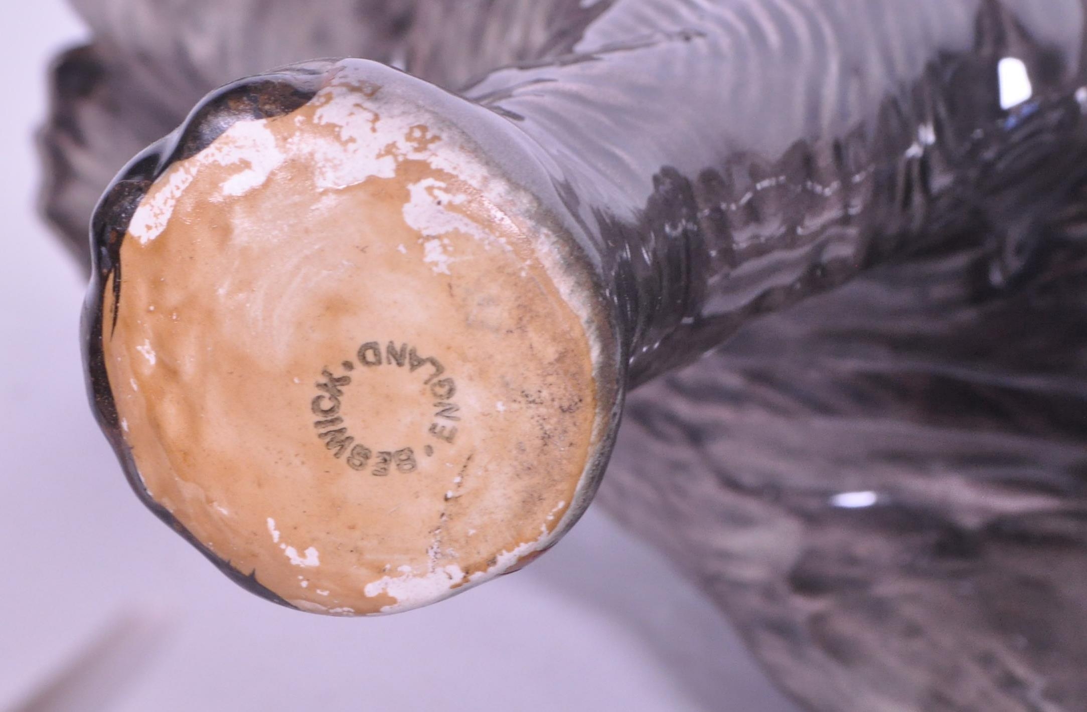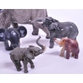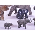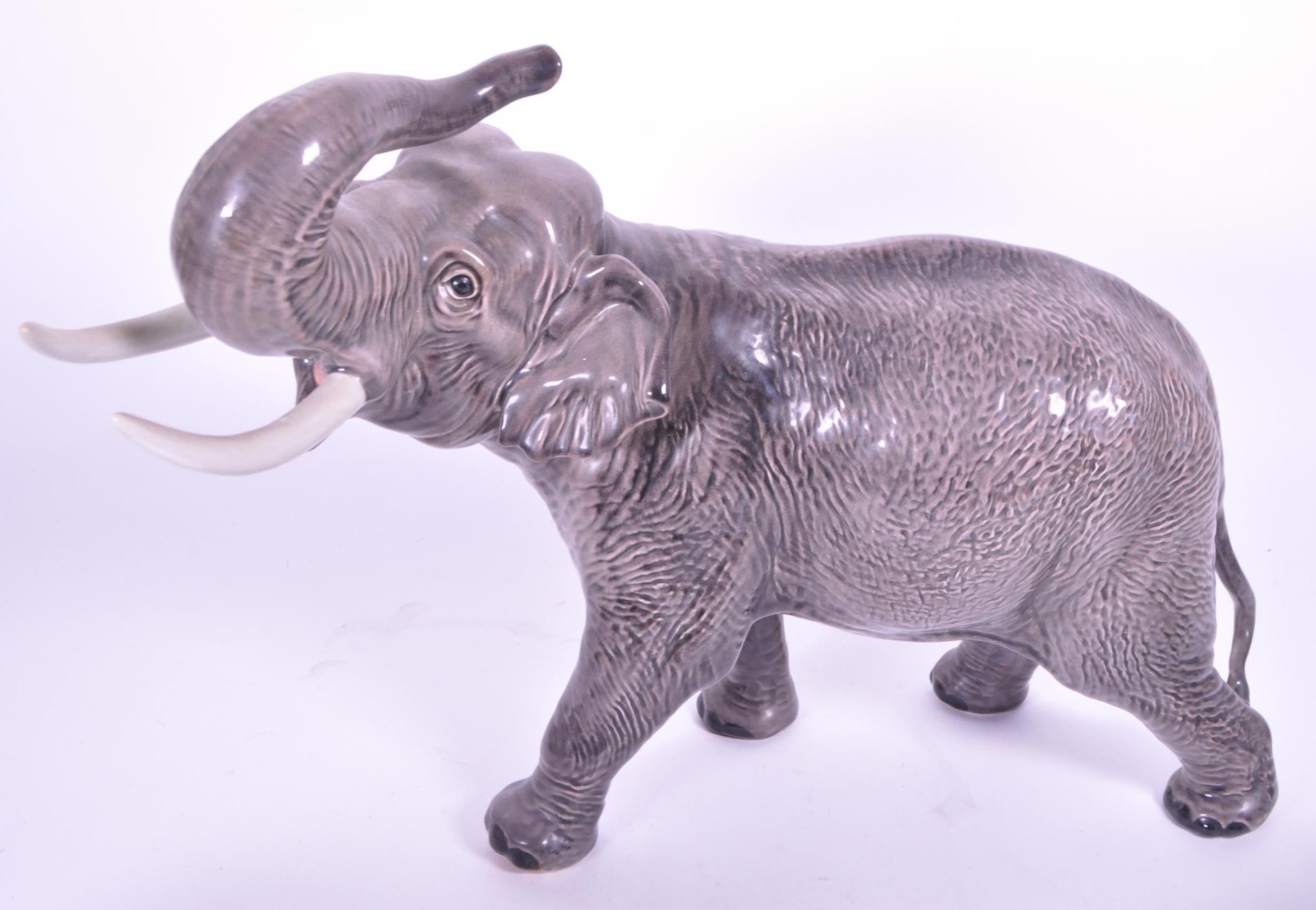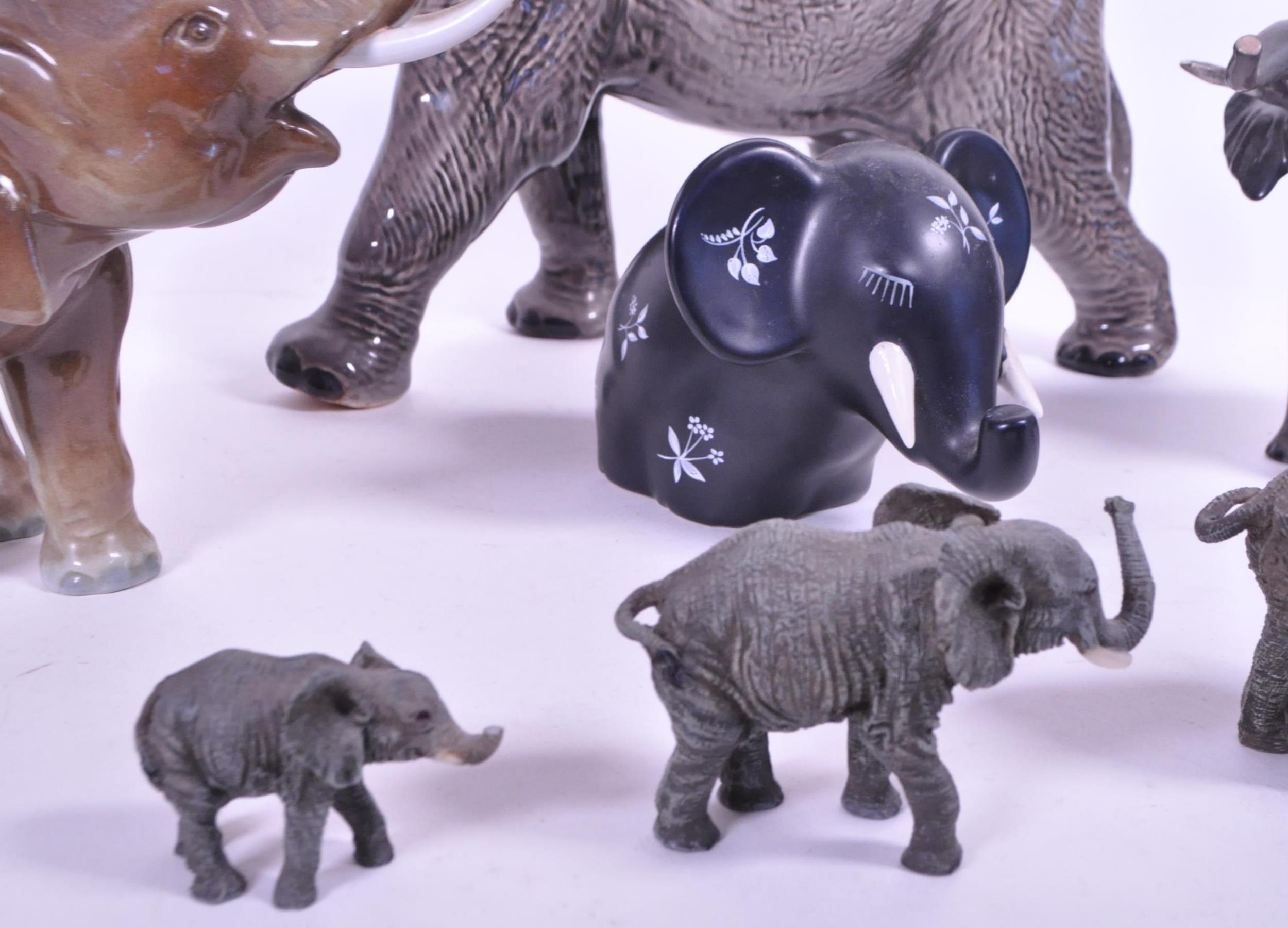 Large Beswick elephant with trunk curled upwards, stamp to base of one foot, along with a similar smaller example and a small collection of other elephant figures.
