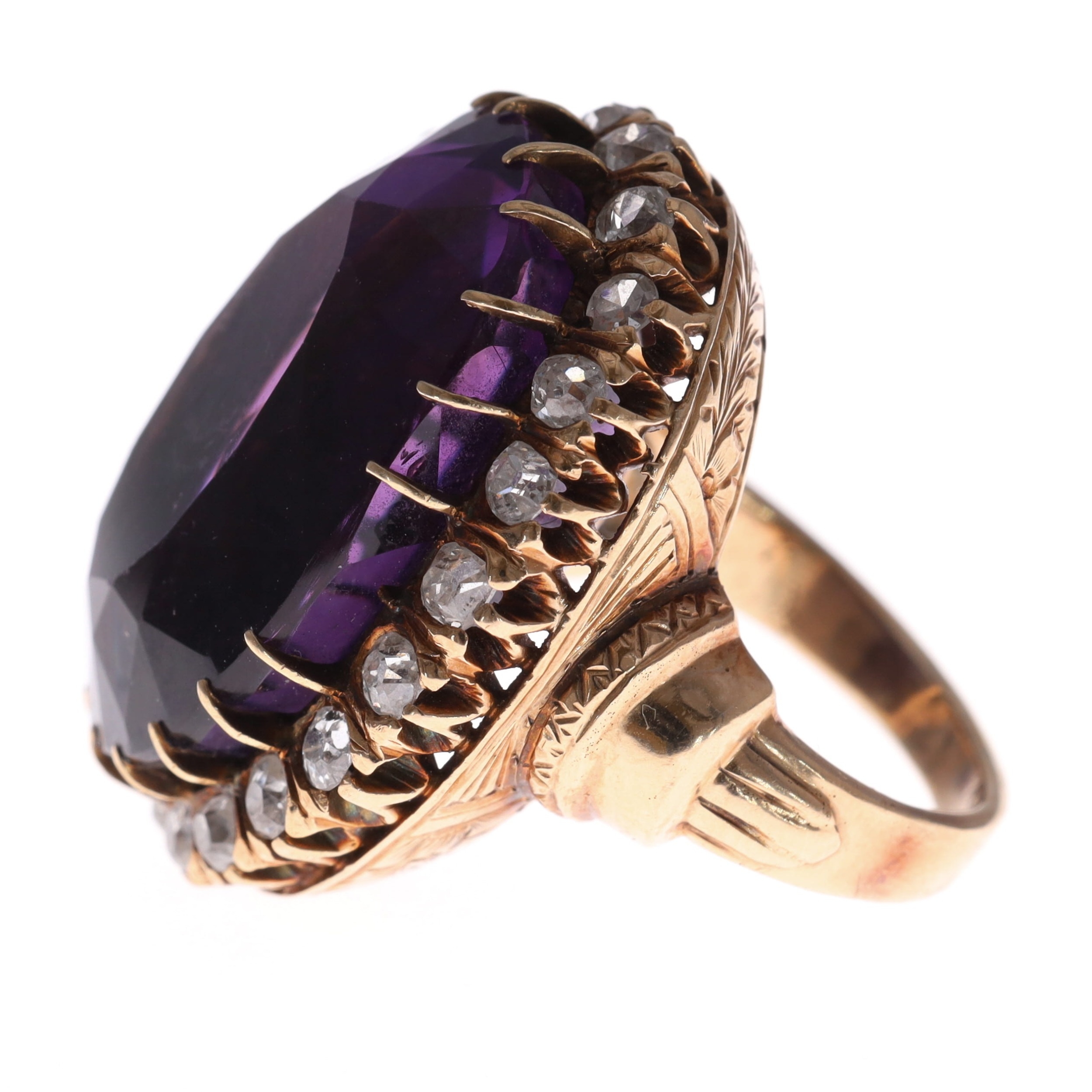 Victorian Diamond and Amethyst Gold Cocktail Ring. This piece has been tested as 14ct gold. The central amethyst measures approximately 2.5cm in length. UK ring size M, weighs in total 21.6g.