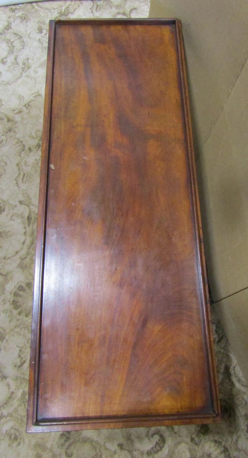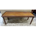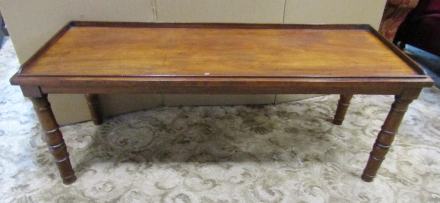 19th century mahogany occasional table of rectangular form with raised gallery borders on four turned support, 122cm long x 44cm wide