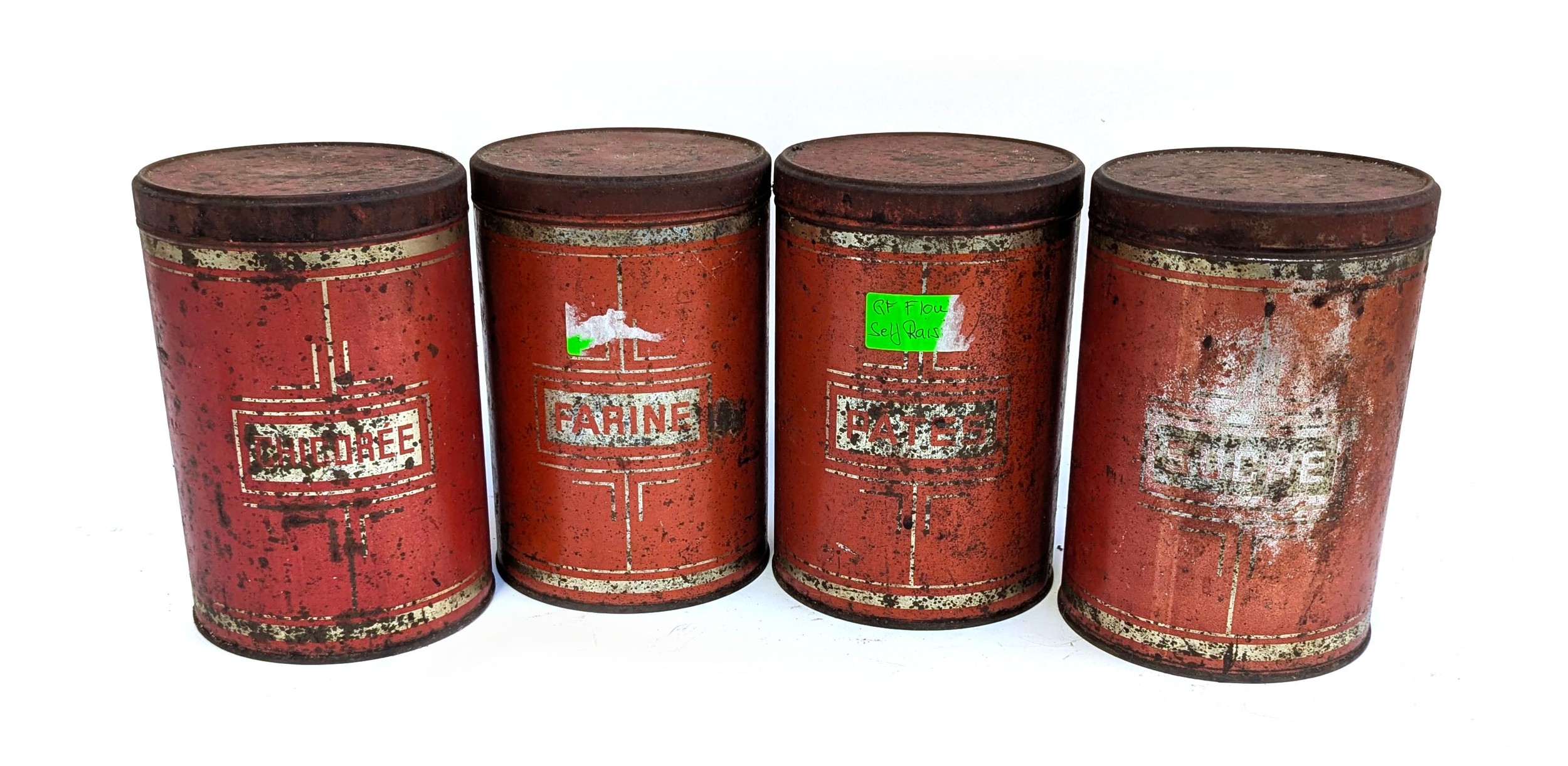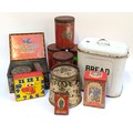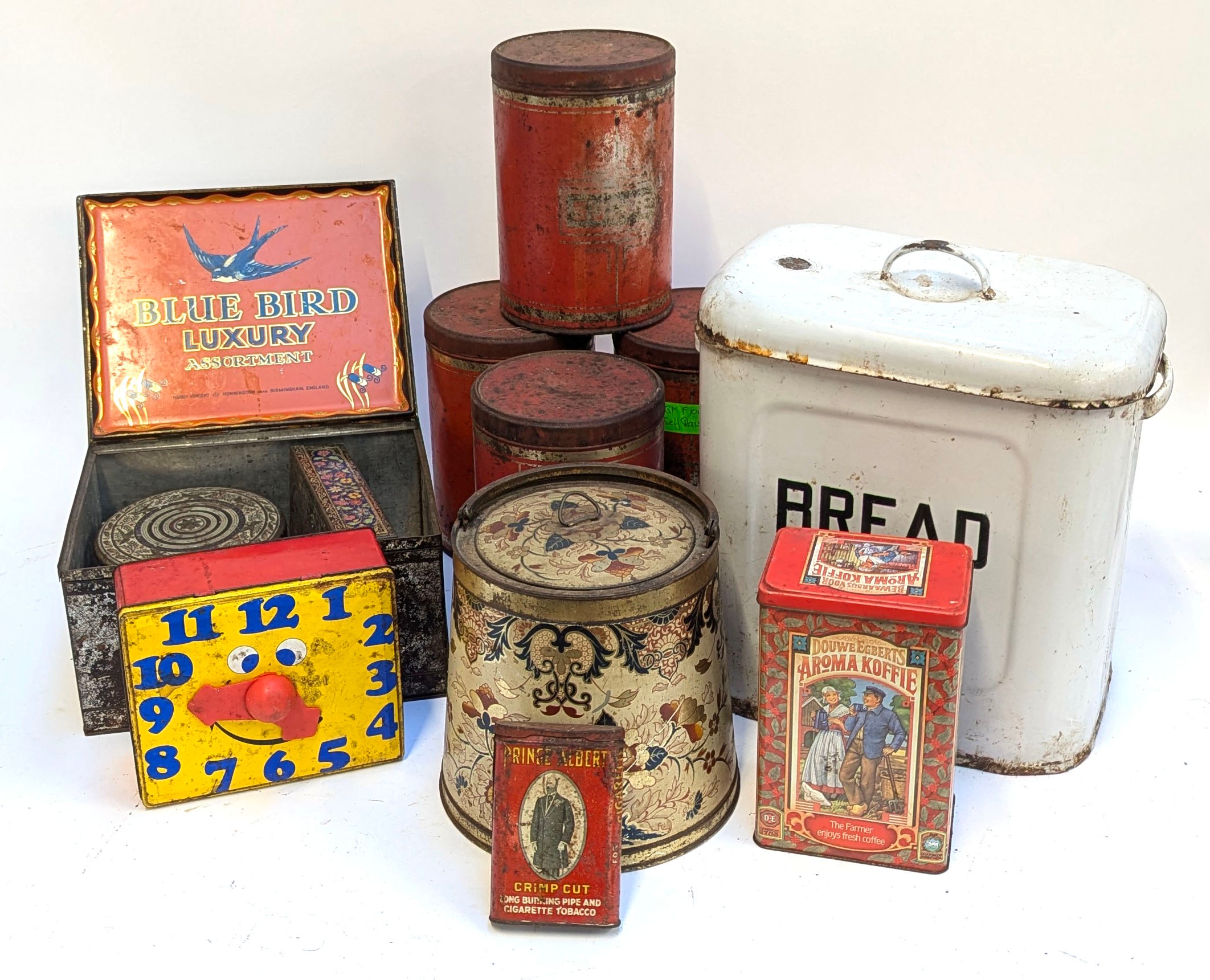 A collection of vintage tins to include: Prince Albert, Blue Bird, Douwe Egberts, clock faced, enamel bread bin 30cmH