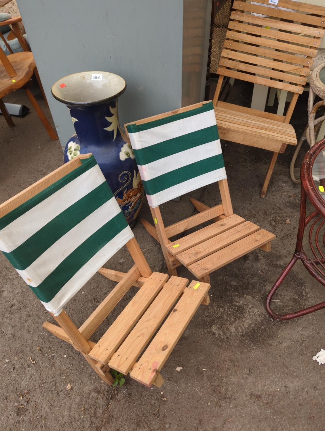 3 x 2-piece wood and canvas collapsible garden/beach chairs. Tallest 78cm.