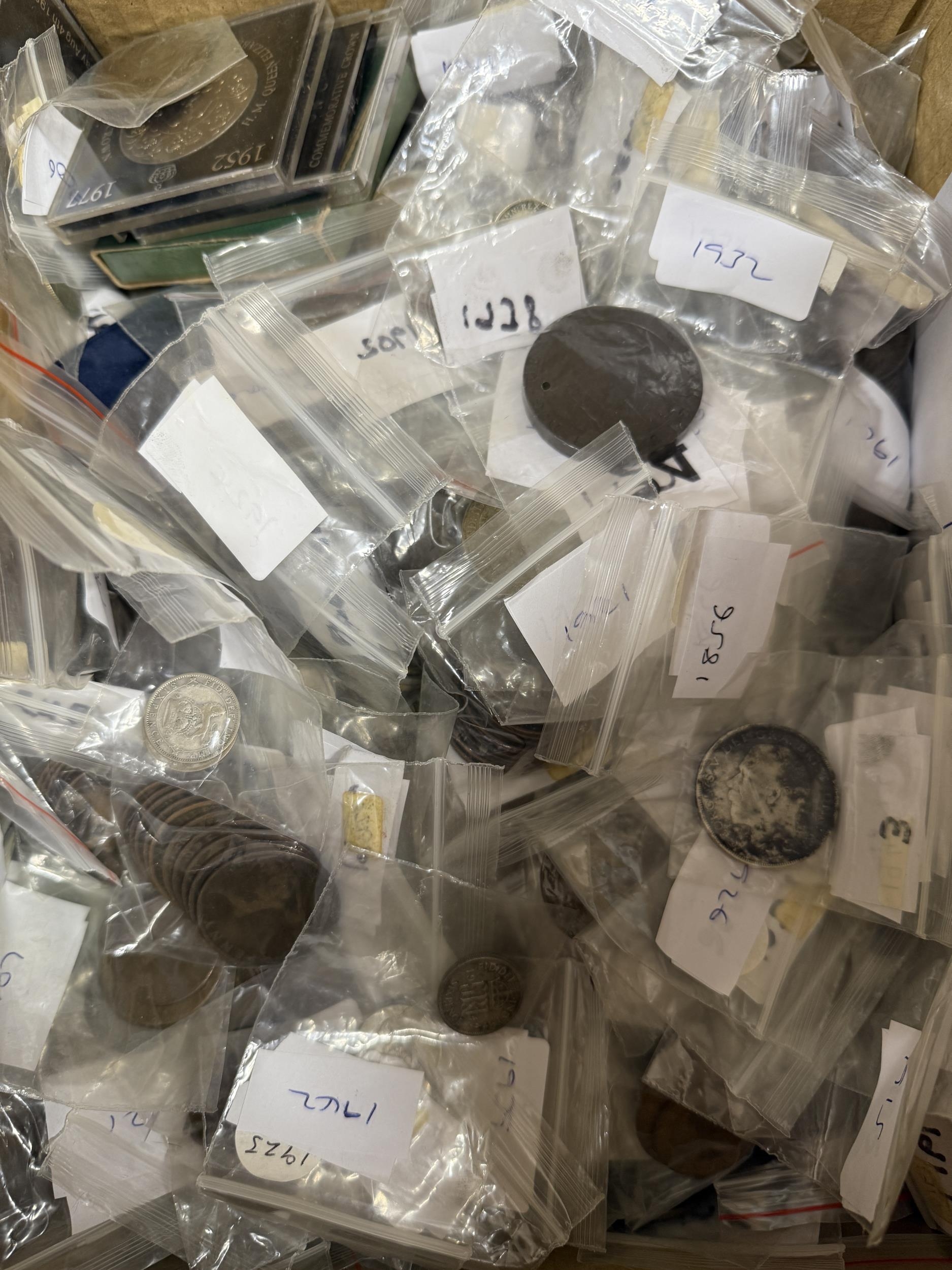 A collection of mainly 20th Century circulated UK coins assorted into bags, noted QV 1d’s odd banknotes and 1797 2d, weight inc box 8 Kilos, mixed condition