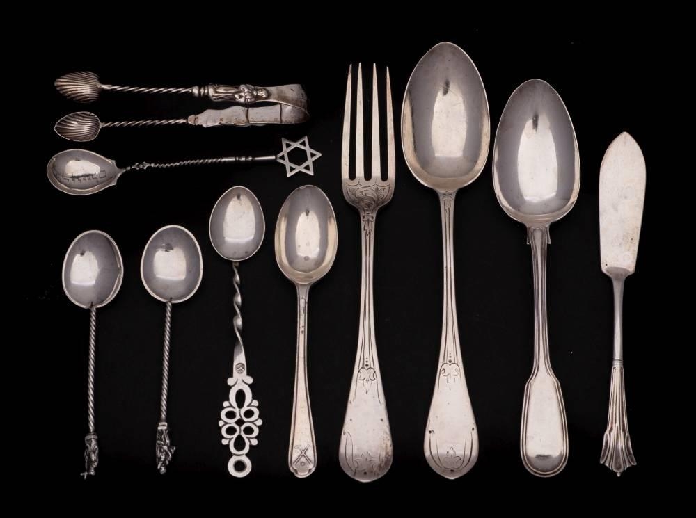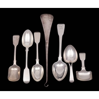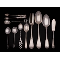 A mixed group of silver flatwares, various makers and dates: includes christening set, butter knife, tea and assorted coffee spoons and sugar tongs, 157gms, 5.07ozs