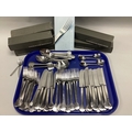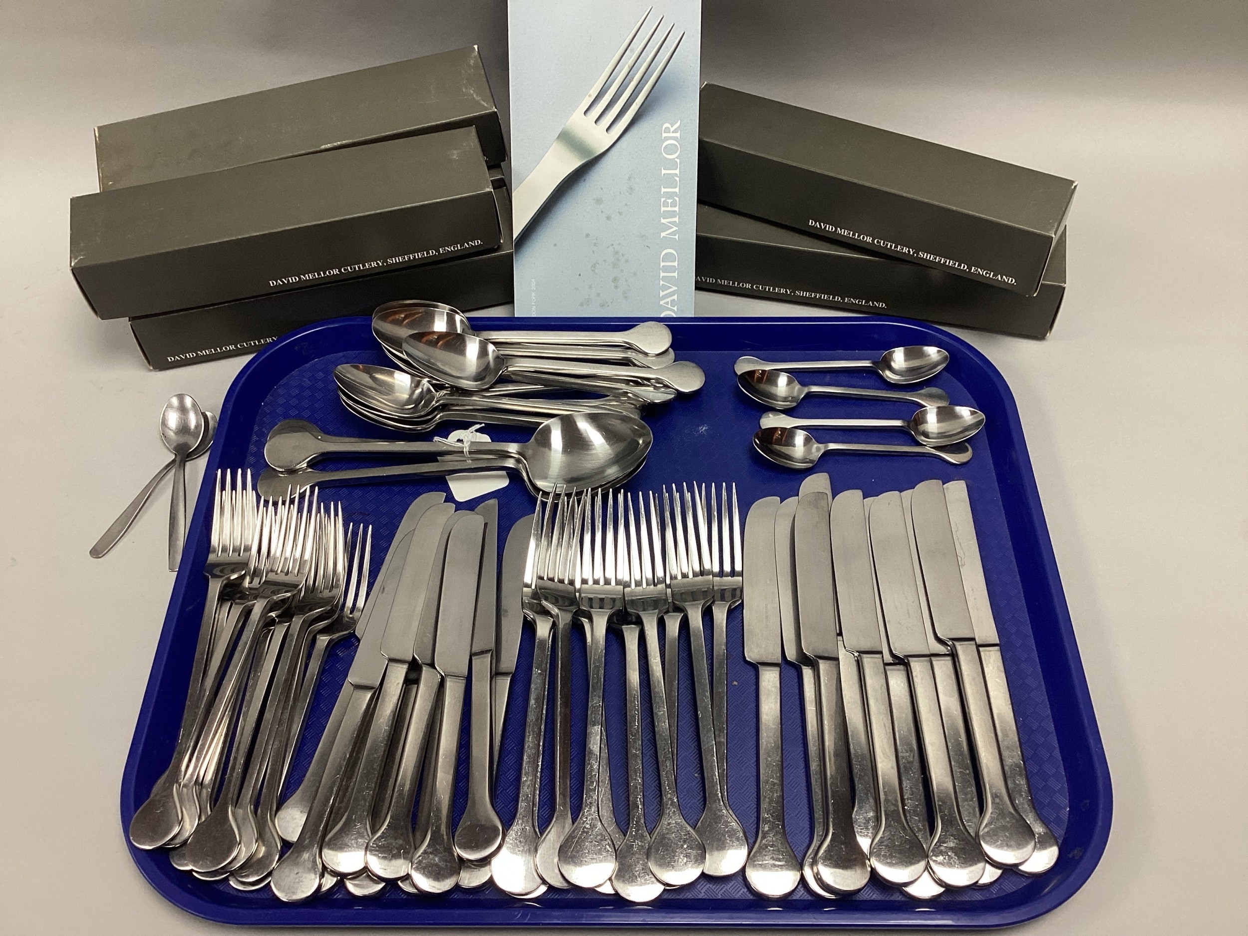 David Mellor; A Modern Ten Setting Part Canteen of Hoffmann Pattern Stainless Steel Cutlery, comprising ten each table knives and forks, dessert knives, forks and spoons, four teaspoons and three serving spoons (57) (part boxed).