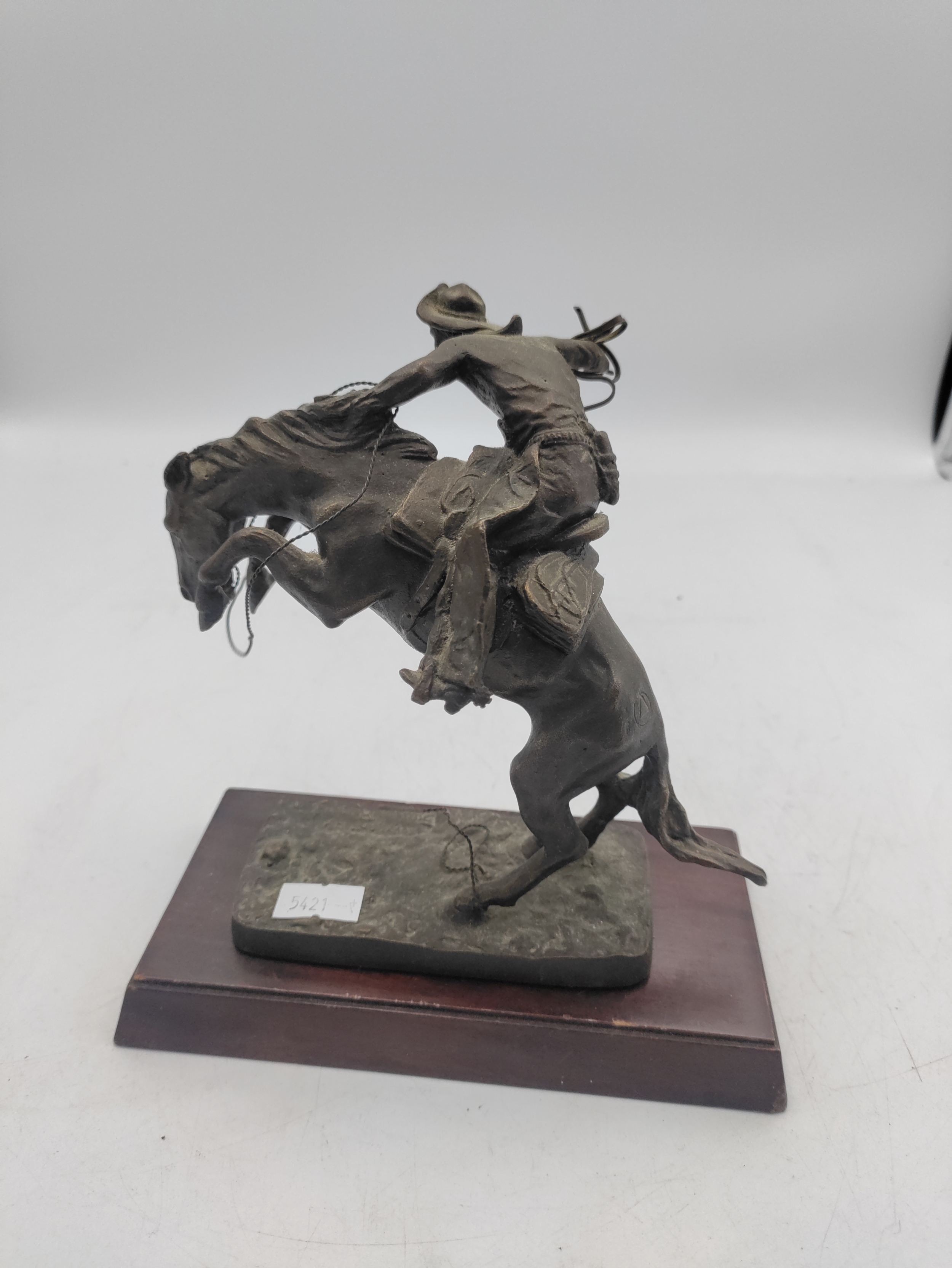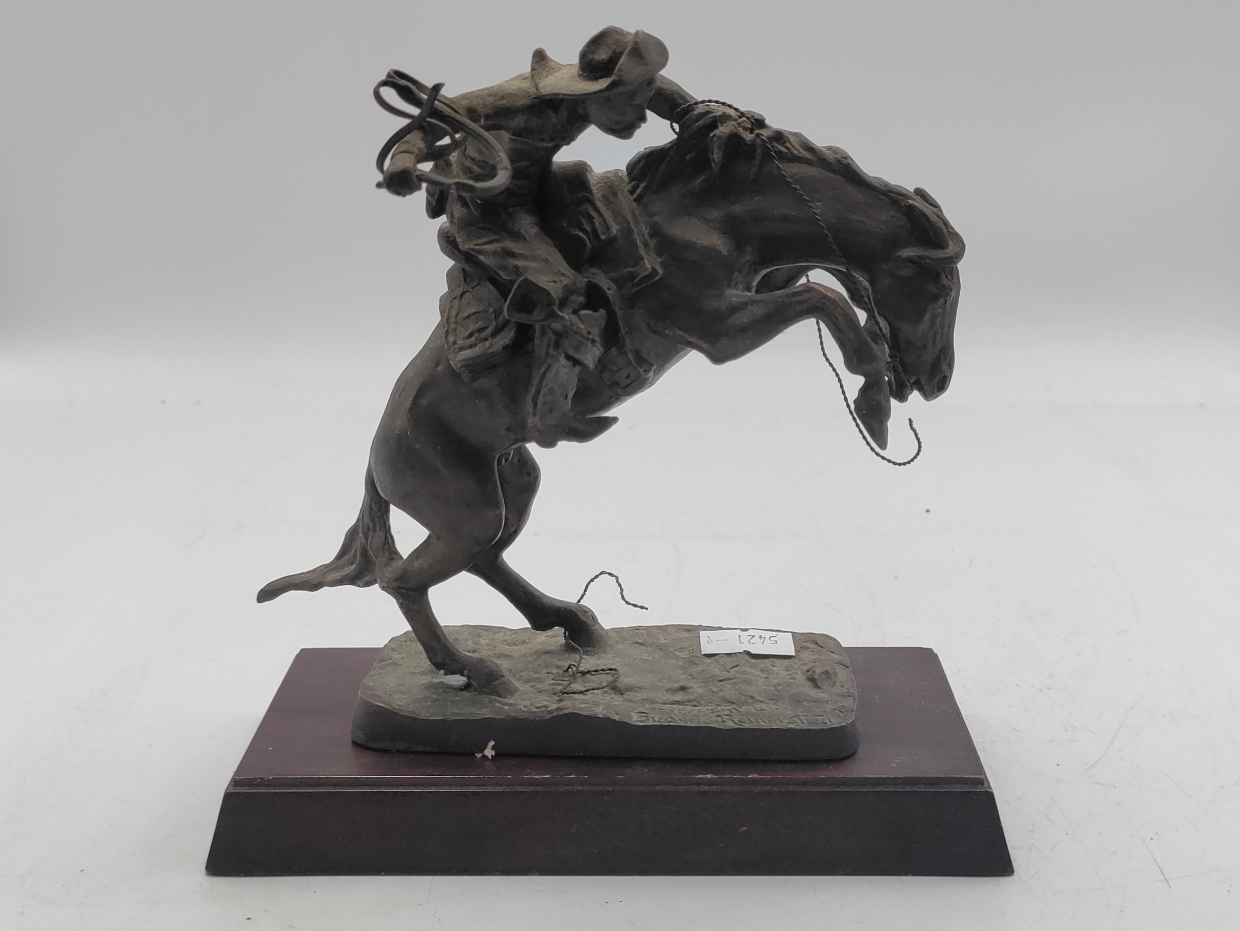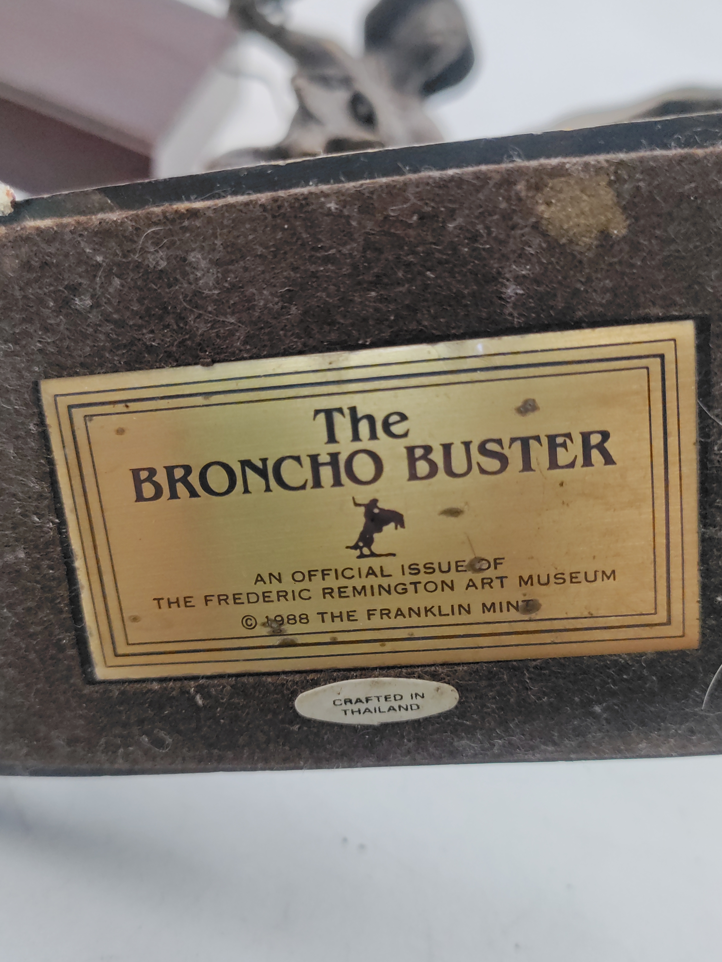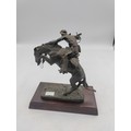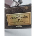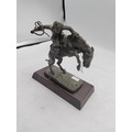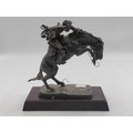 A Franklin mint bronze sculpture titled the bronco buster. By Frederic Remington. Measures H 17cm. Slight damage to the wire reigns.