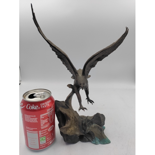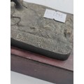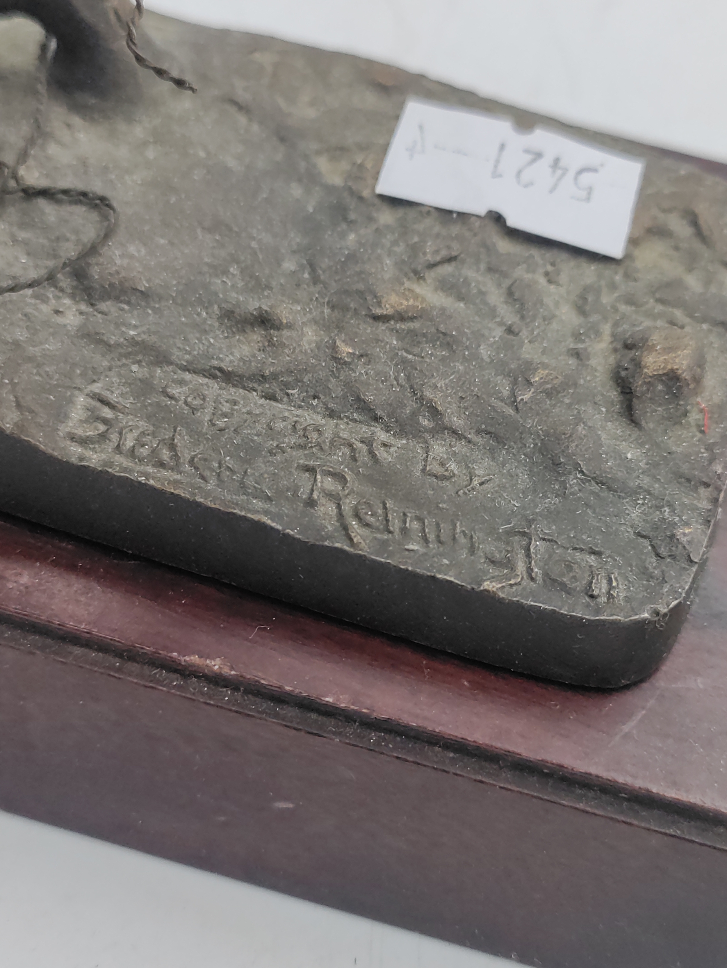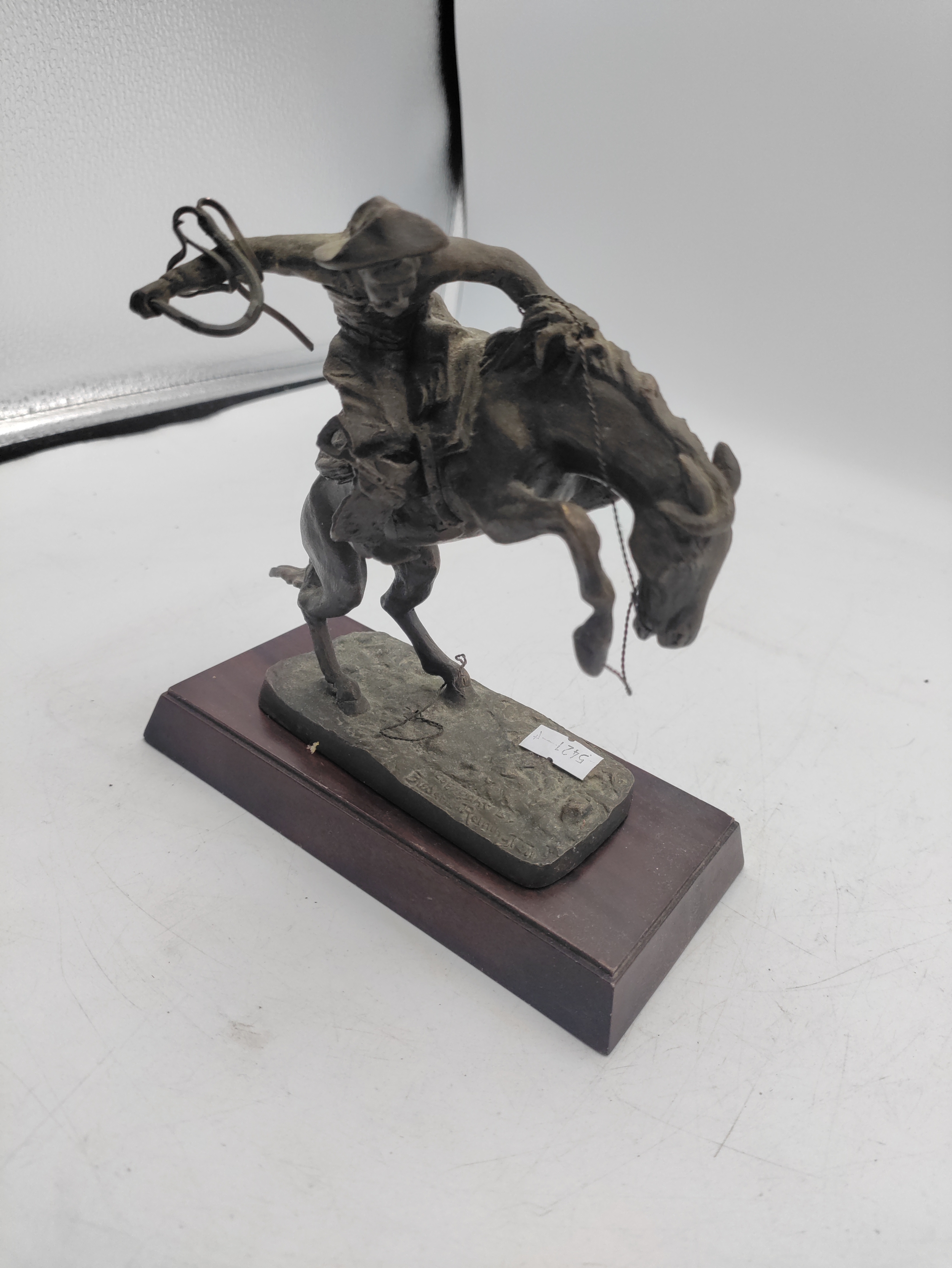 A Franklin mint bronze sculpture titled the bronco buster. By Frederic Remington. Measures H 17cm. Slight damage to the wire reigns.