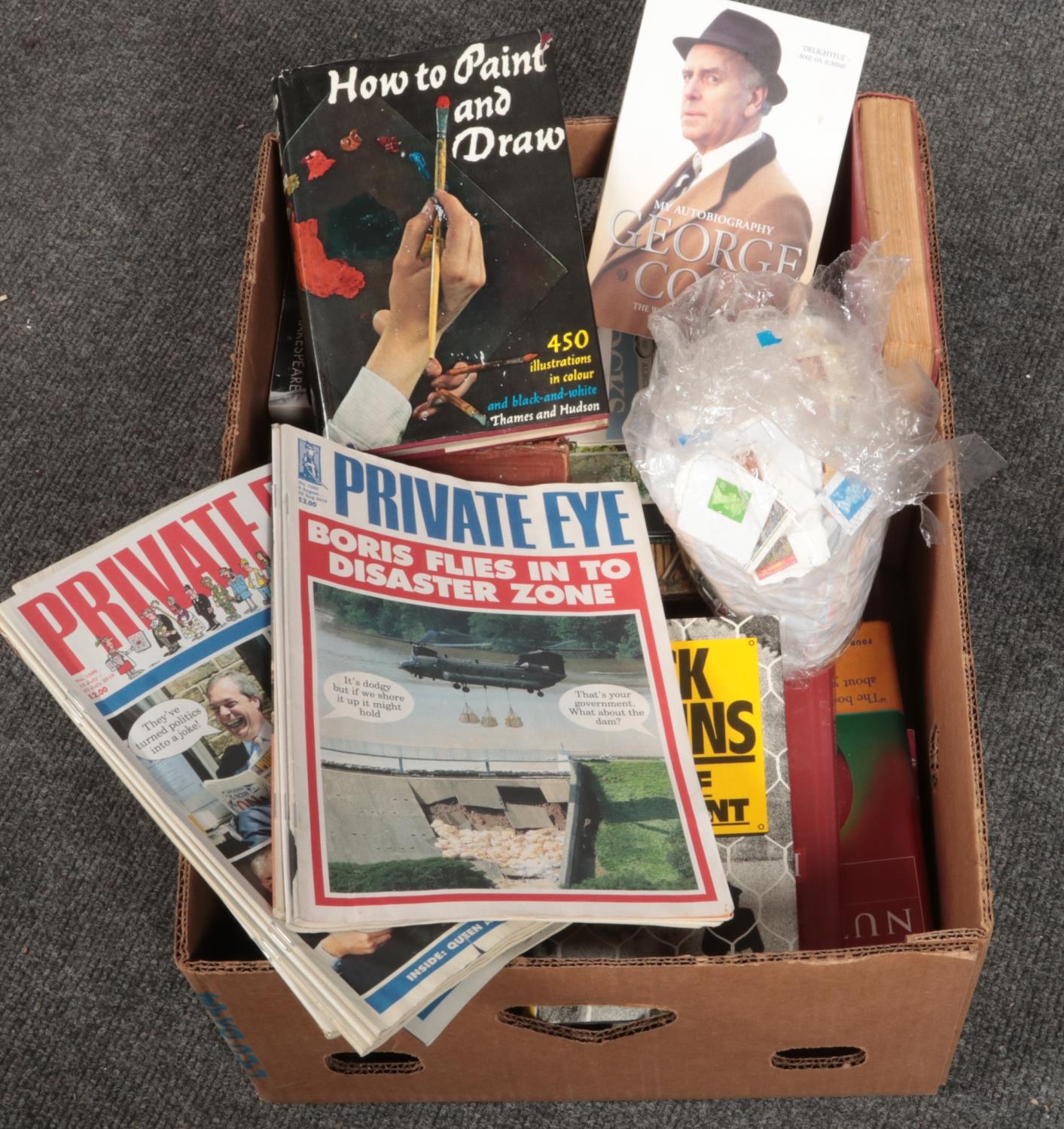 A box of books, Jack Higgins Day of Judgment, George Cole, Private Eye magazines etc