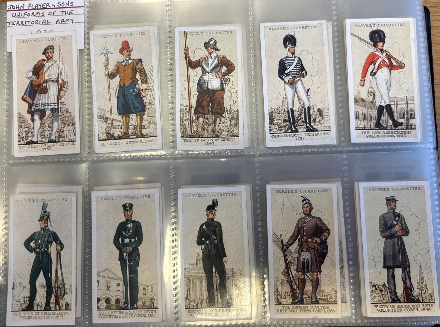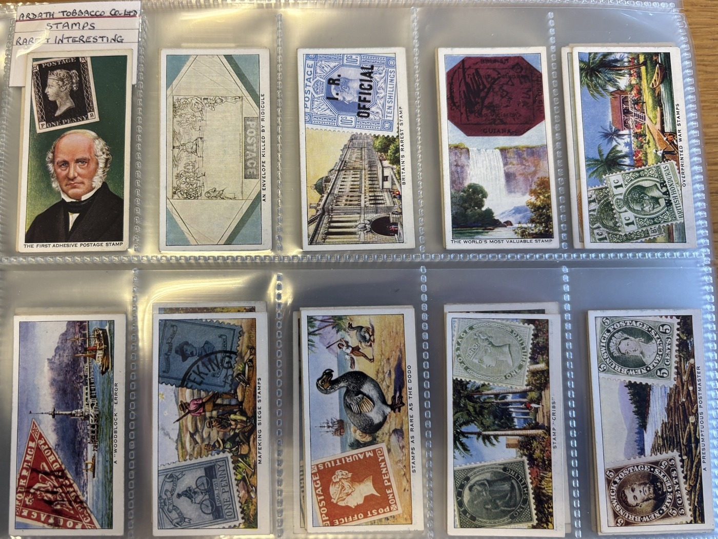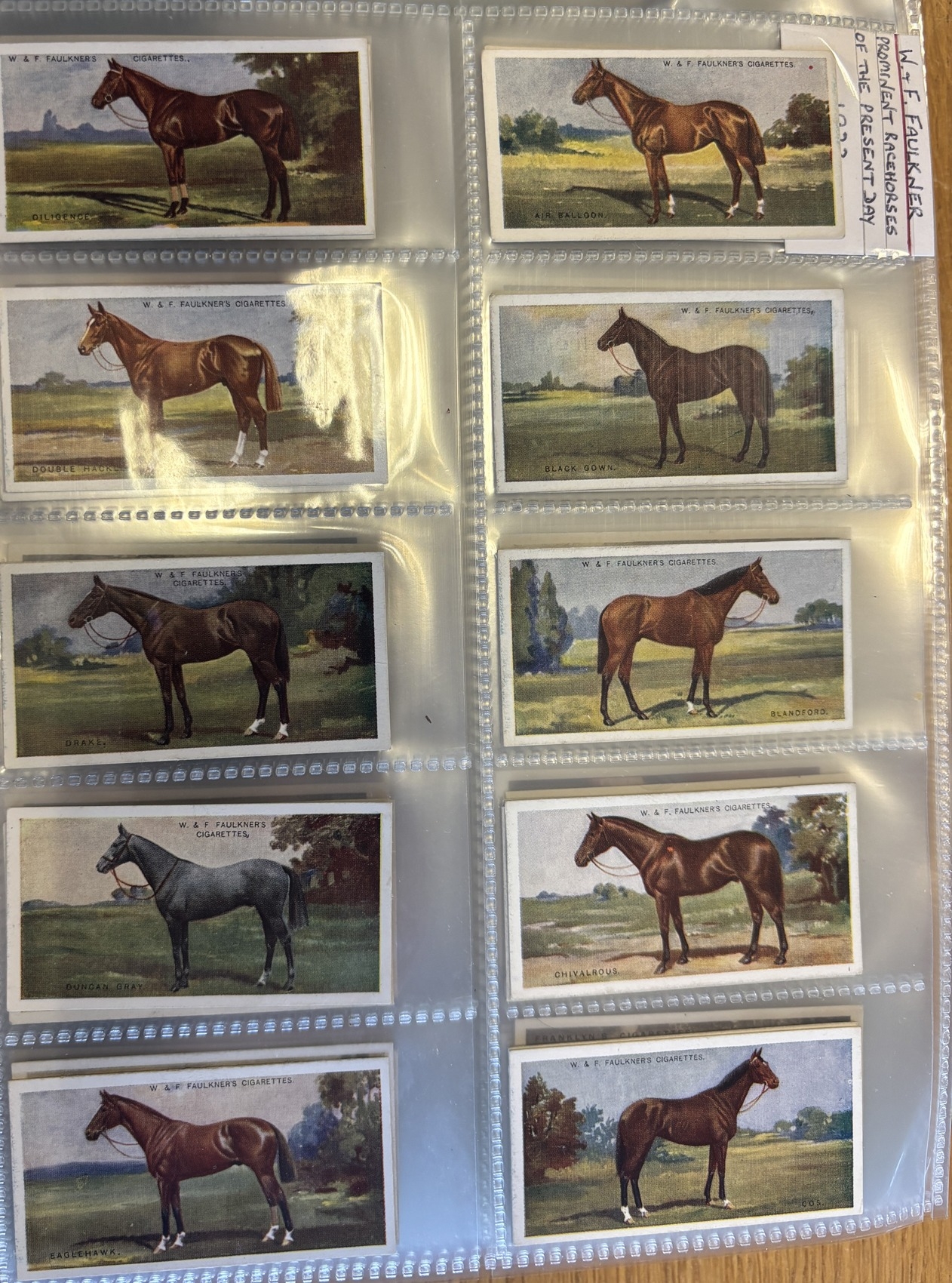 Collection in 4 albums of complete sets, generally very good, including ranges of Ardath with Stamps Rare and Interesting, Faulkner with Prominent Racehorses of the Present Day, Hignett Bros with Actors Natural & Character Studies, Kensitas silks, Players with Regimental Uniforms, Riders of the World and Uniforms of the Territorial Army. Qty. approx 2000+. (B)