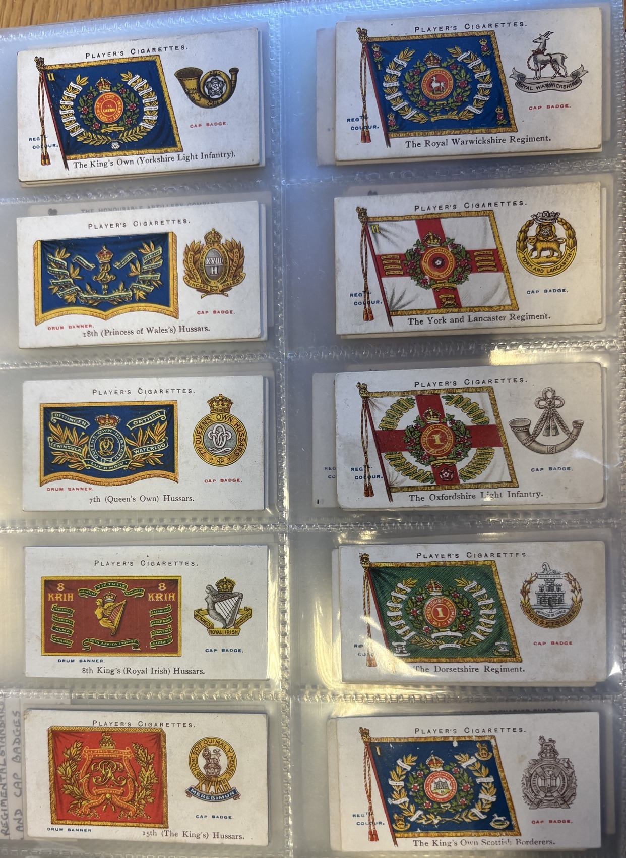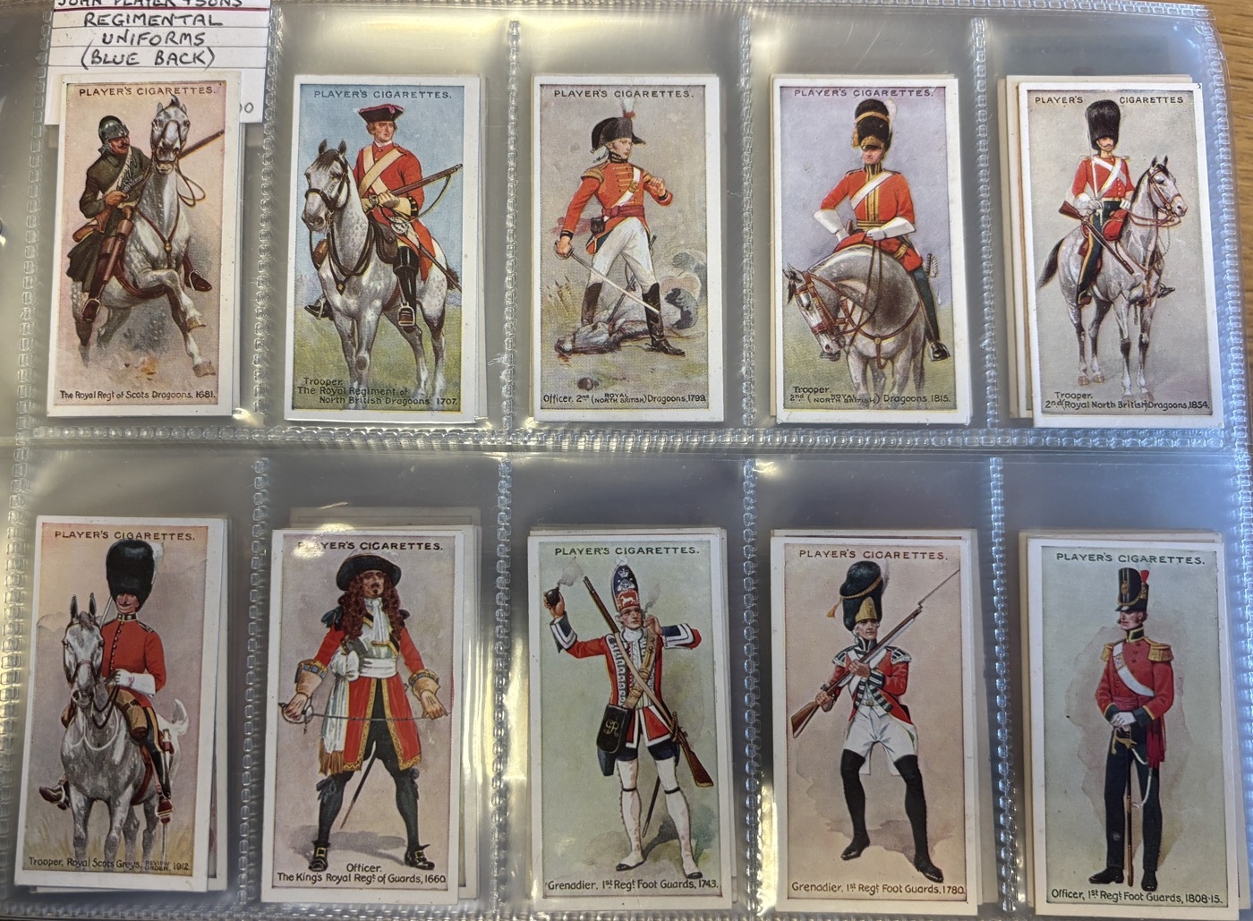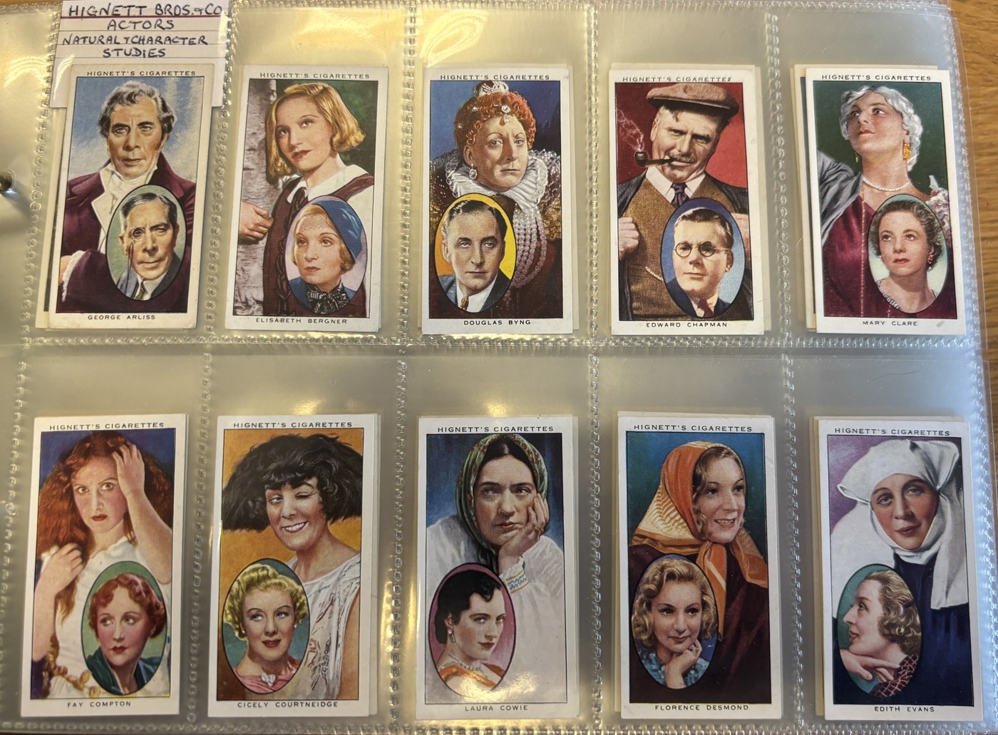 Collection in 4 albums of complete sets, generally very good, including ranges of Ardath with Stamps Rare and Interesting, Faulkner with Prominent Racehorses of the Present Day, Hignett Bros with Actors Natural & Character Studies, Kensitas silks, Players with Regimental Uniforms, Riders of the World and Uniforms of the Territorial Army. Qty. approx 2000+. (B)