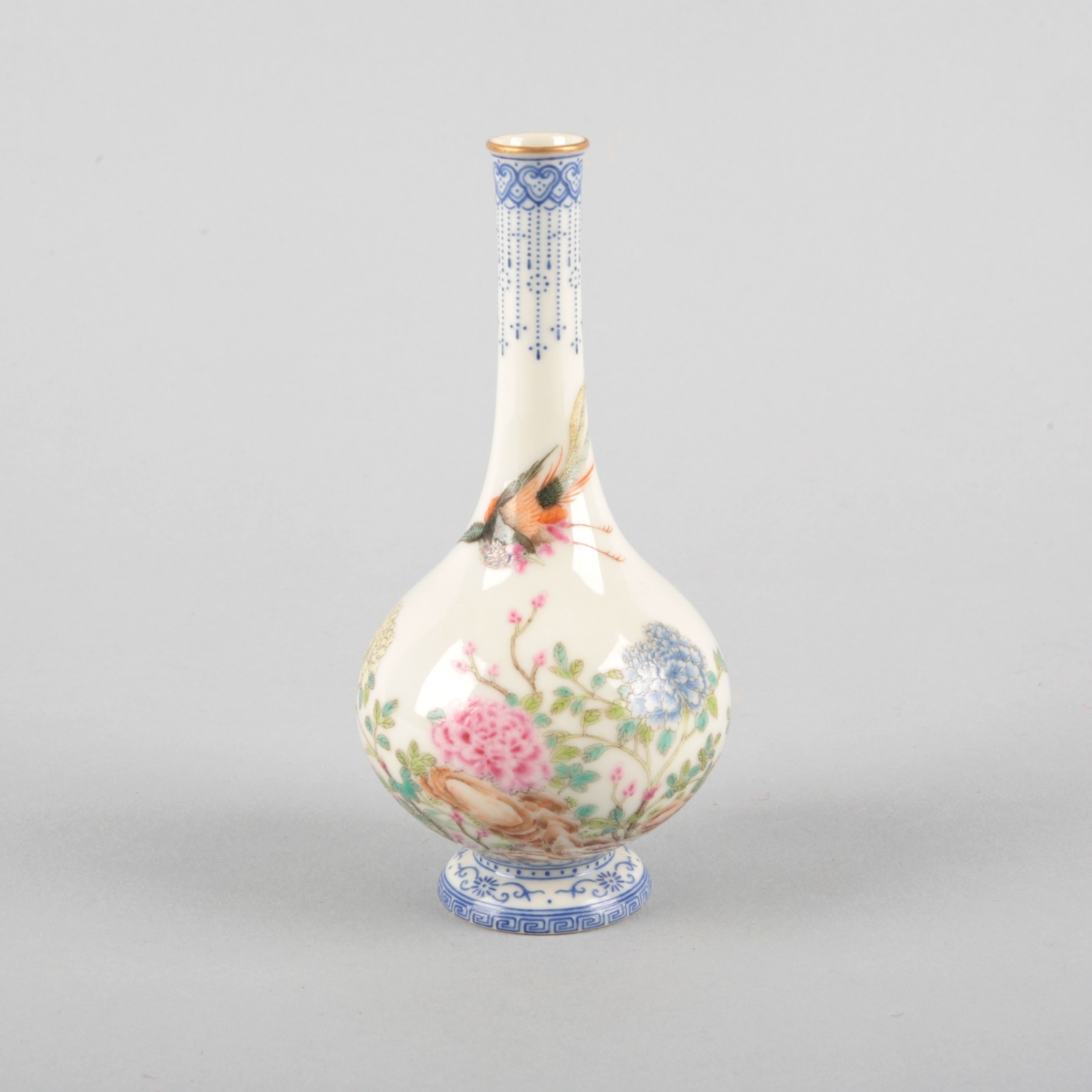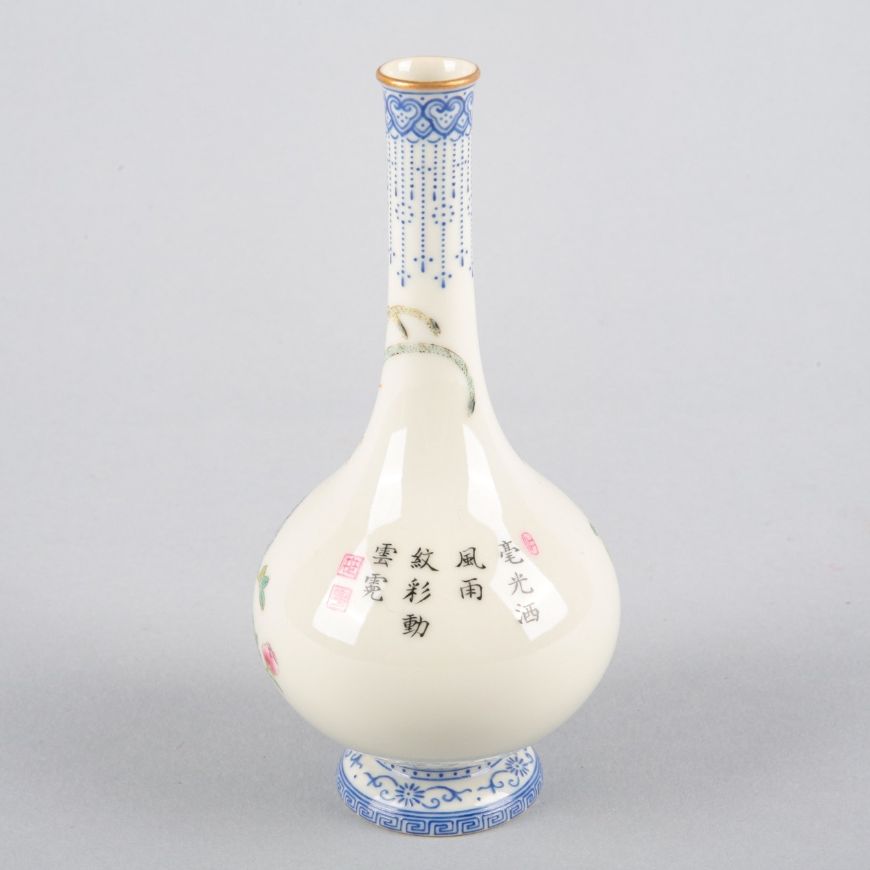 A SMALL CHINESE PORCELAIN FAMILLE ROSE BOTTLE VASE