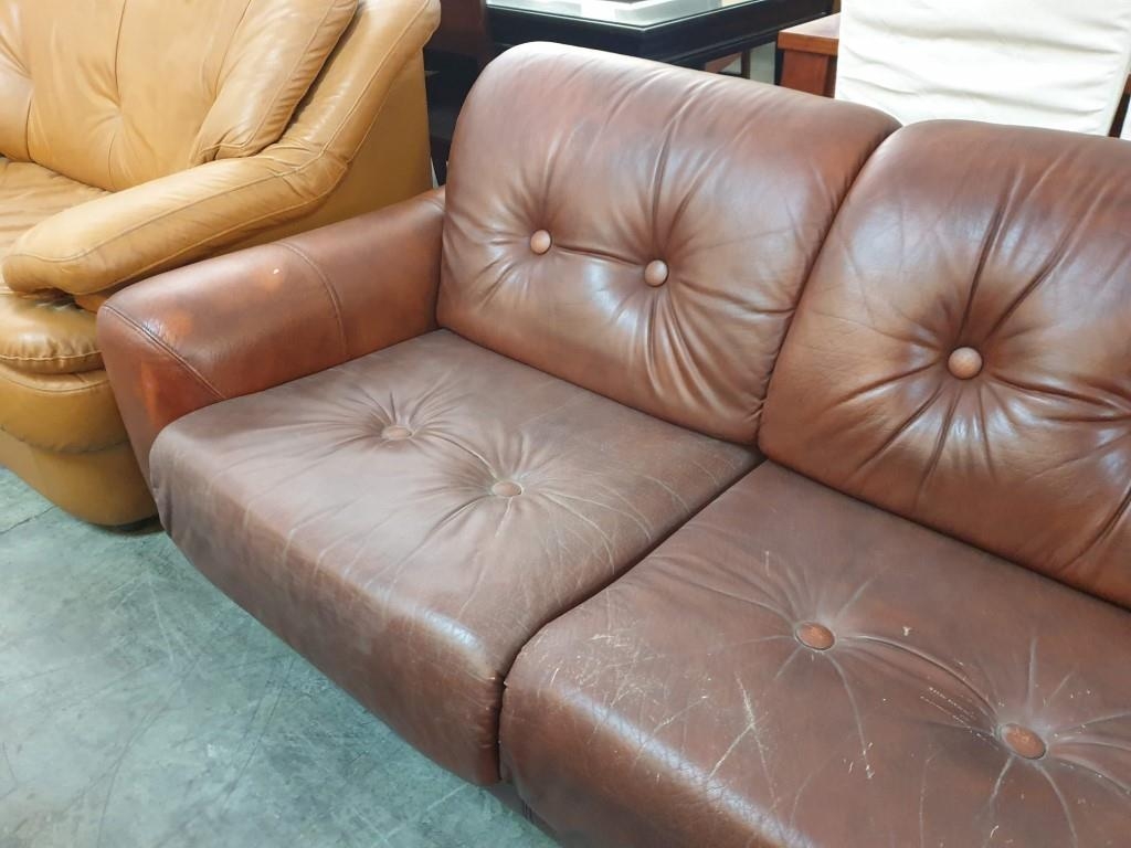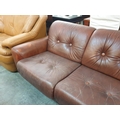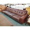 Large 4-Seater Brown Leather Sofa with Button Back on Casters (Approx. 300cm x 100cm)