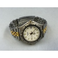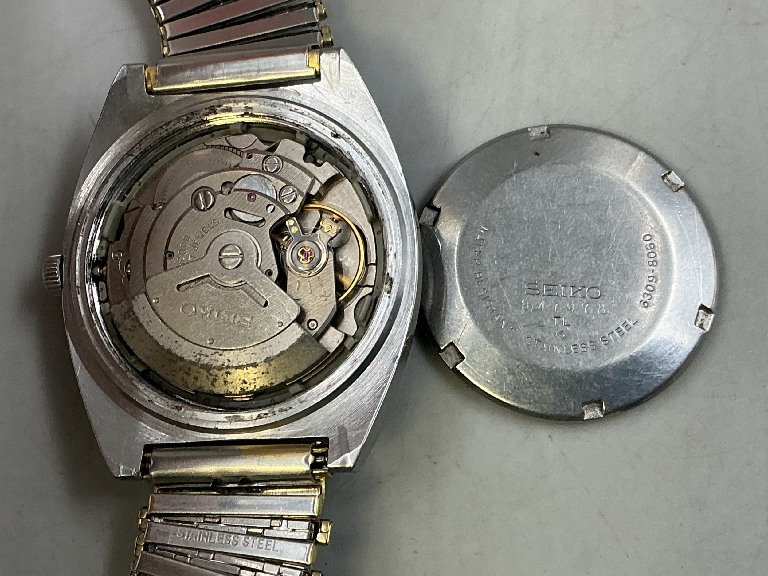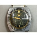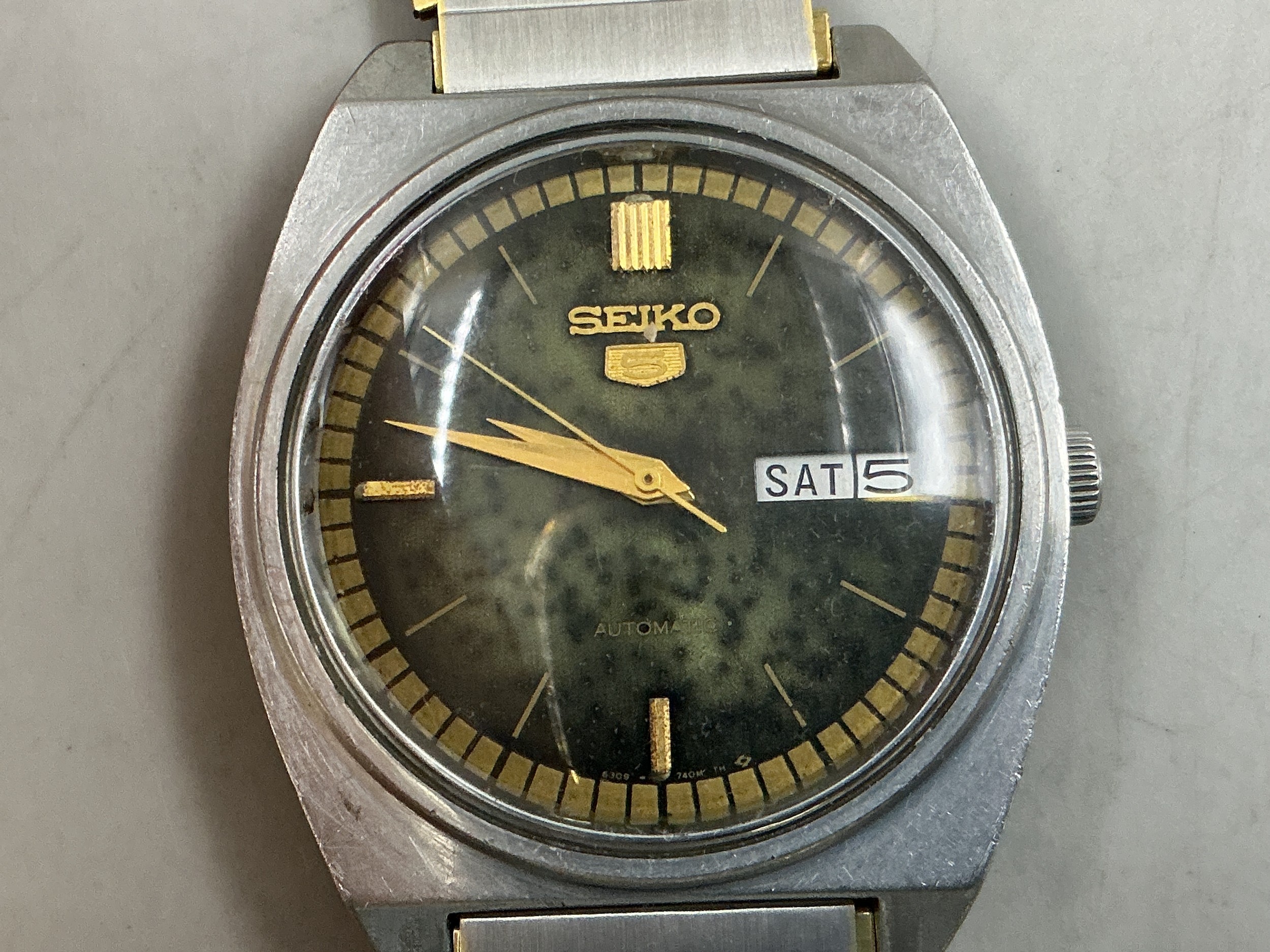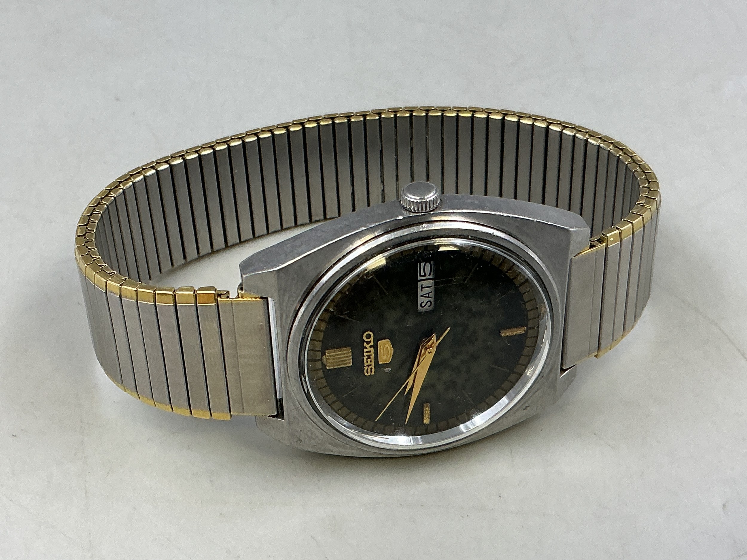 A Vintage Seiko 5 Gents 17 Jewels Automatic Day/Date Watch - Green Dial, Stainless Steel Case, And Gold/Silver Tone Adjustable Strap. Working