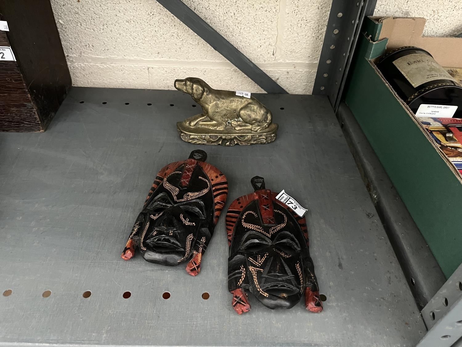 Brass fire side dog and a pair of Kenyan tribal masks