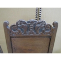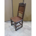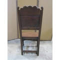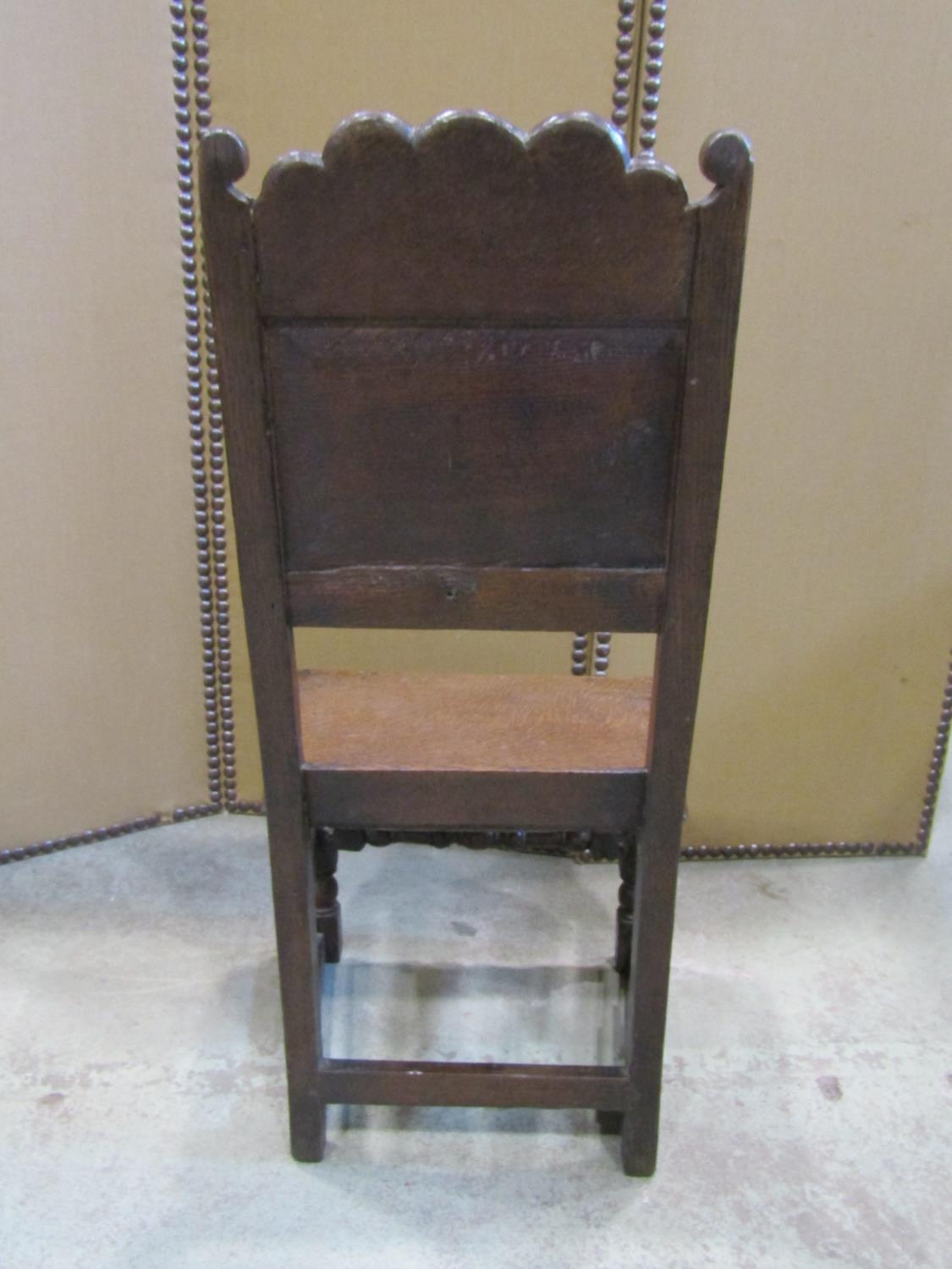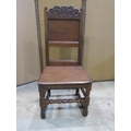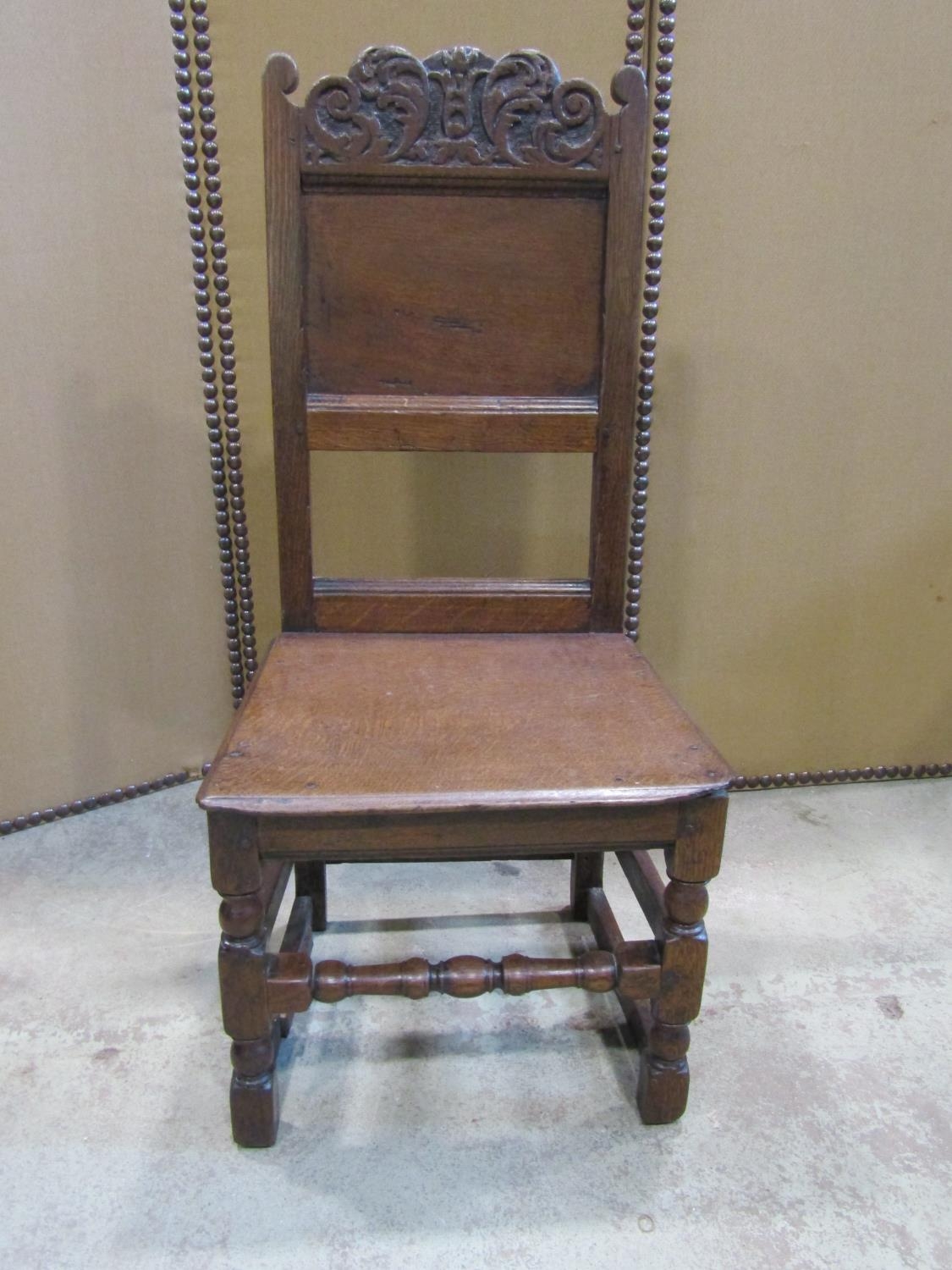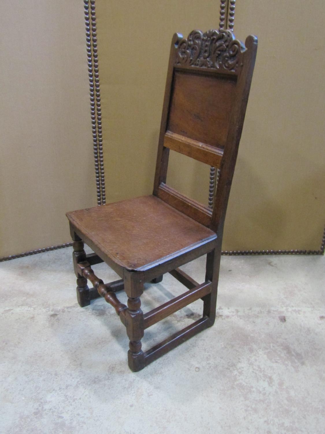 18th century oak side chair with panelled seat and back, the back set beneath a carved cresting rail on turned supports and rails