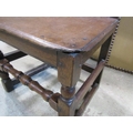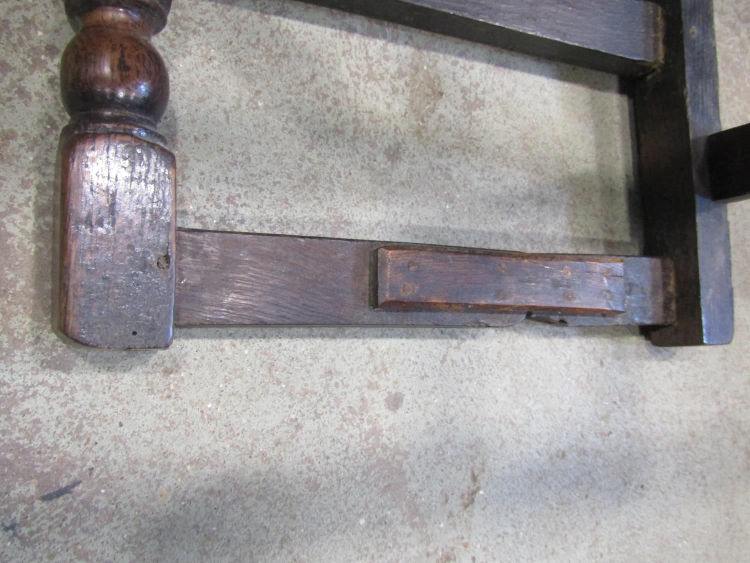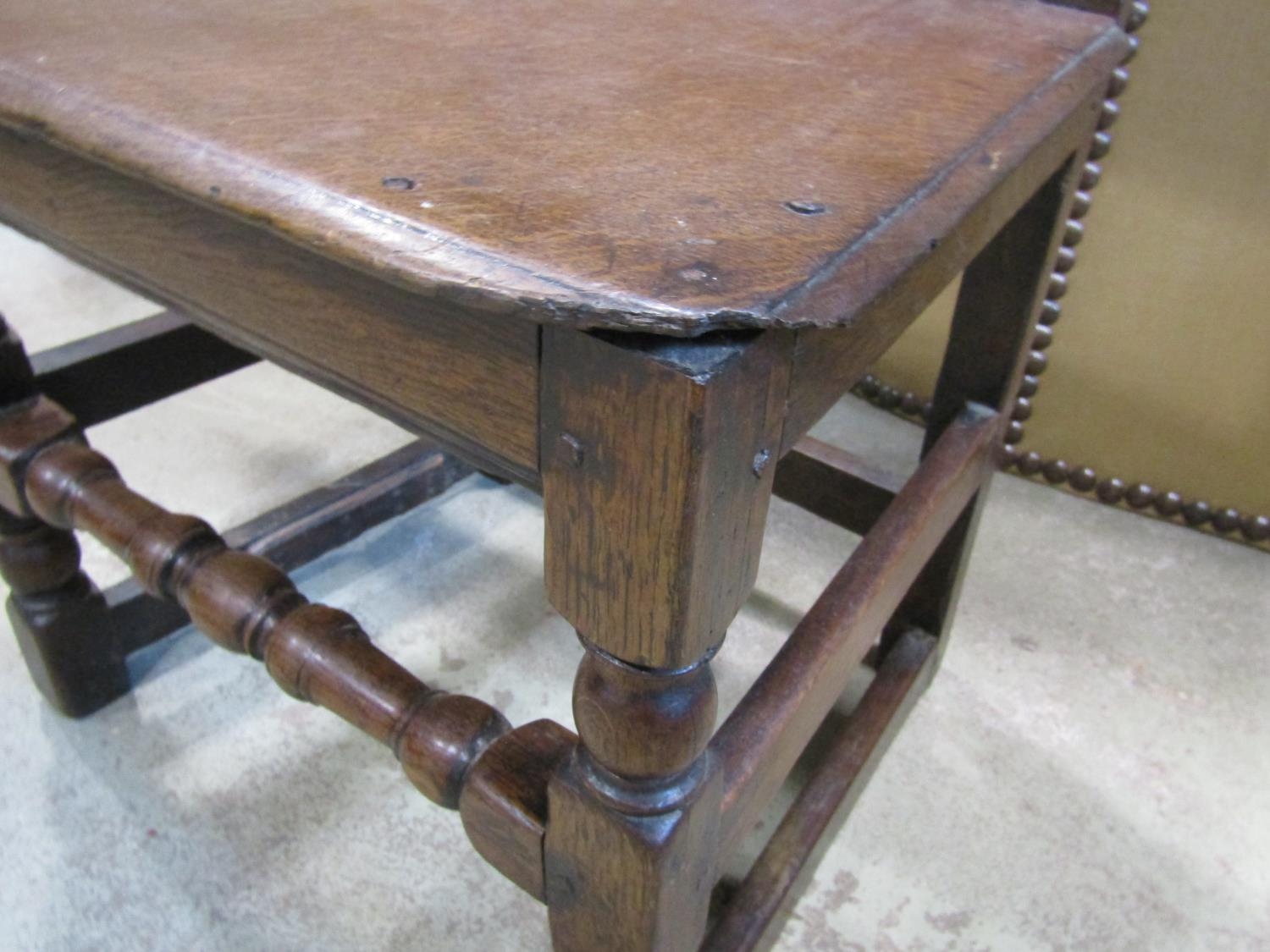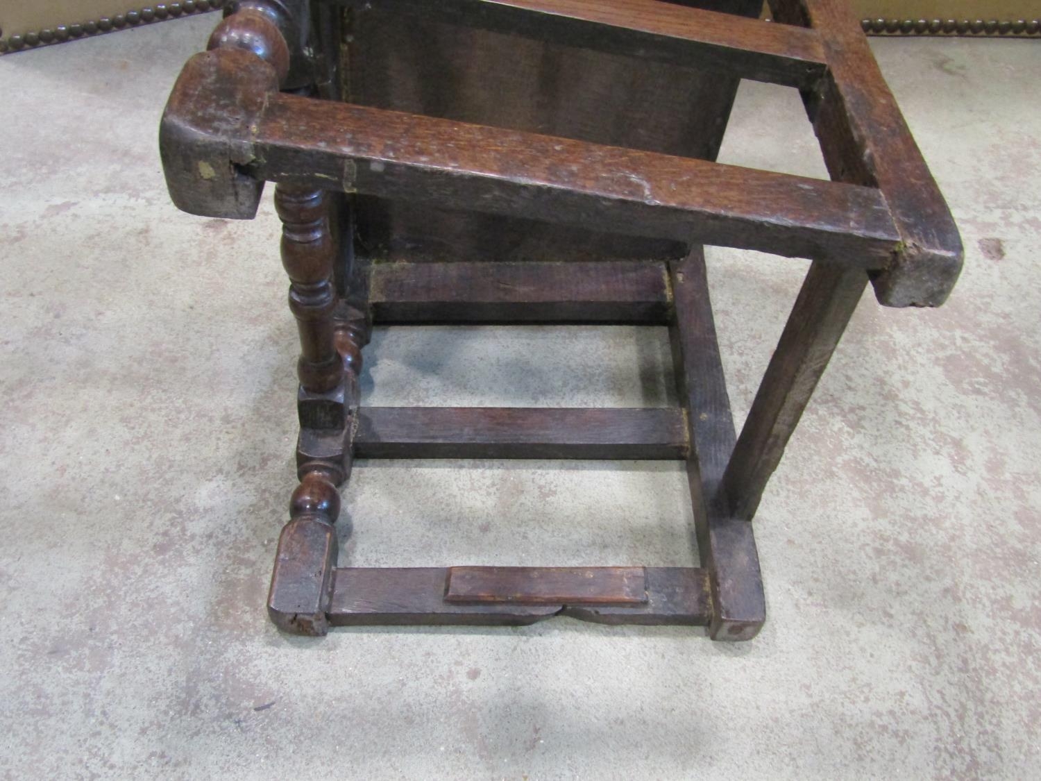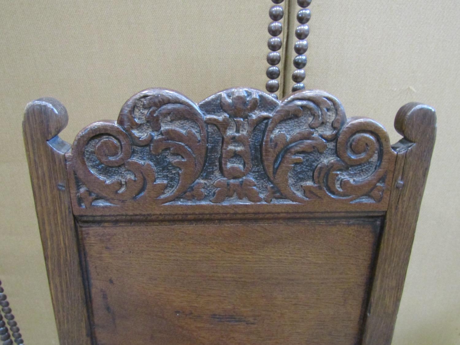18th century oak side chair with panelled seat and back, the back set beneath a carved cresting rail on turned supports and rails