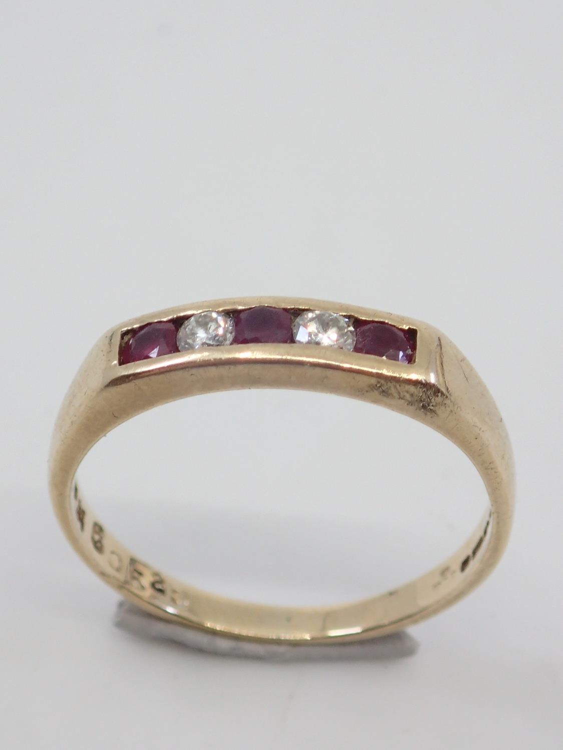 A diamond & ruby set five stone ring, set in 9ct gold finger size N Half approx.