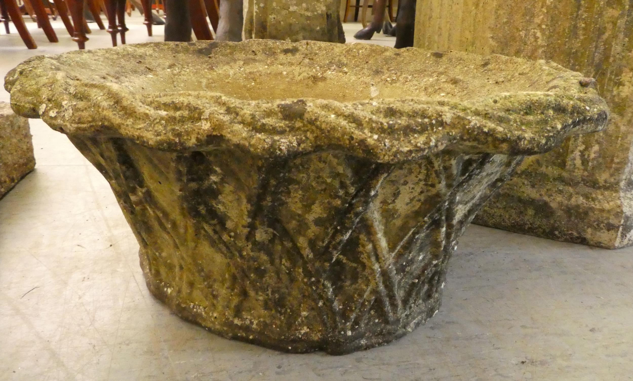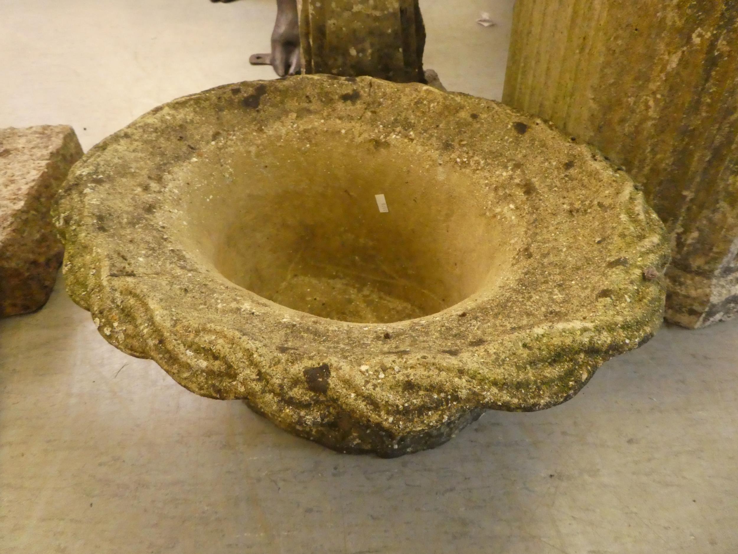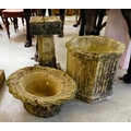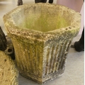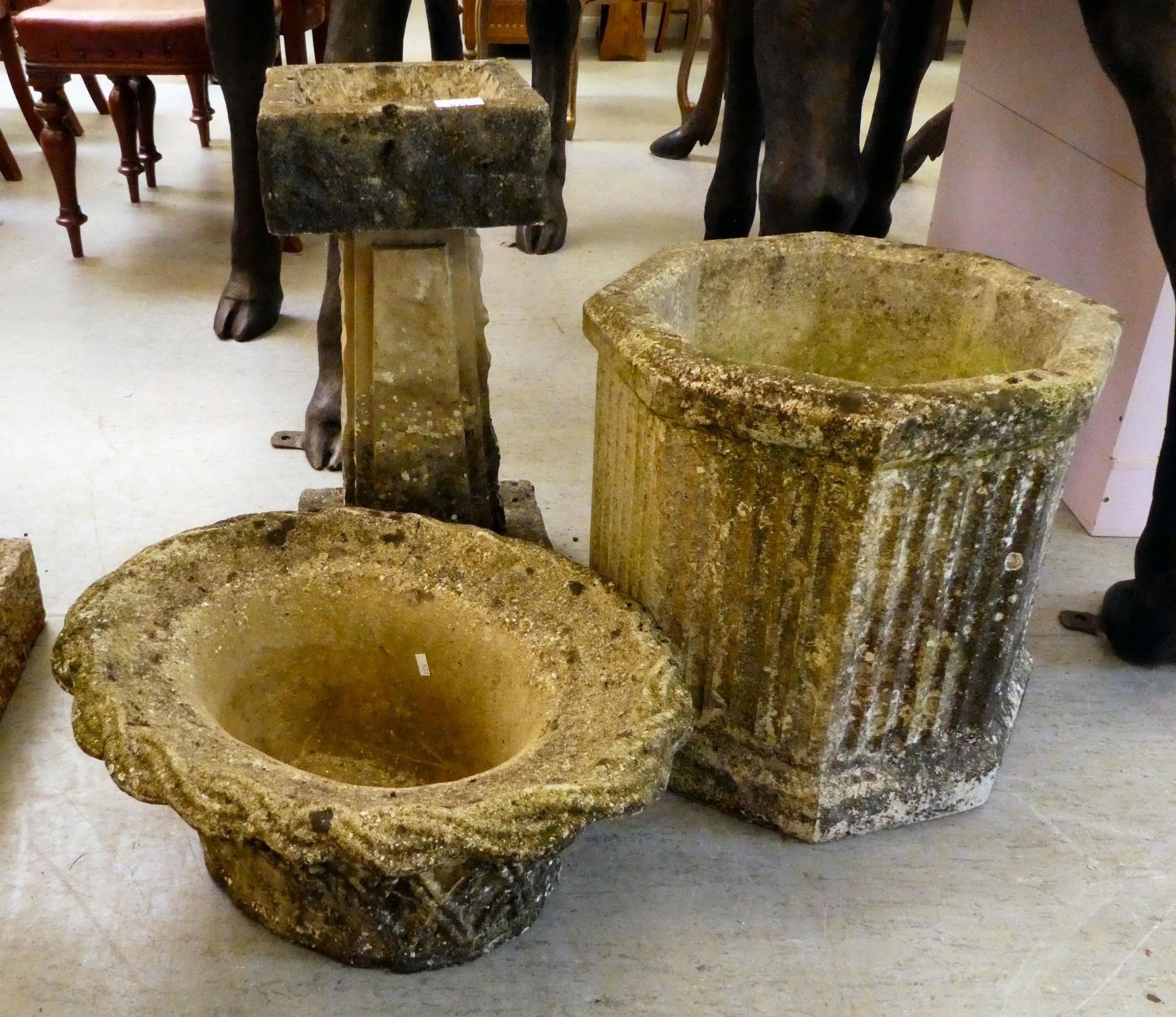 Weathered composition stone, viz. a bird table 21"h; an oval basket type planter 19"w; and one octagonal 15"h