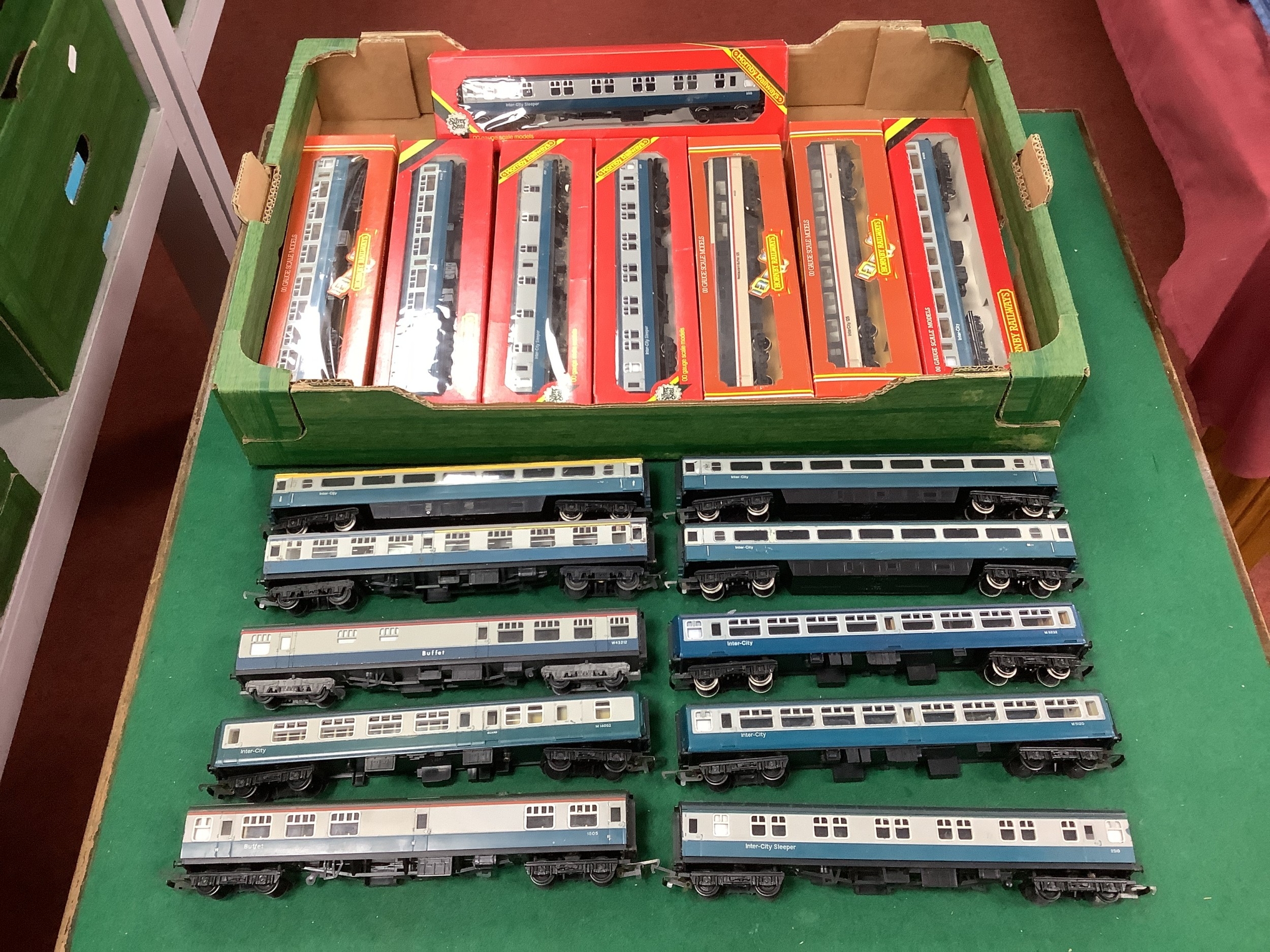 Eighteen 00 gauge Mk1 and Mk2 blue-grey coaches by Hornby and others (eight boxed) including sleeping cars, playworn.