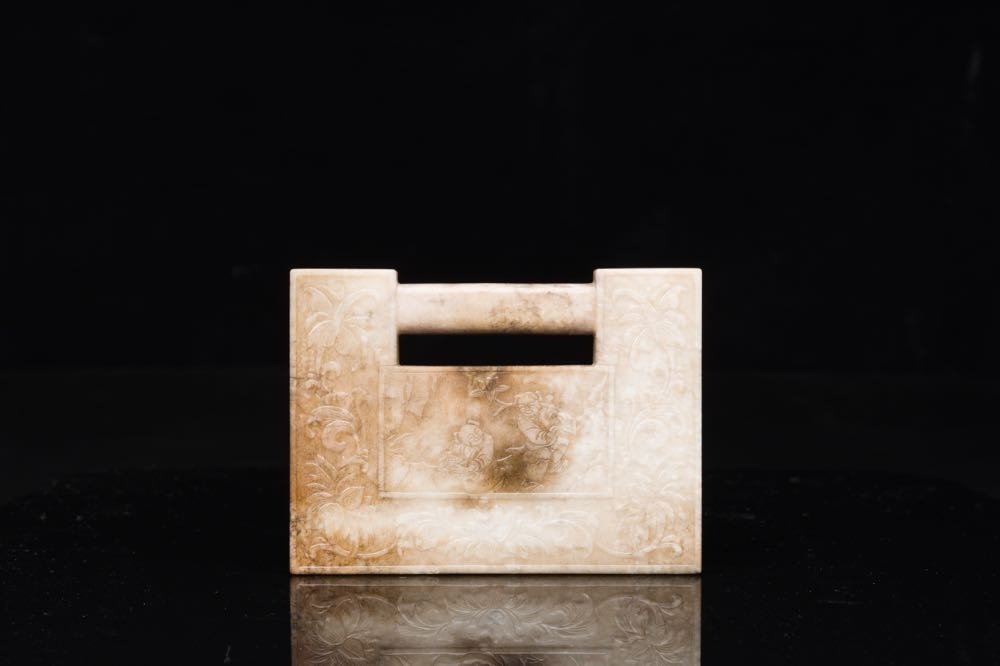 A Chinese white and russet jade lock-shaped plaque with inscription 'Huan Tian Xi Di', Qing