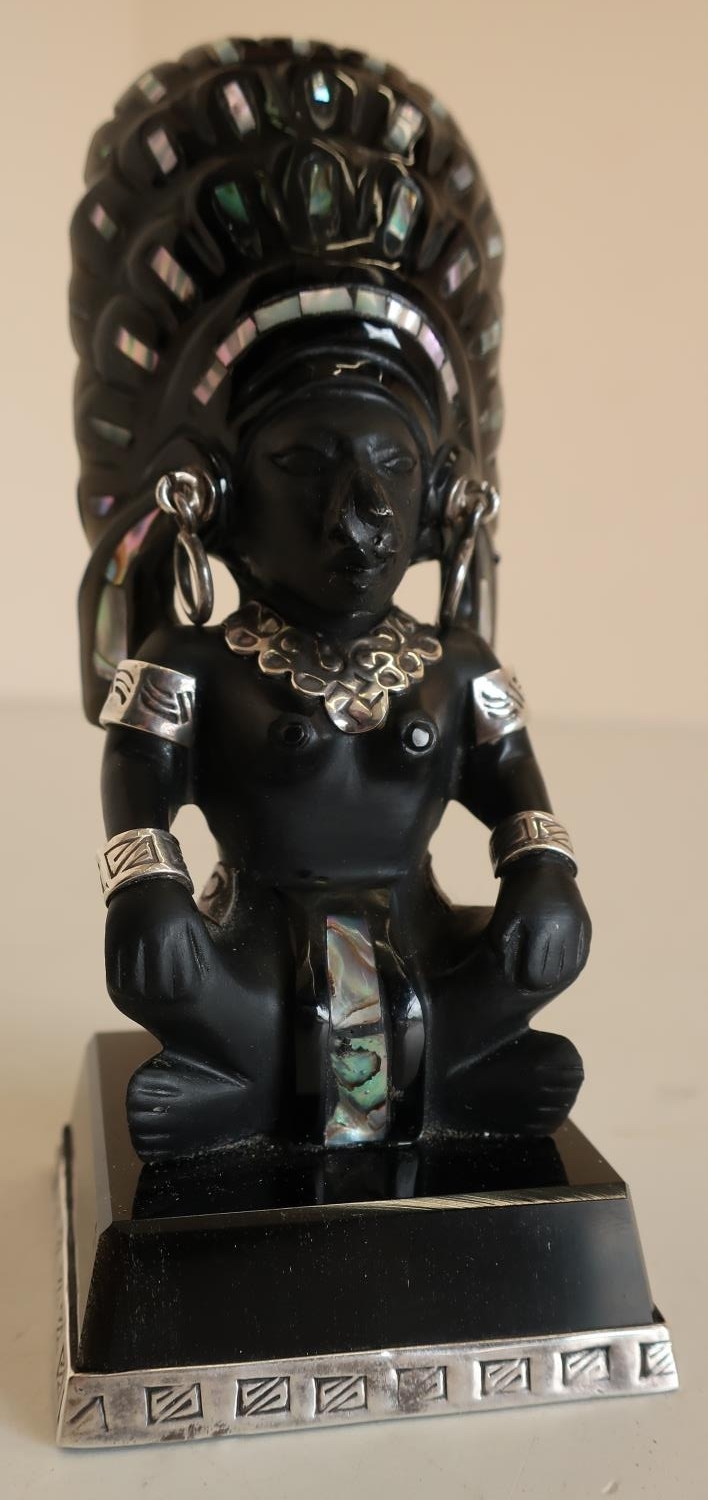 Carved obsidian Mexican Taxco Aztec figurine inlaid with silver and Mother of Pearl (height 12cm)